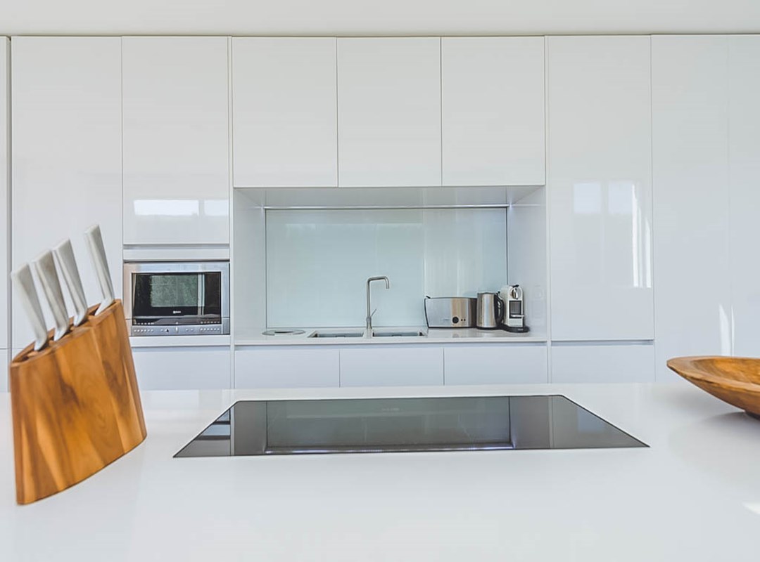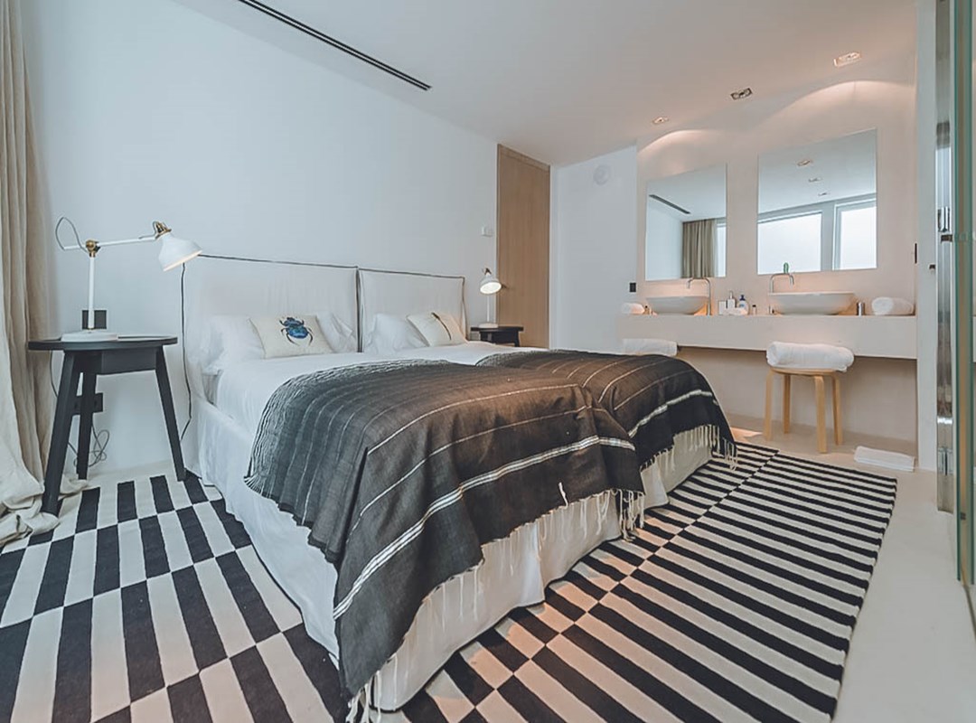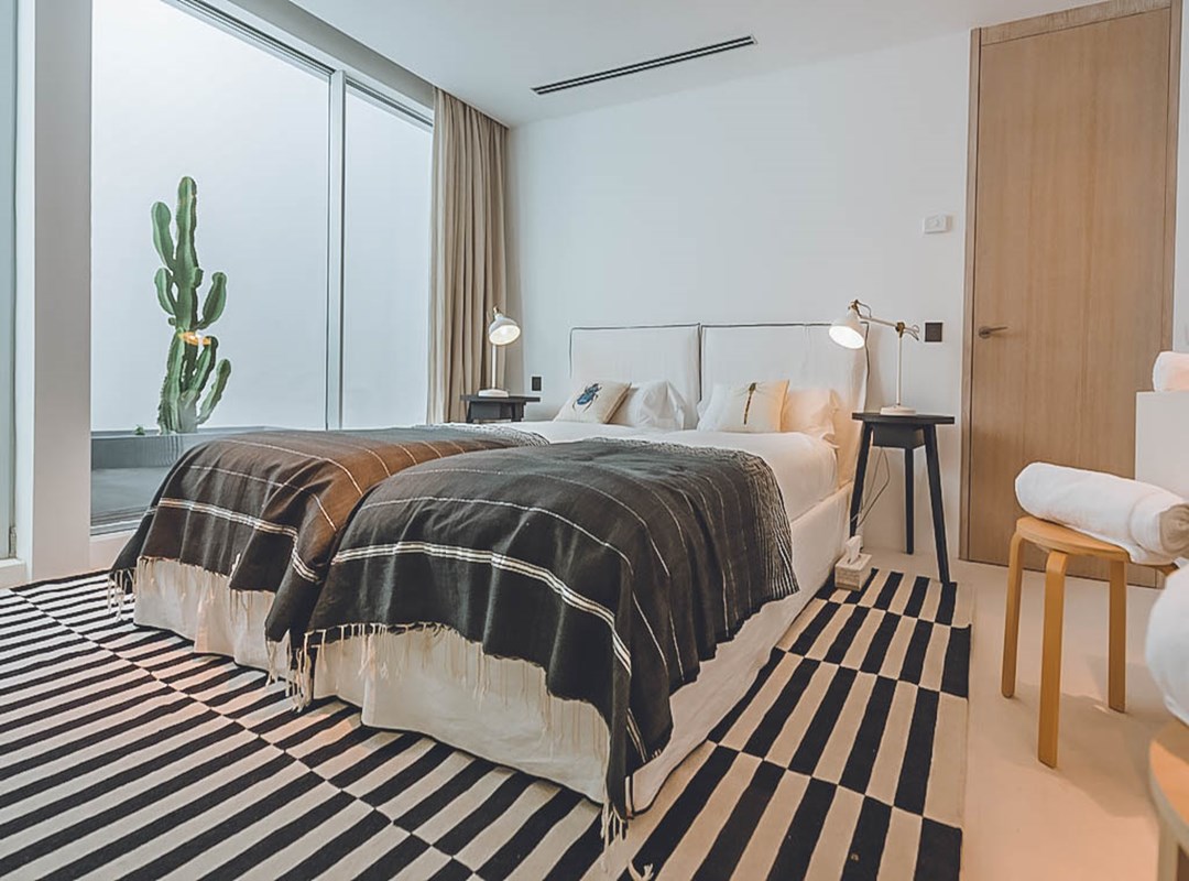 All five en-suite bedrooms provide modern comfort: the master suite has a king bed, bespoke wardrobe, private safe, air conditioning, spa-inspired bathroom with dual vanity, rain shower, and freestanding bathtub, plus a private sea-view terrace. Two additional king suites and two twin rooms (convertible to kings) each have designer en-suites and terrace/garden access.