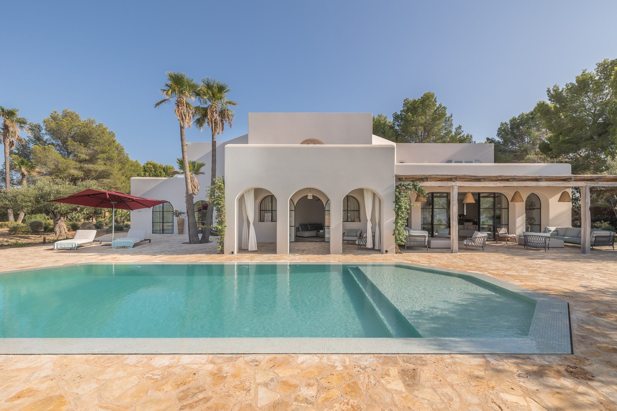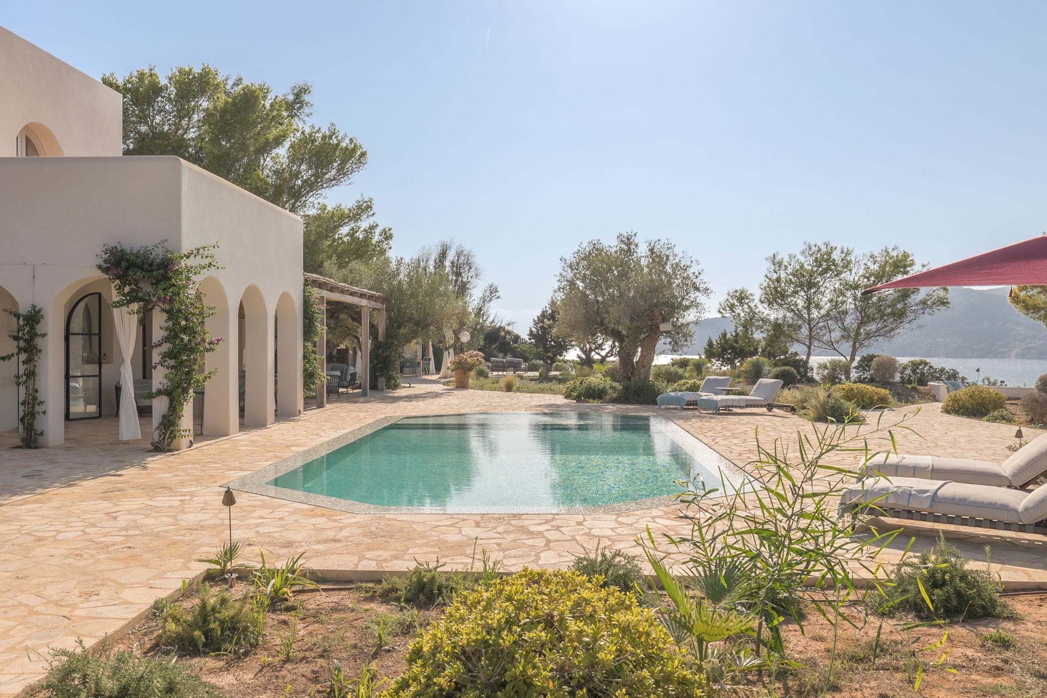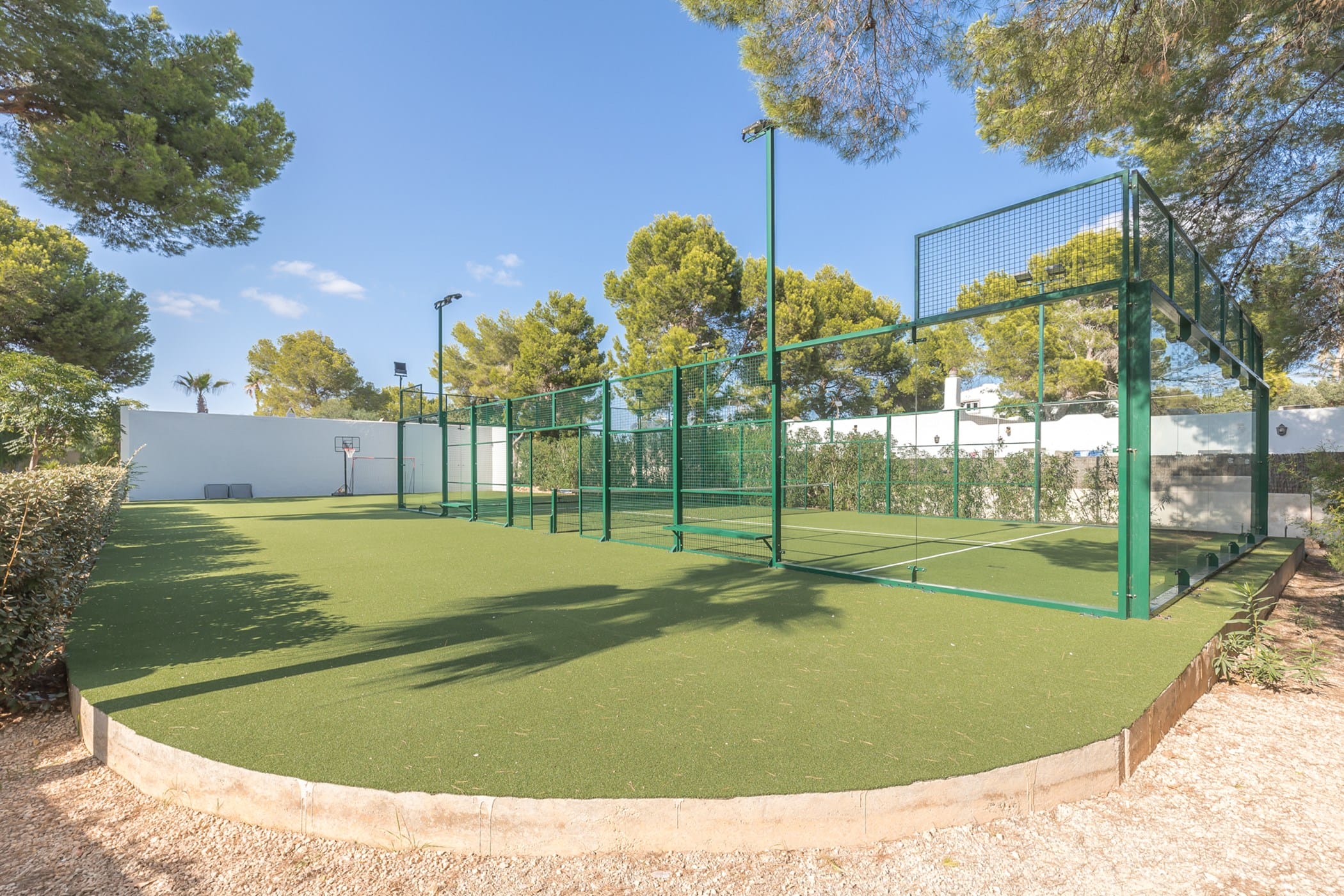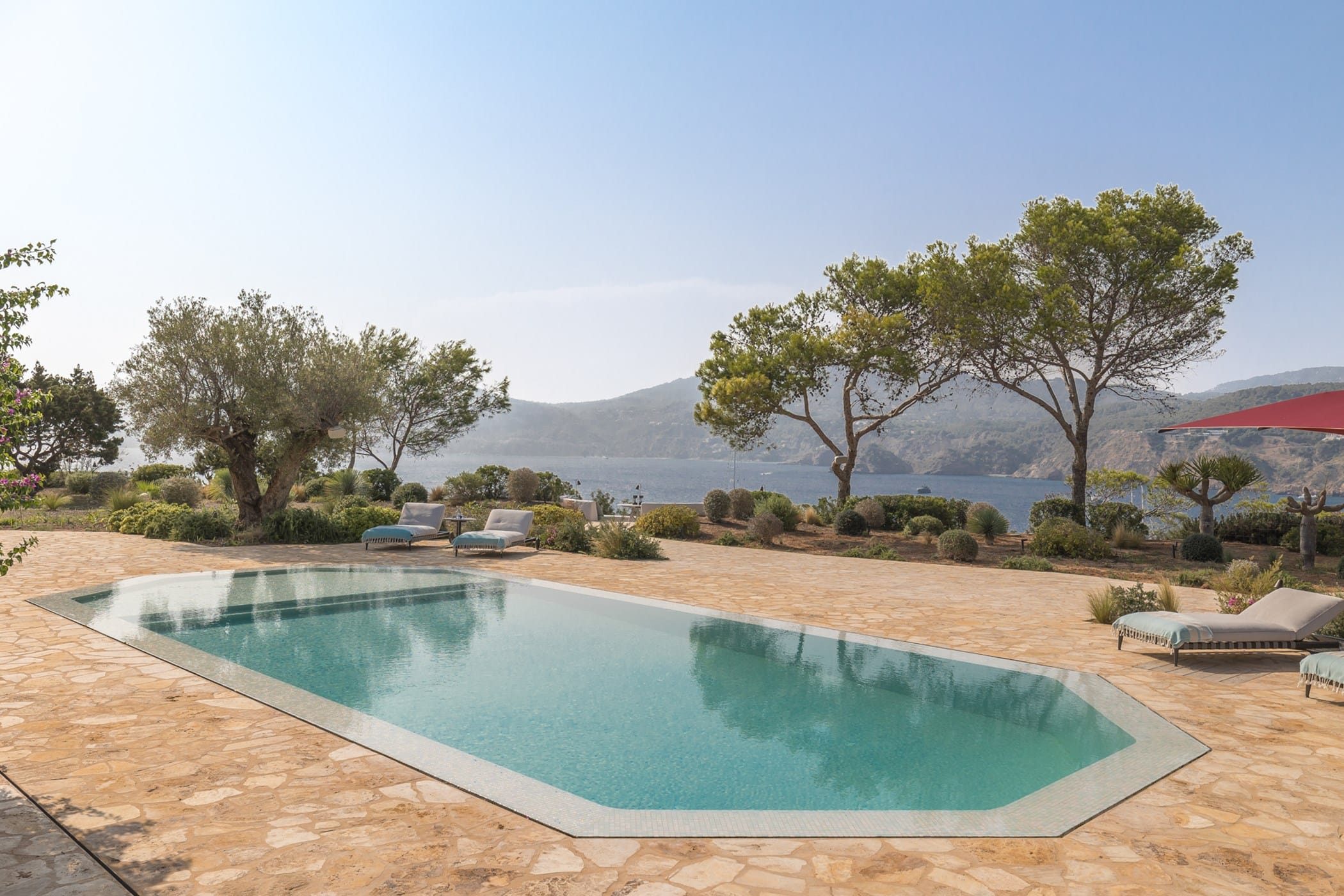 Outdoor living is a highlight, with a saltwater pool overlooking the sea, landscaped gardens, and multiple spaces for dining and entertaining. Guests can enjoy a barbecue area, sports facilities such as a paddle court and multi-use court, and unique private sea access via a path leading to a traditional fishing hut and docking point. Combining luxury amenities with breathtaking surroundings, it offers an exceptional setting for a memorable Ibiza getaway.