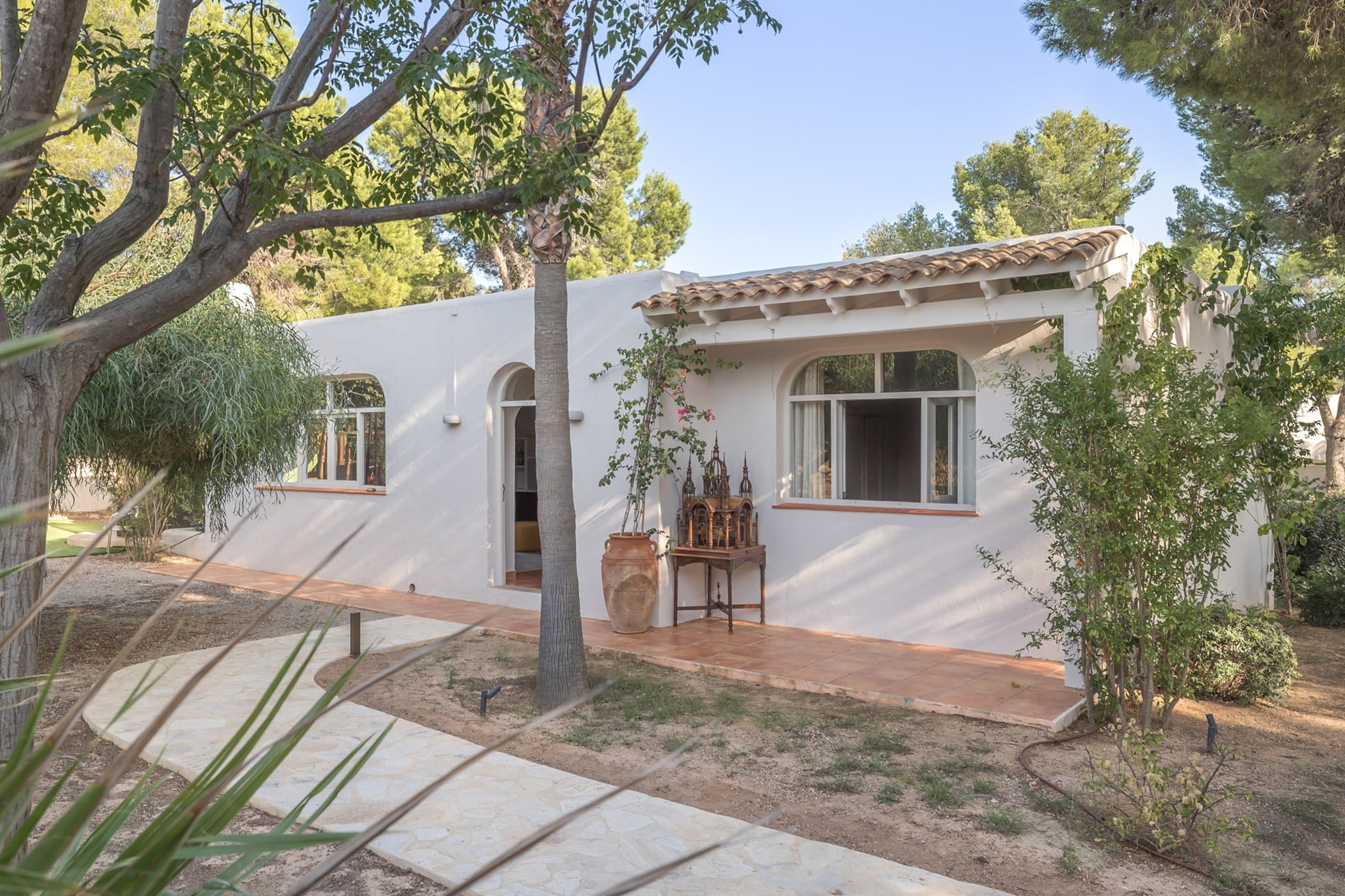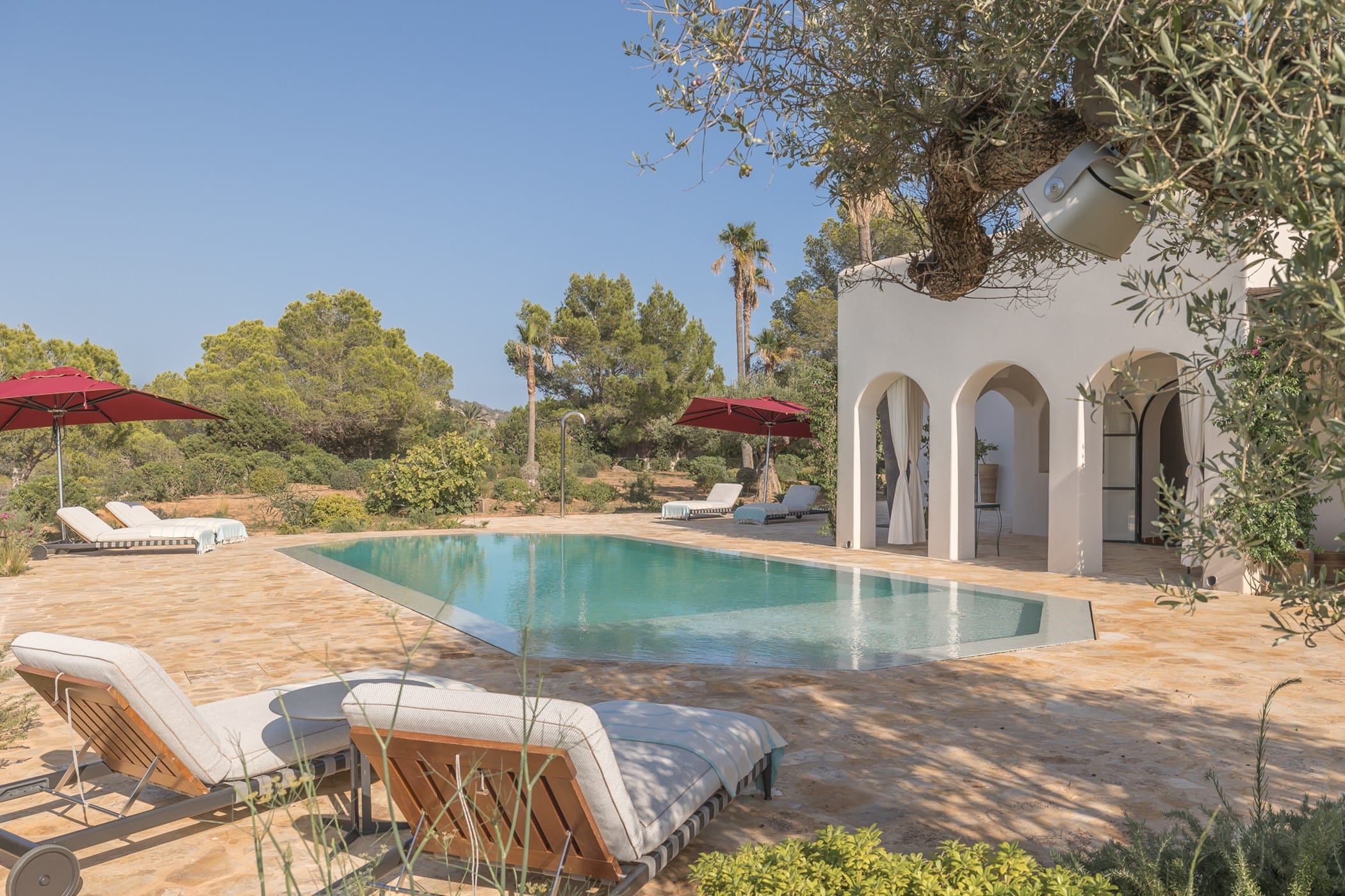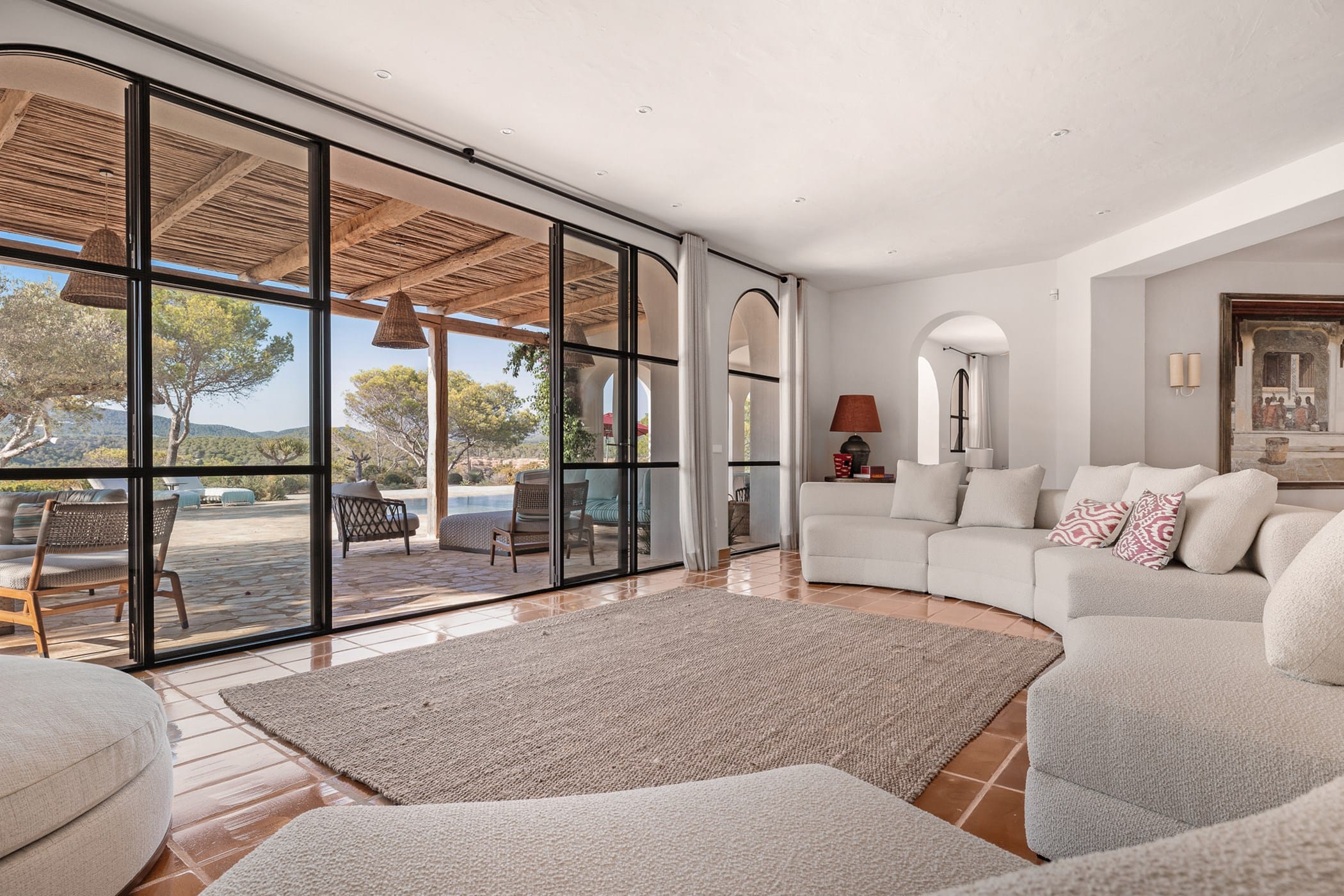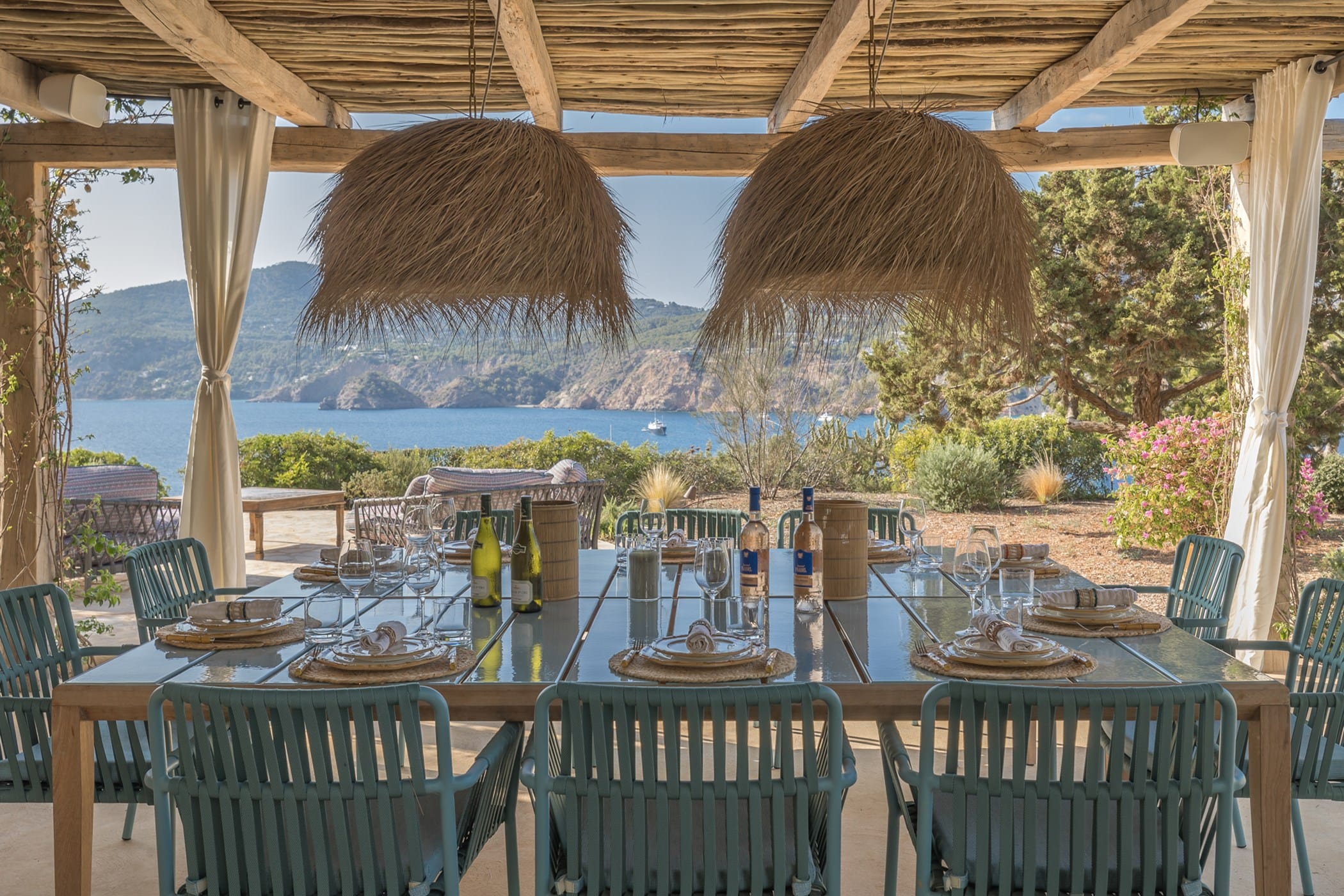 Outdoor living is a highlight, with a saltwater pool overlooking the sea, landscaped gardens, and multiple spaces for dining and entertaining. Guests can enjoy a barbecue area, sports facilities such as a paddle court and multi-use court, and unique private sea access via a path leading to a traditional fishing hut and docking point. Combining luxury amenities with breathtaking surroundings, it offers an exceptional setting for a memorable Ibiza getaway.