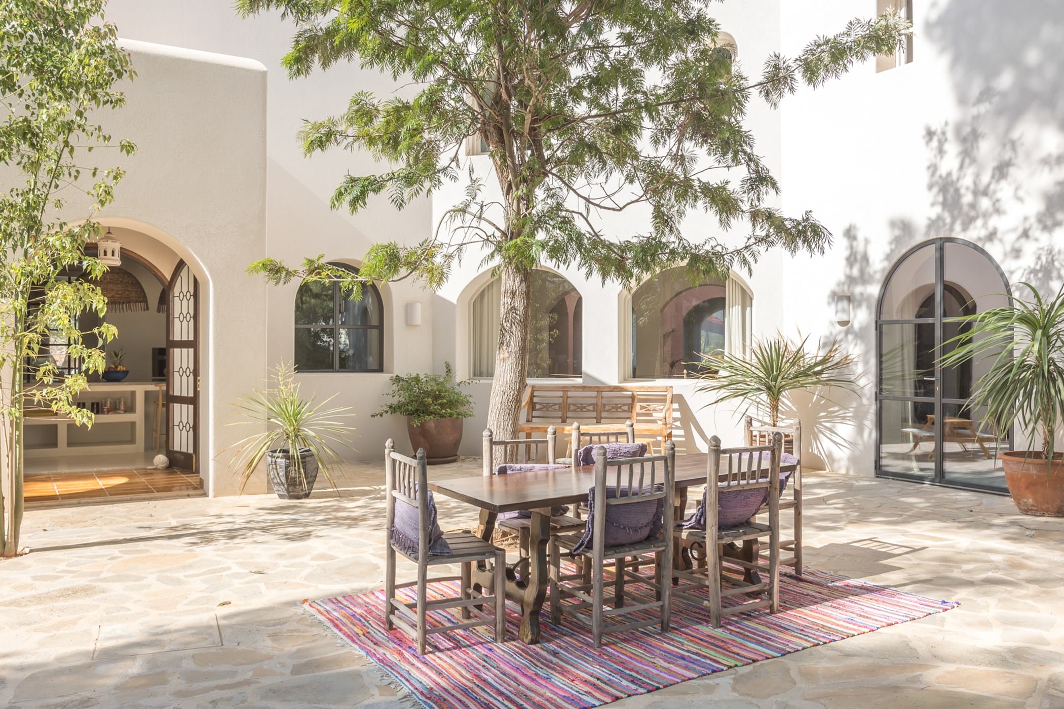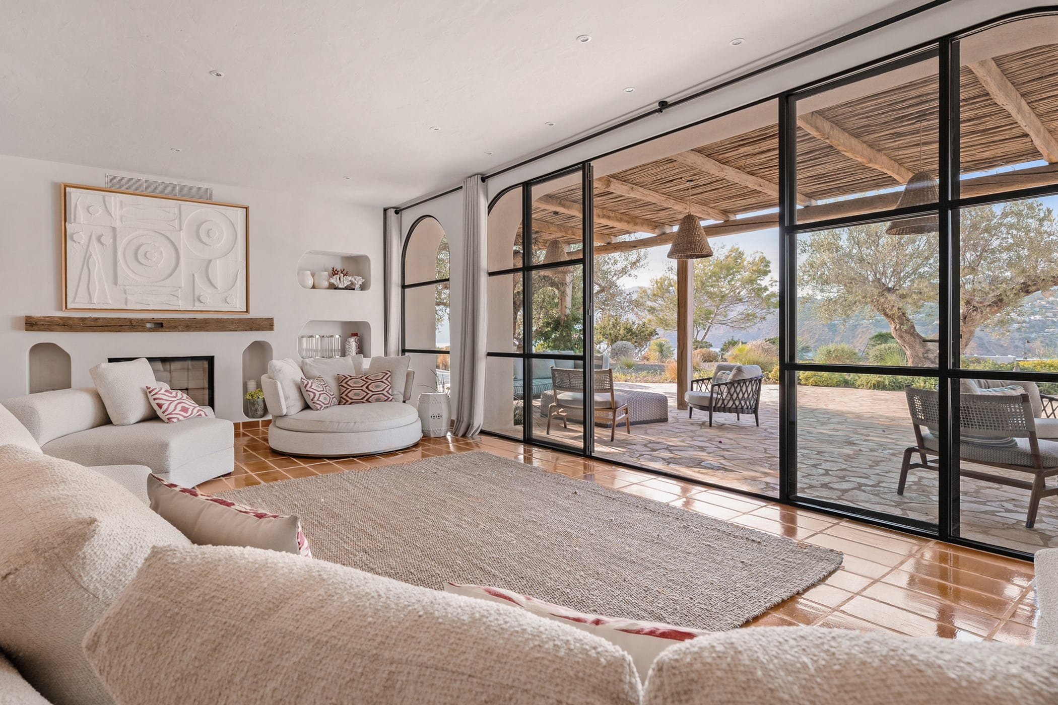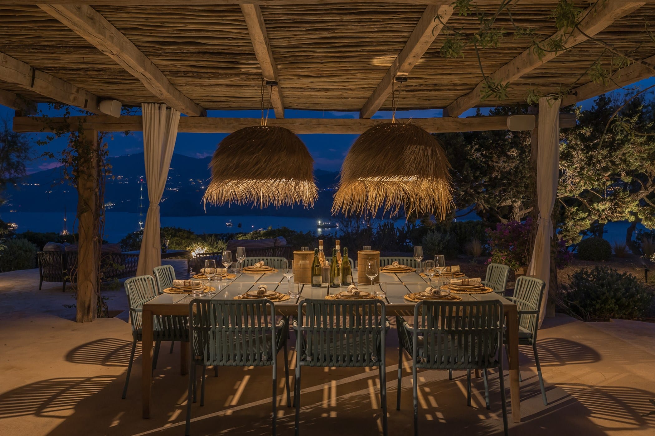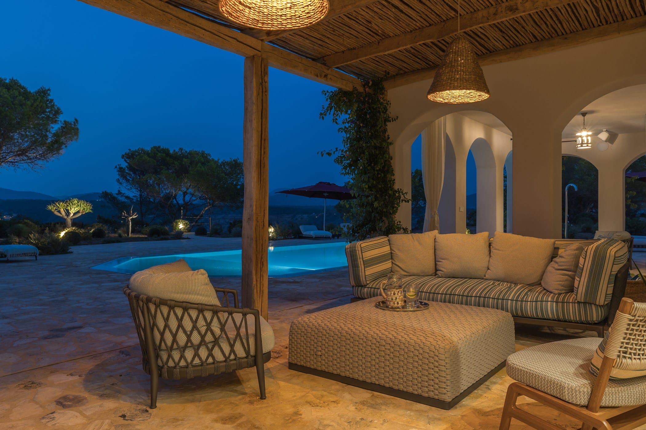 Outdoor living is a highlight, with a saltwater pool overlooking the sea, landscaped gardens, and multiple spaces for dining and entertaining. Guests can enjoy a barbecue area, sports facilities such as a paddle court and multi-use court, and unique private sea access via a path leading to a traditional fishing hut and docking point. Combining luxury amenities with breathtaking surroundings, it offers an exceptional setting for a memorable Ibiza getaway.