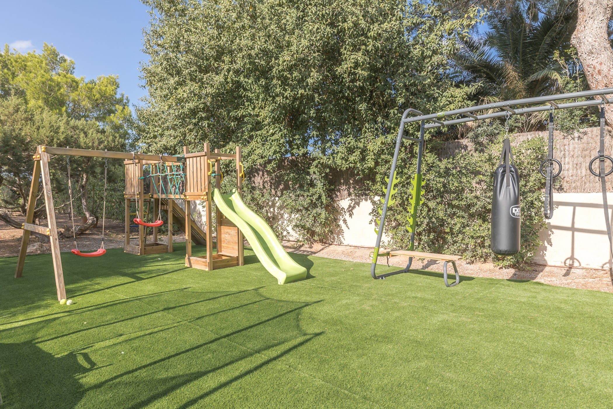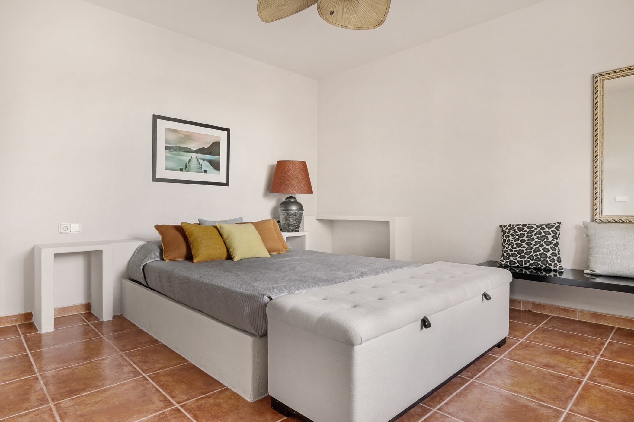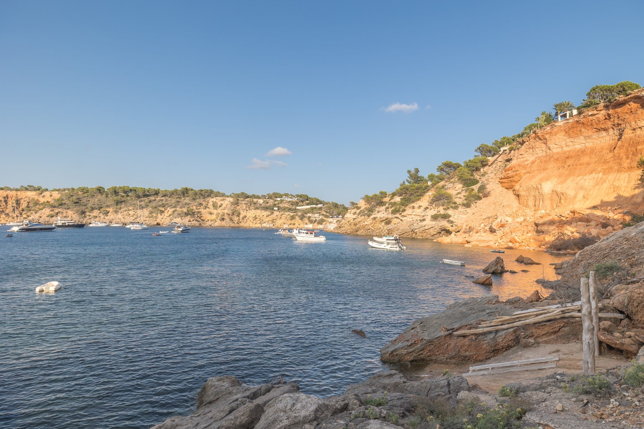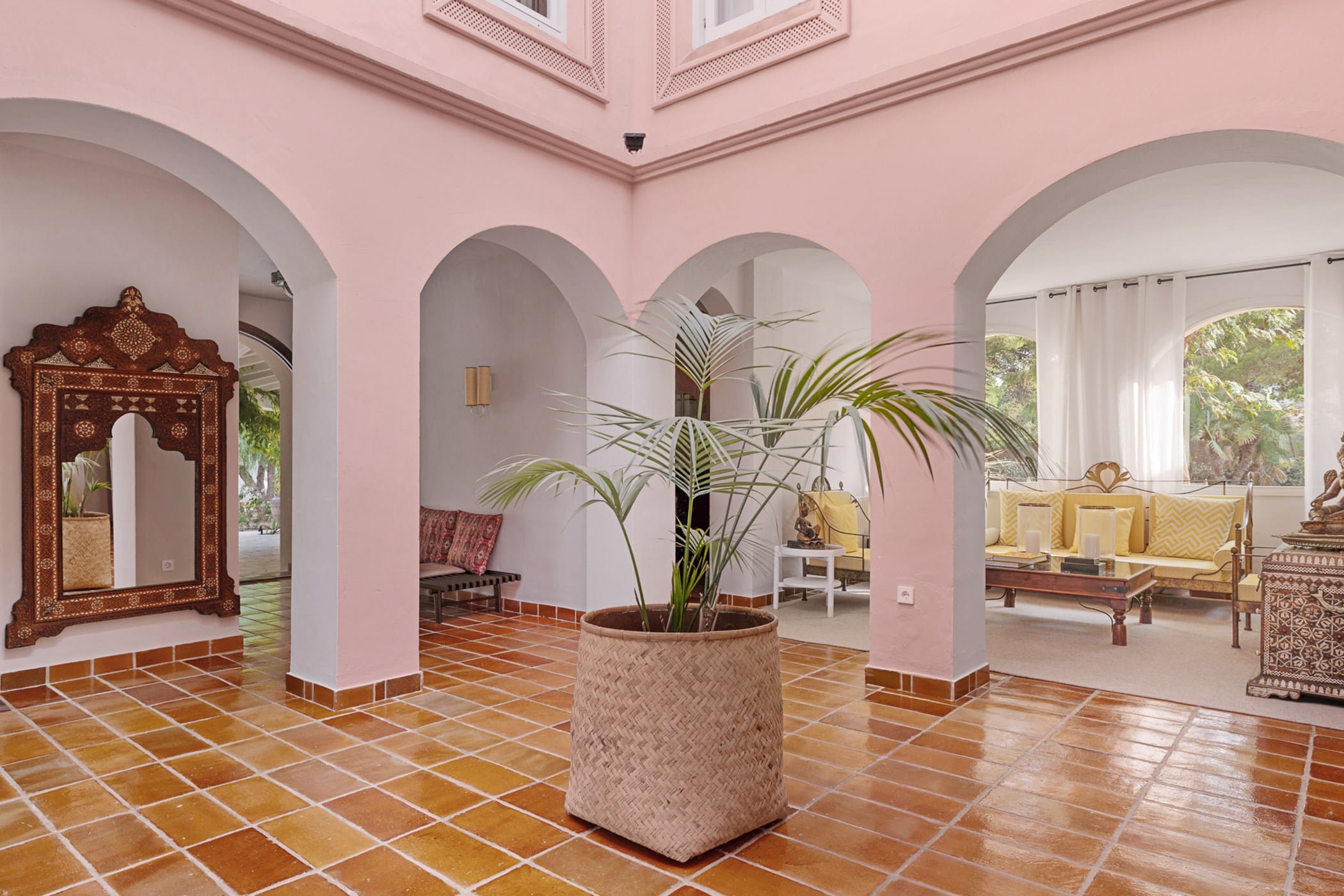 Outdoor living is a highlight, with a saltwater pool overlooking the sea, landscaped gardens, and multiple spaces for dining and entertaining. Guests can enjoy a barbecue area, sports facilities such as a paddle court and multi-use court, and unique private sea access via a path leading to a traditional fishing hut and docking point. Combining luxury amenities with breathtaking surroundings, it offers an exceptional setting for a memorable Ibiza getaway.