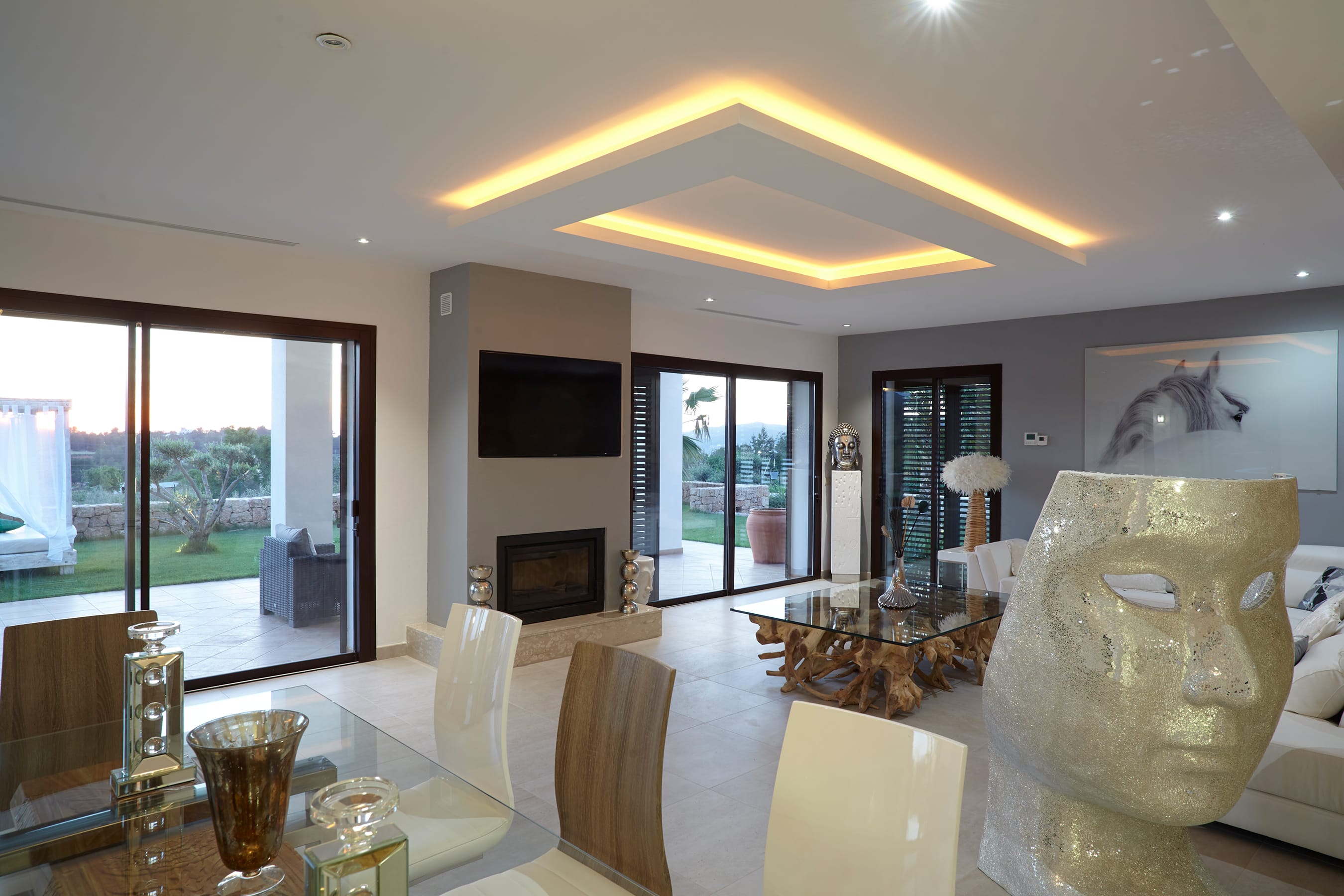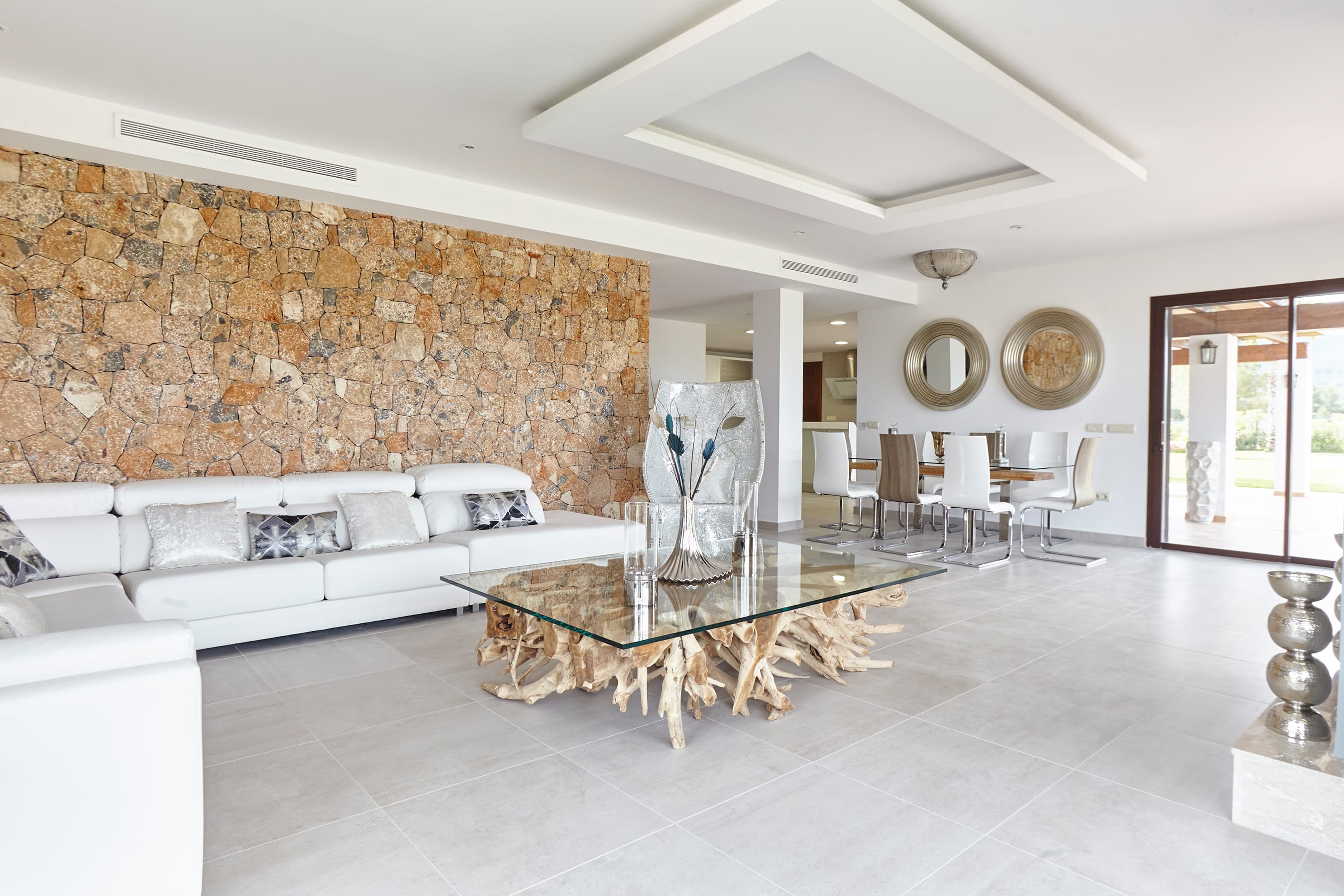 The bright indoor living area boasts concrete walls, tiled floors, wide sliding glass doors, comfortable beige sectionals, and a dining space for up to 10 guests, all with beautiful views of the mountains and Mediterranean sky.