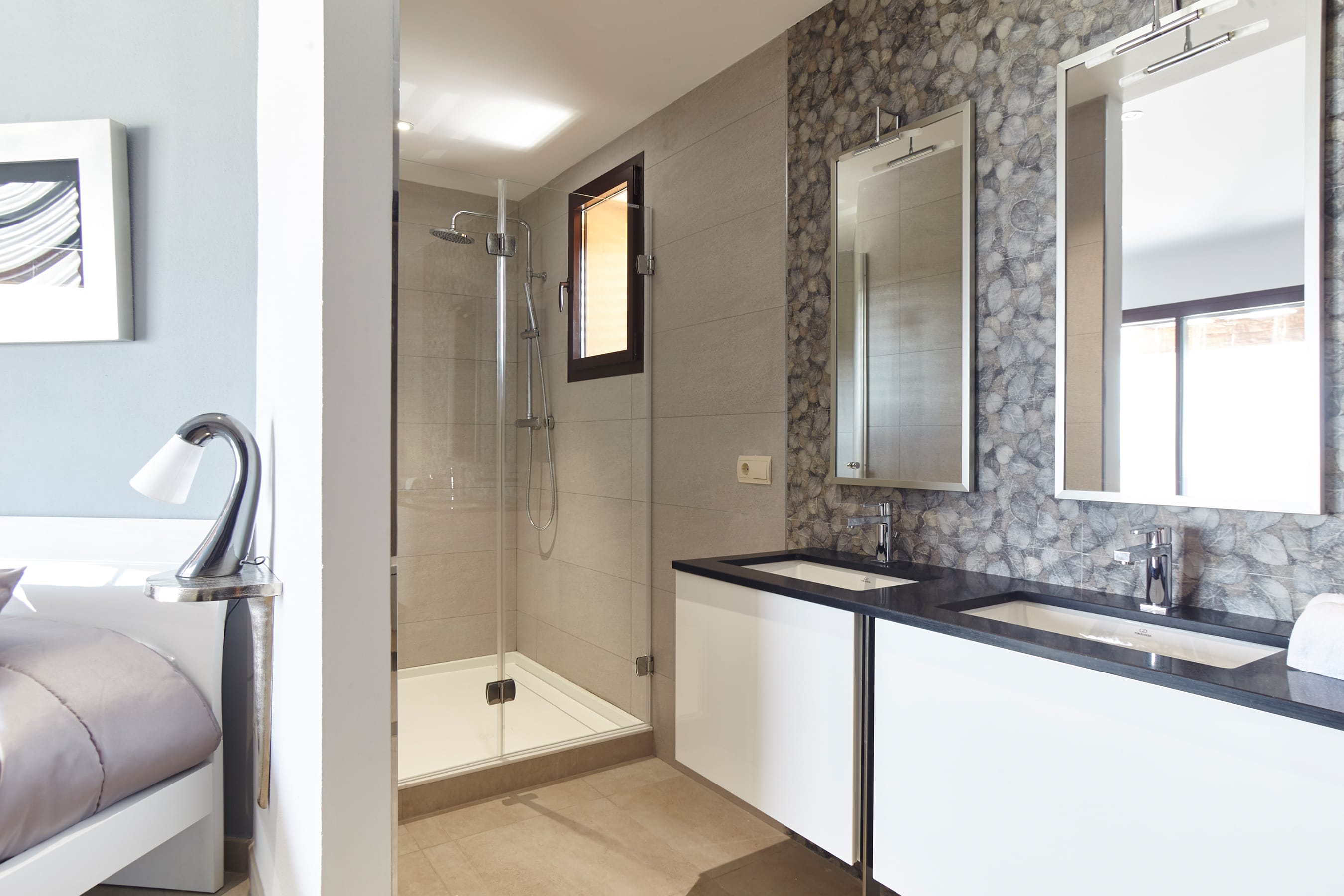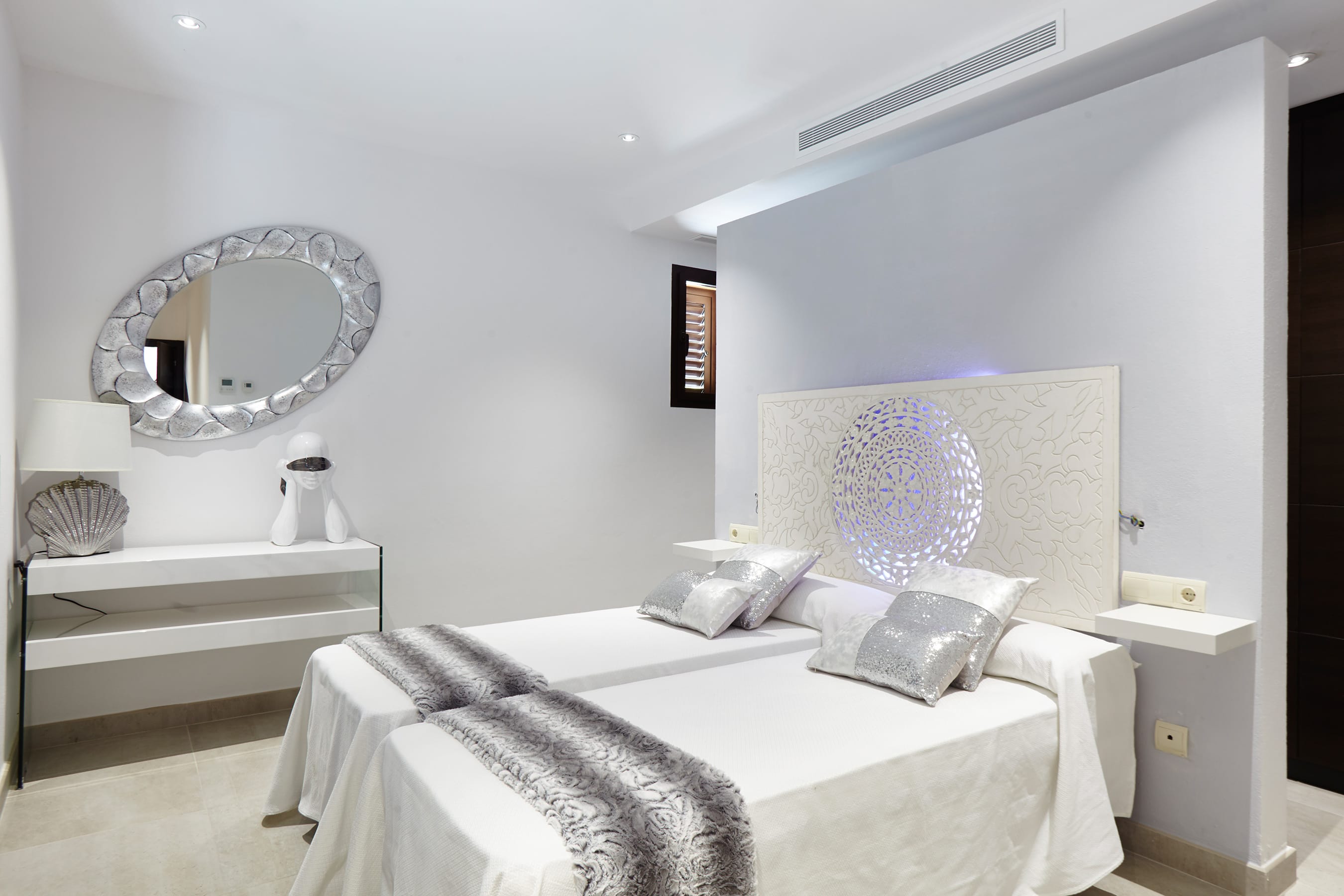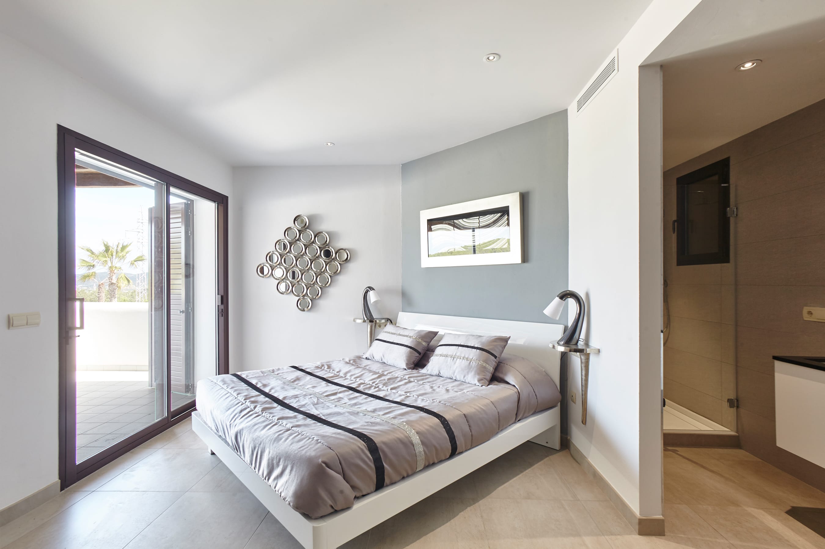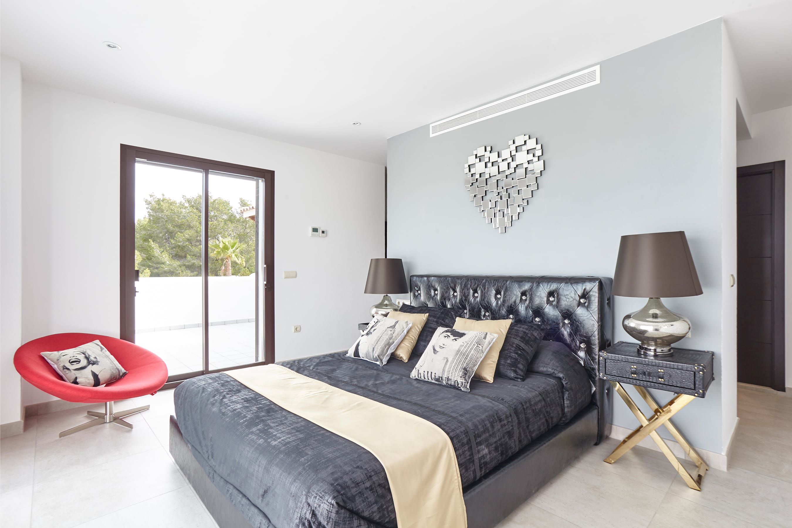 The villa features five hotel-style double bedrooms, each with walk-in closet, en-suite bathroom (spacious shower or bathtub), air conditioning, safe box, alarm, hair dryer, hypoallergenic mattress, and crisp white bedding paired with warm wood tones. Most rooms have balconies or large windows.