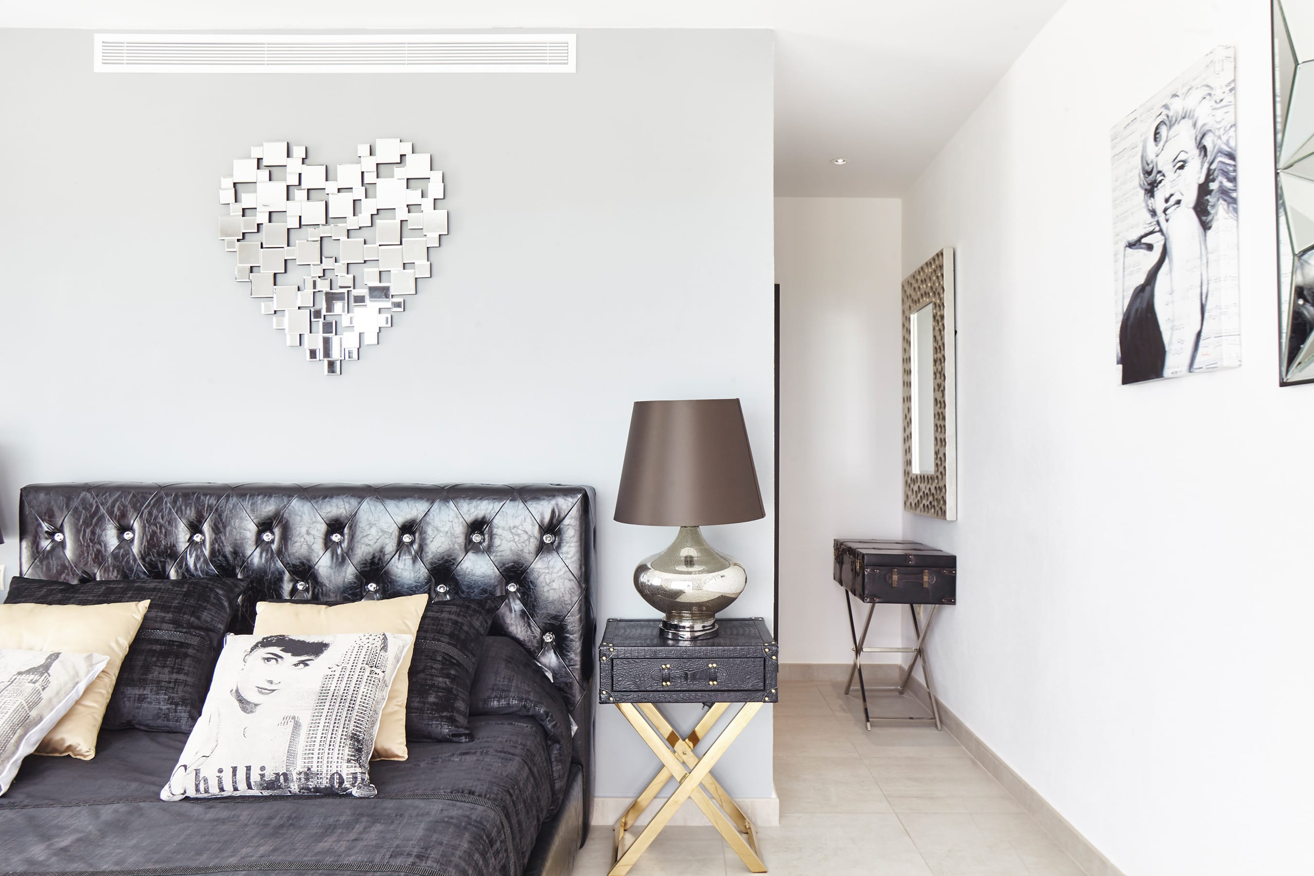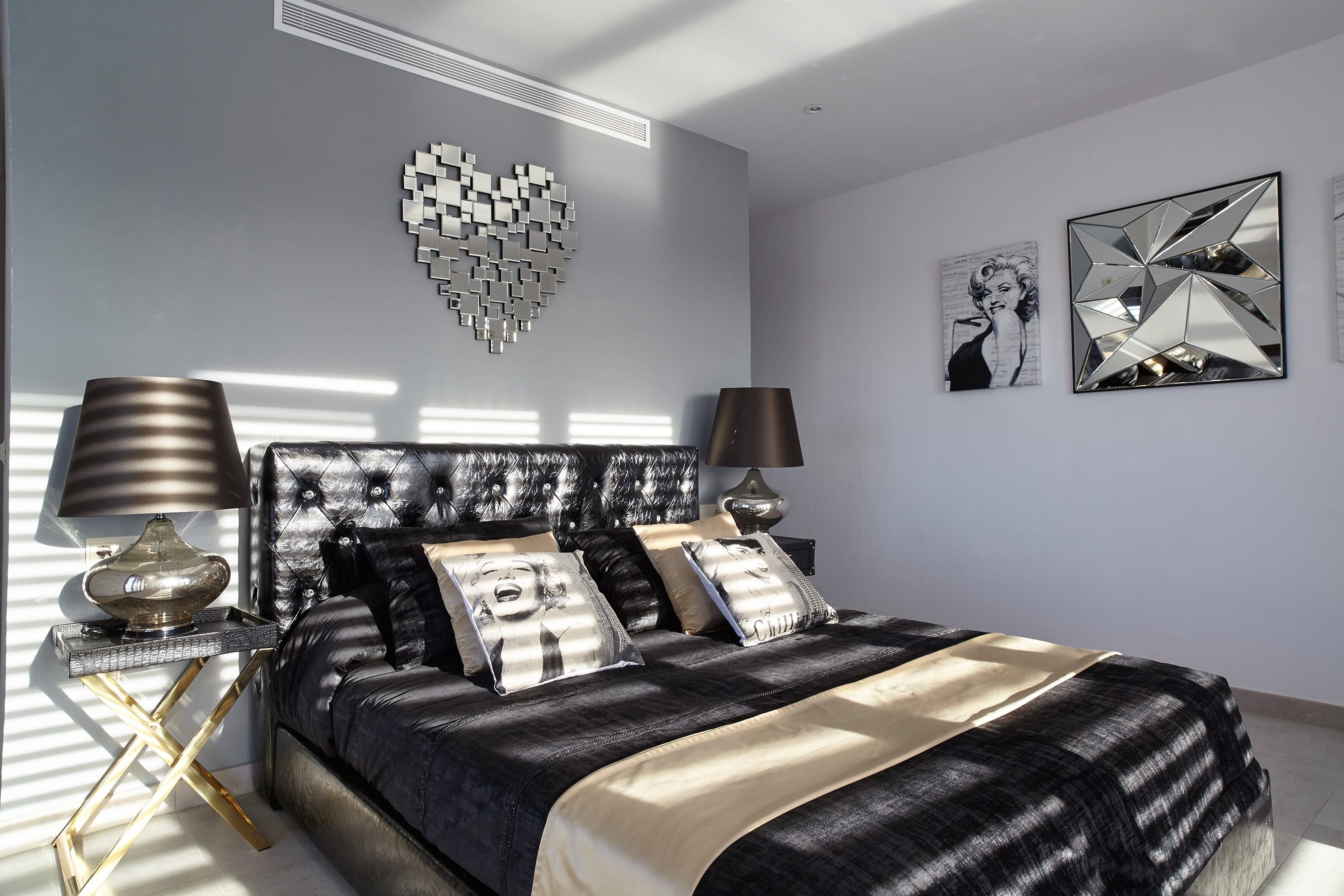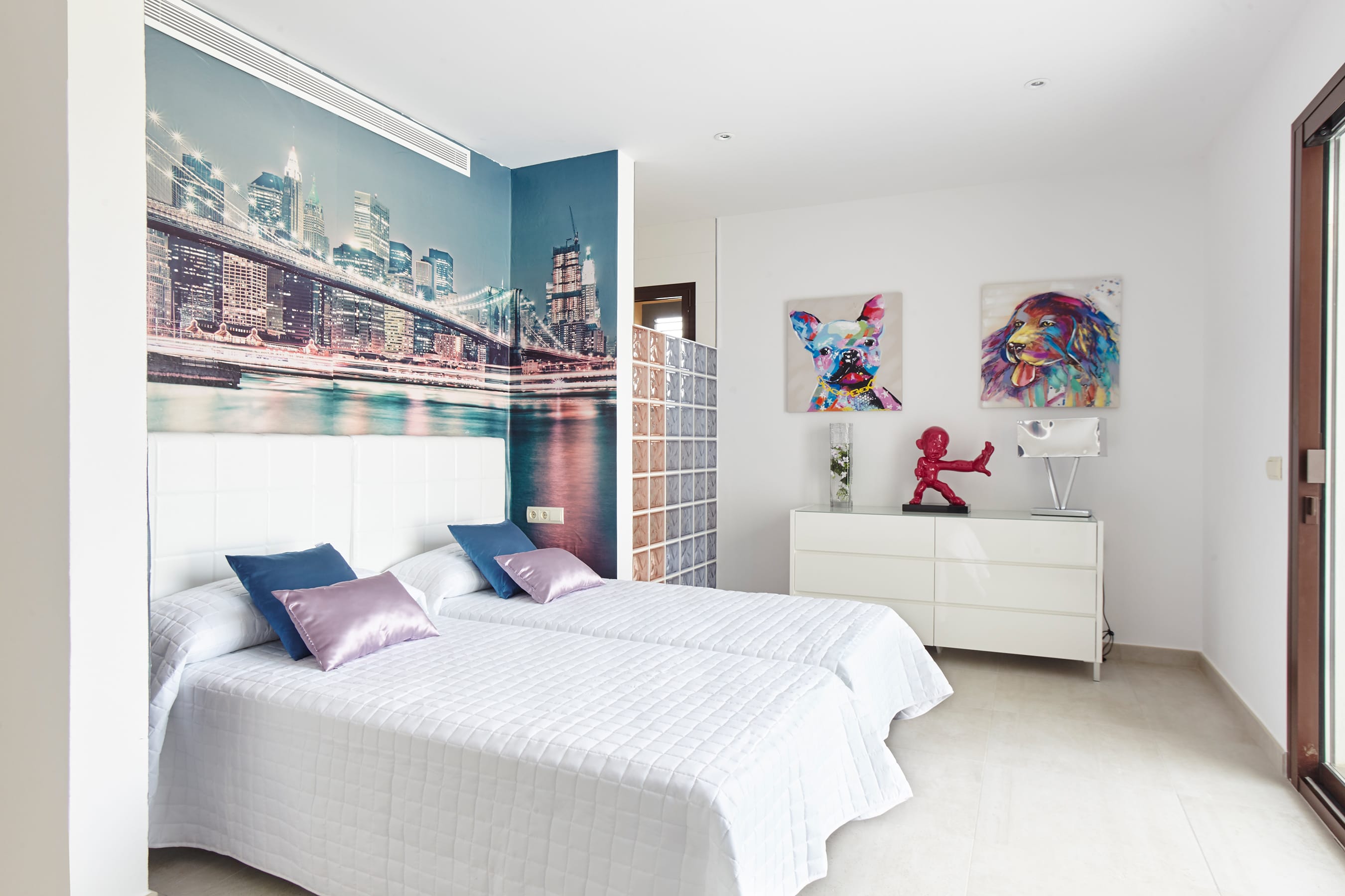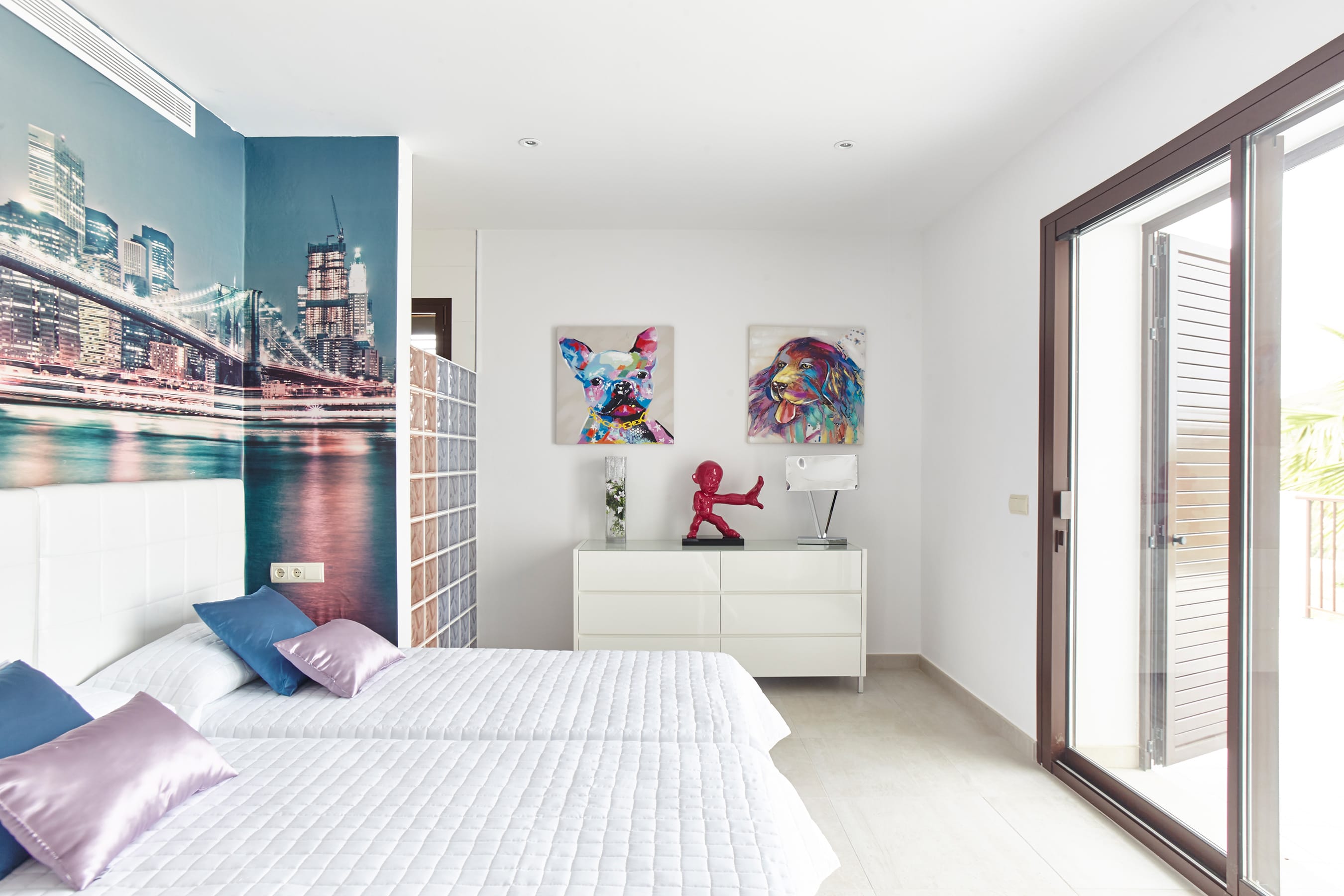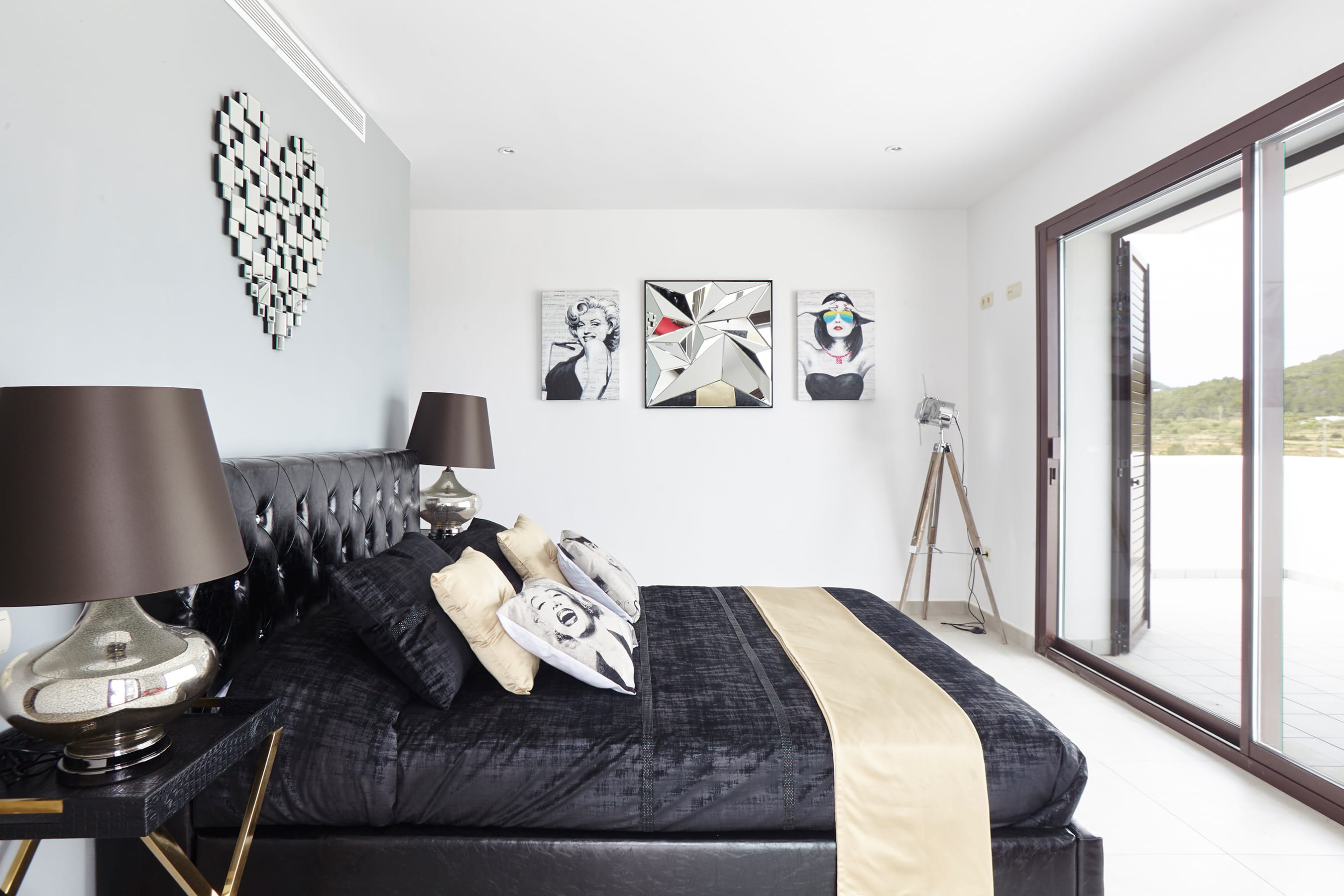 The villa features five hotel-style double bedrooms, each with walk-in closet, en-suite bathroom (spacious shower or bathtub), air conditioning, safe box, alarm, hair dryer, hypoallergenic mattress, and crisp white bedding paired with warm wood tones. Most rooms have balconies or large windows.