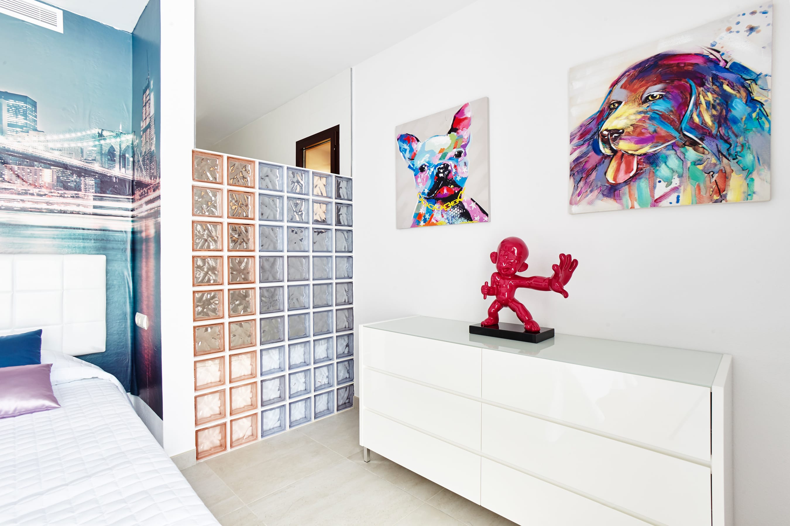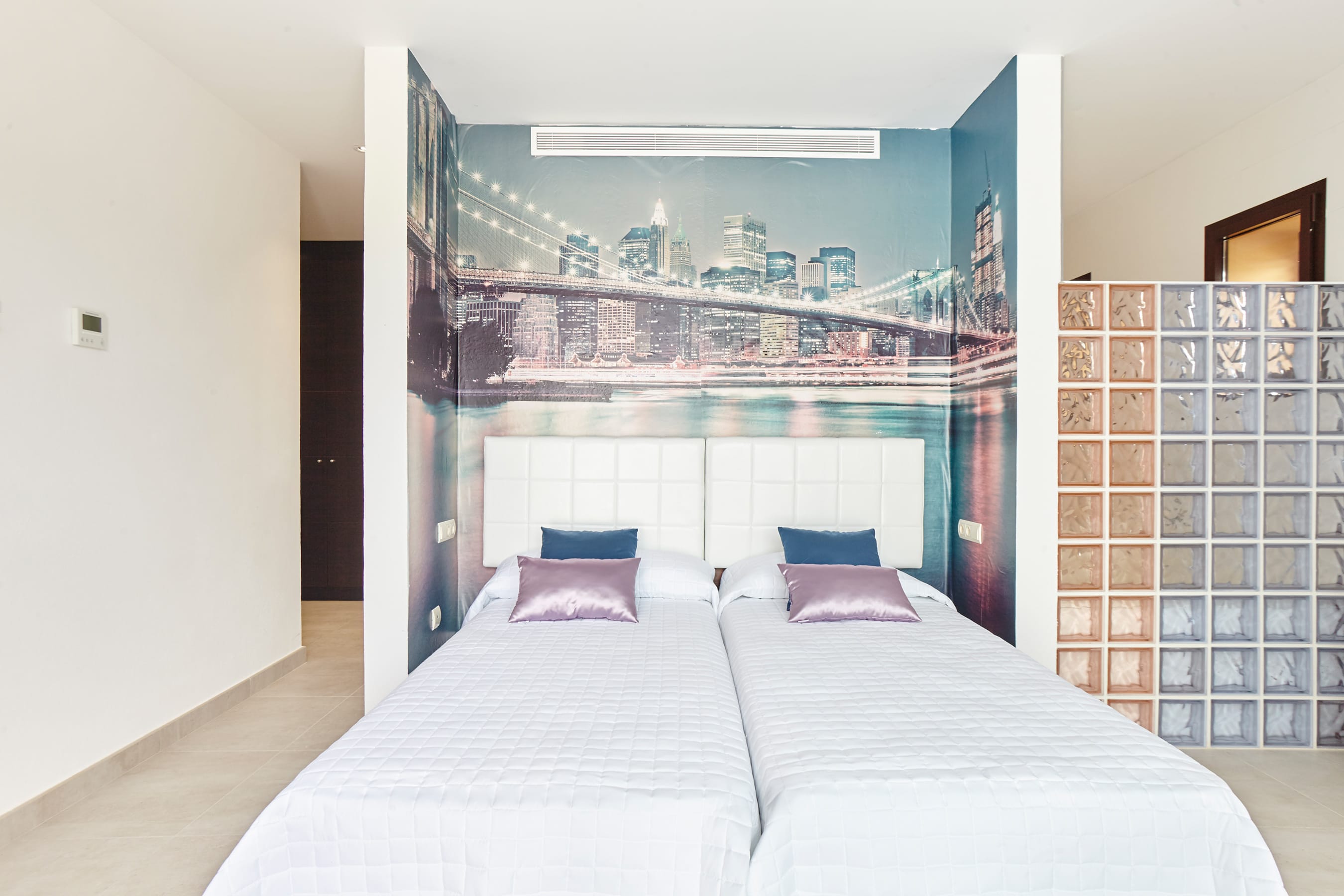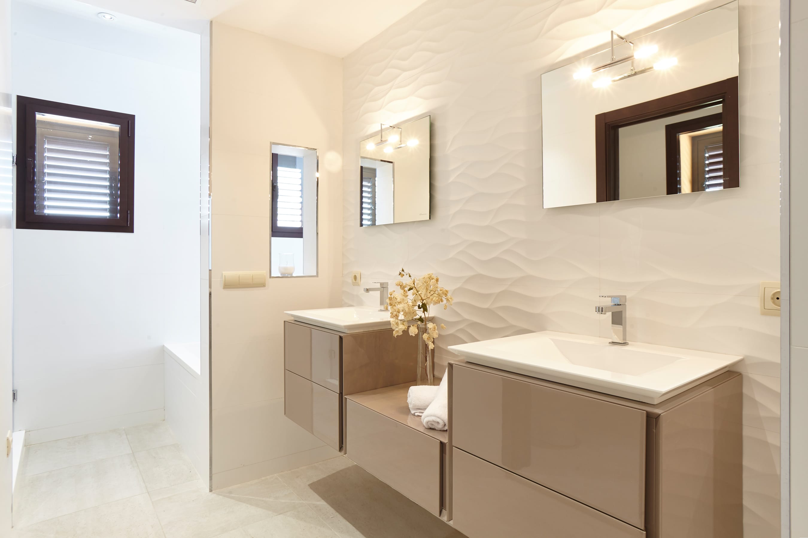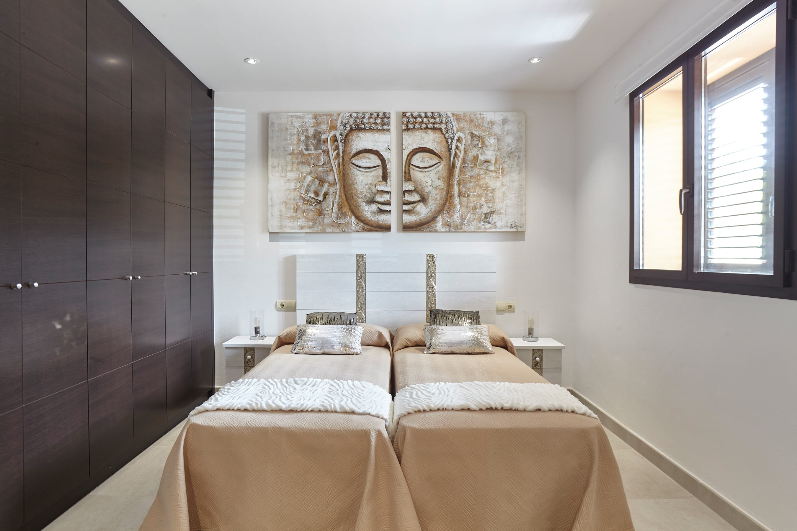 The villa features five hotel-style double bedrooms, each with walk-in closet, en-suite bathroom (spacious shower or bathtub), air conditioning, safe box, alarm, hair dryer, hypoallergenic mattress, and crisp white bedding paired with warm wood tones. Most rooms have balconies or large windows.
