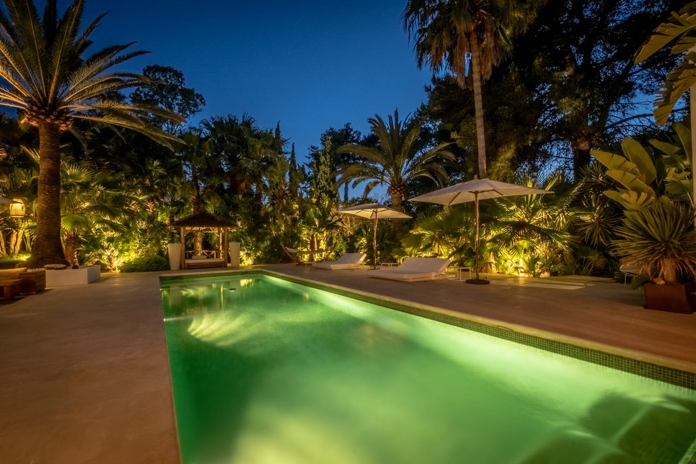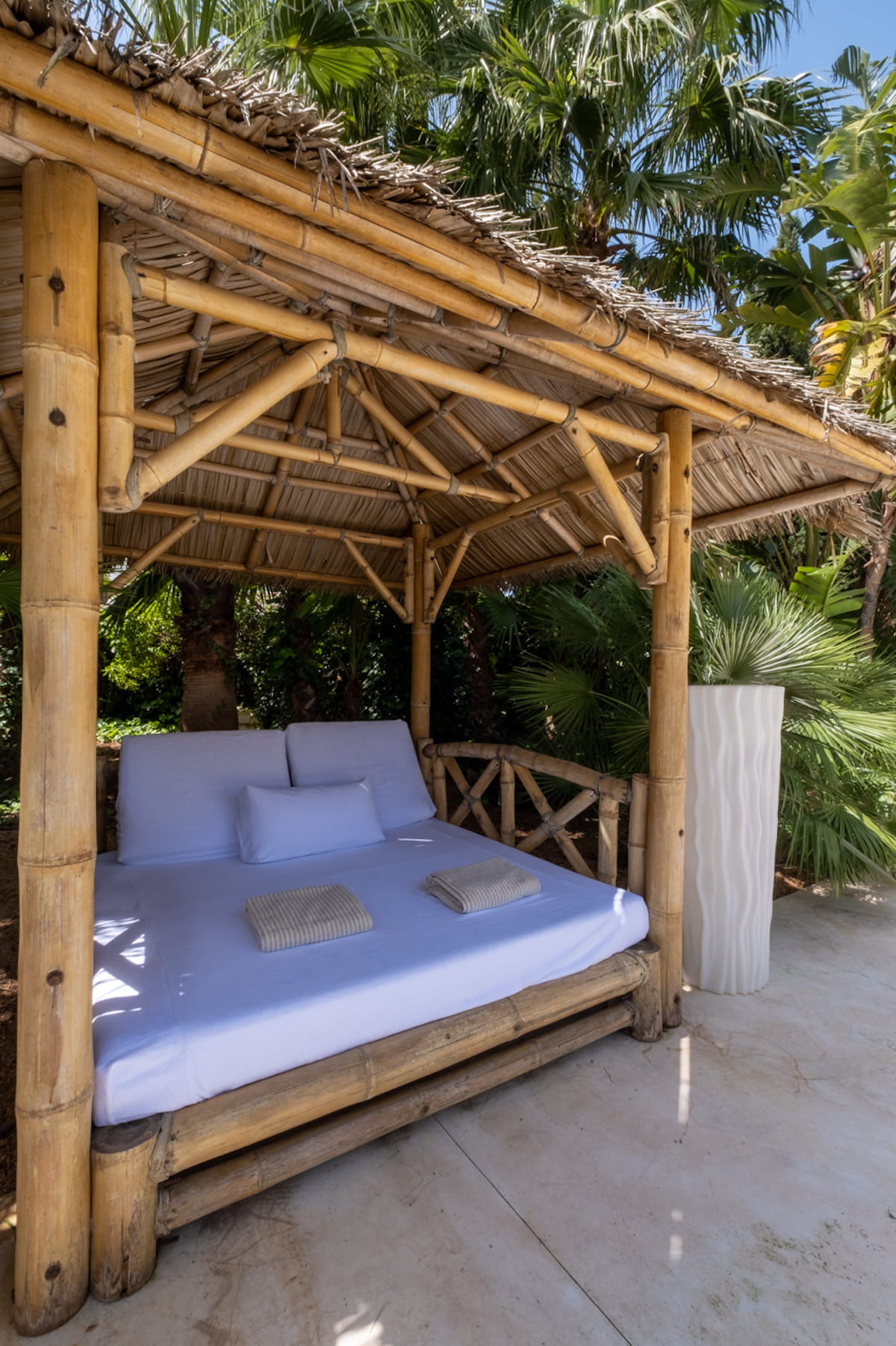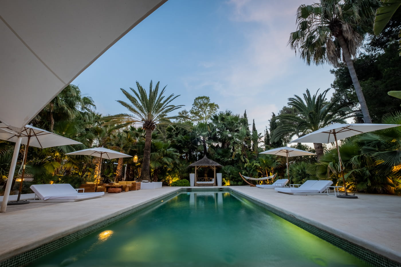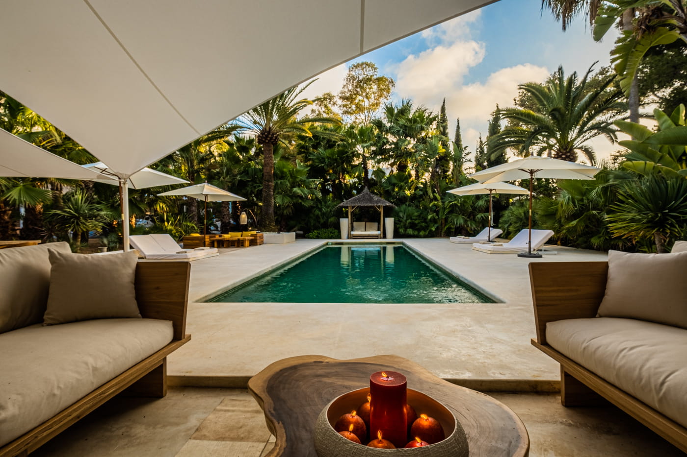 The grounds are the centrepiece: beautifully manicured gardens with palm trees, a harmonious rectangular swimming pool, double Balinese sun loungers, day beds, an al fresco BBQ dining area, and outdoor chill-out sofas. The exteriors provide perfect tranquillity and a relaxing island retreat.