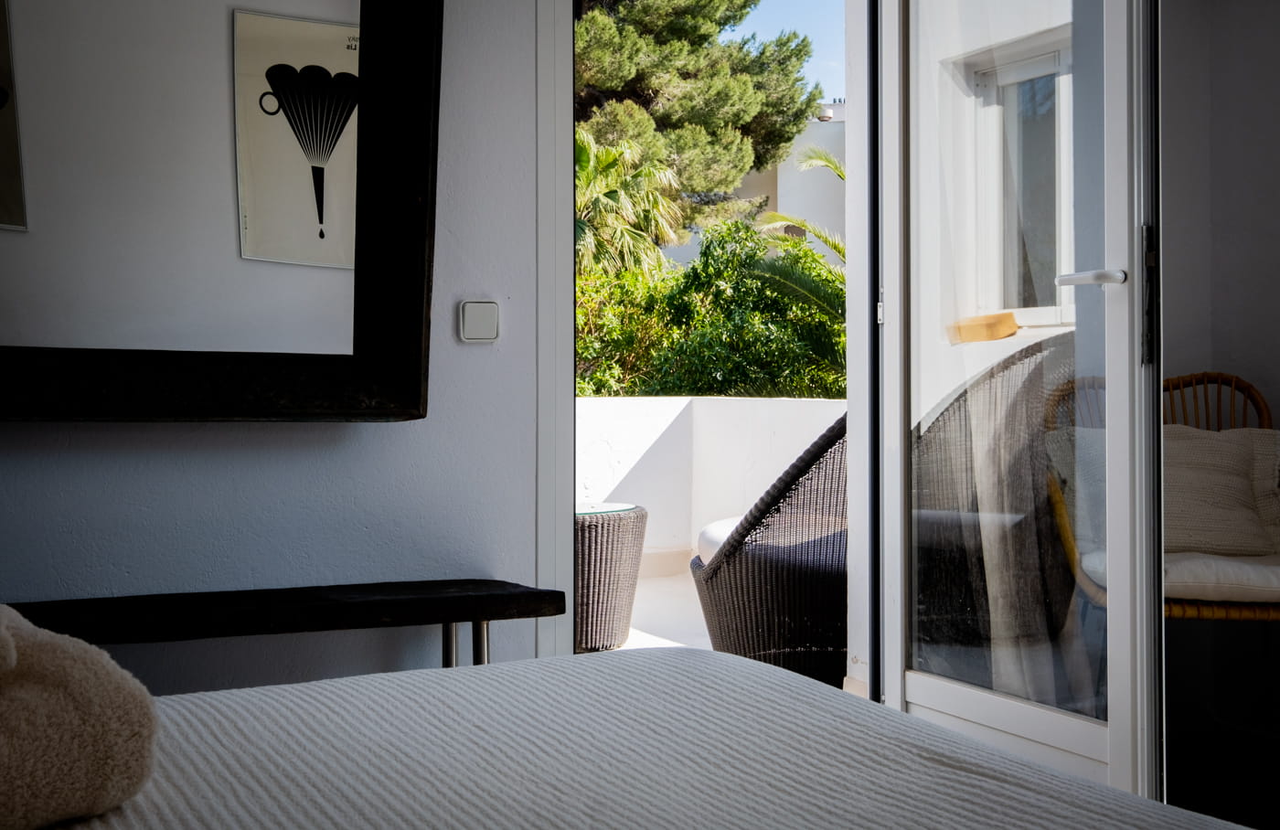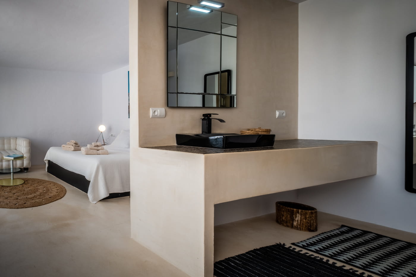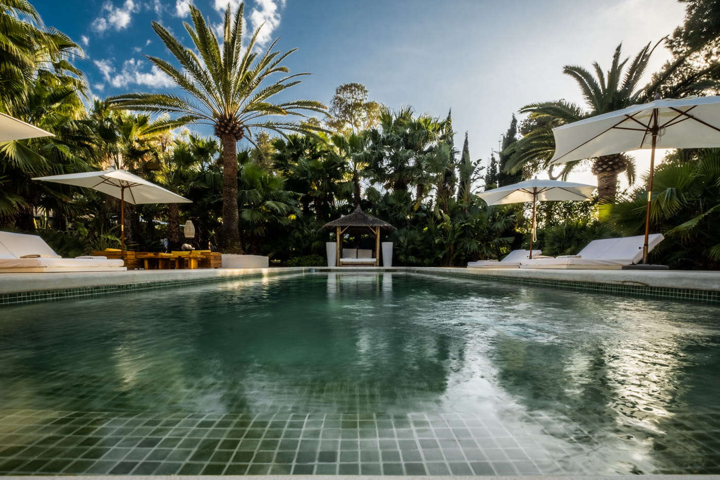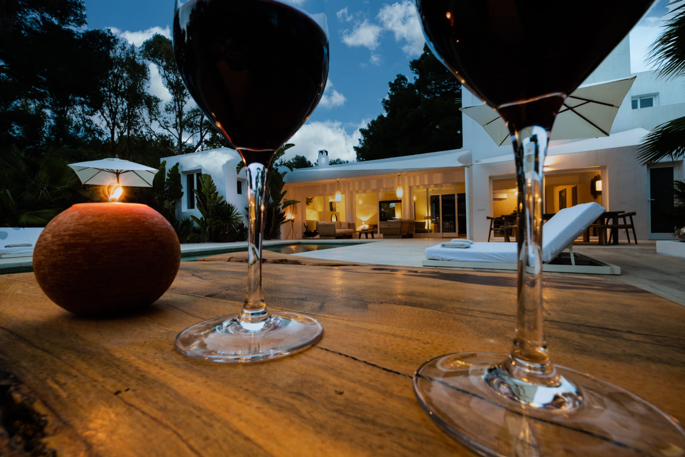The grounds are the centrepiece: beautifully manicured gardens with palm trees, a harmonious rectangular swimming pool, double Balinese sun loungers, day beds, an al fresco BBQ dining area, and outdoor chill-out sofas. The exteriors provide perfect tranquillity and a relaxing island retreat.