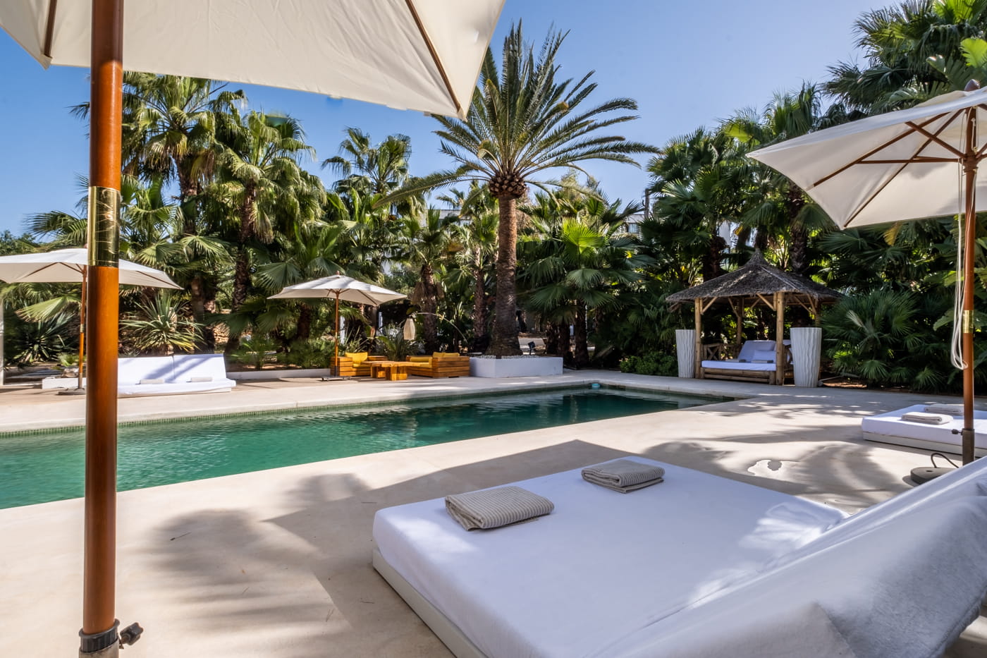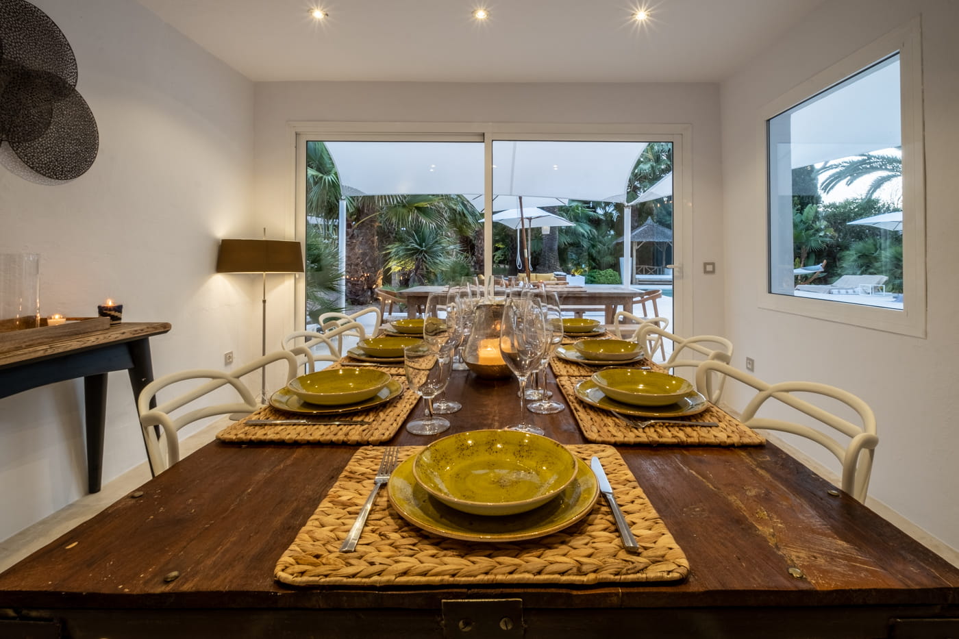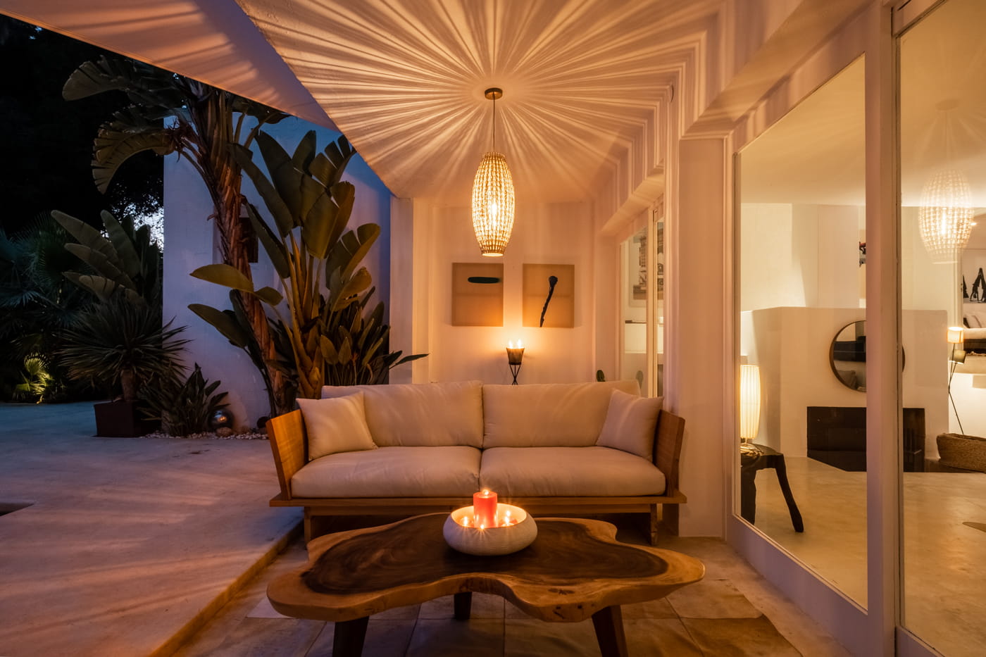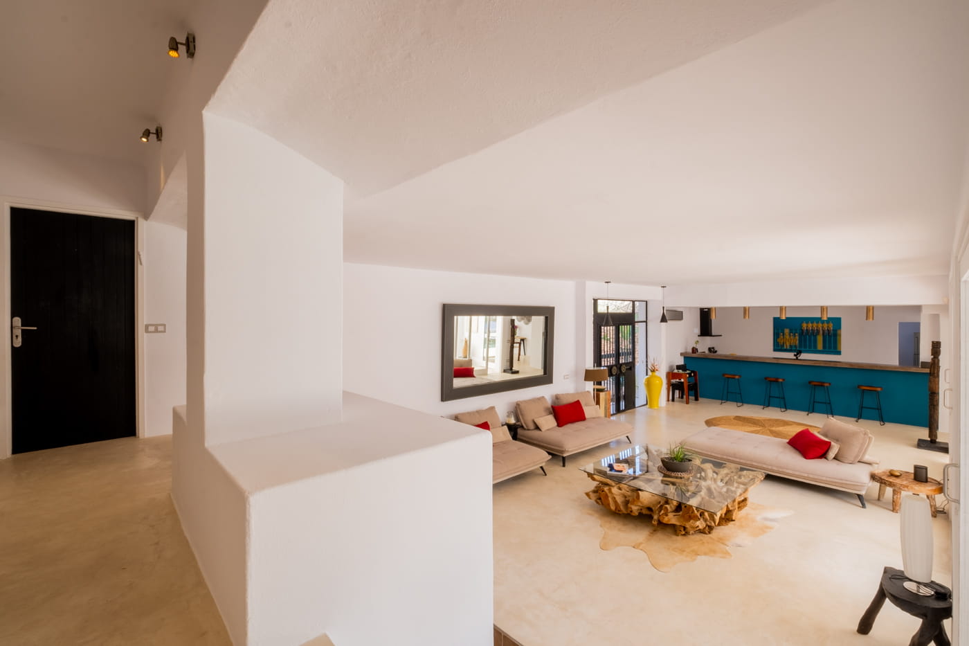 This chic and bohemian 5-bedroom villa is located in the sought-after private gated area of Roca Llisa, close to Ibiza’s golf course. Set over several acres, it masterfully blends bohemian chic with traditional and exotic natural decor.