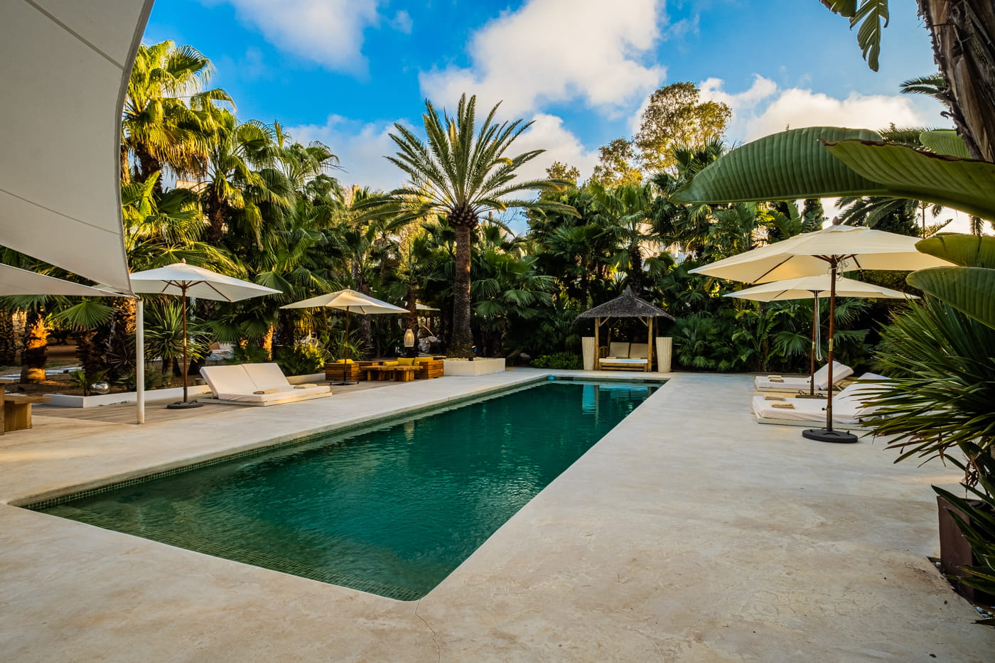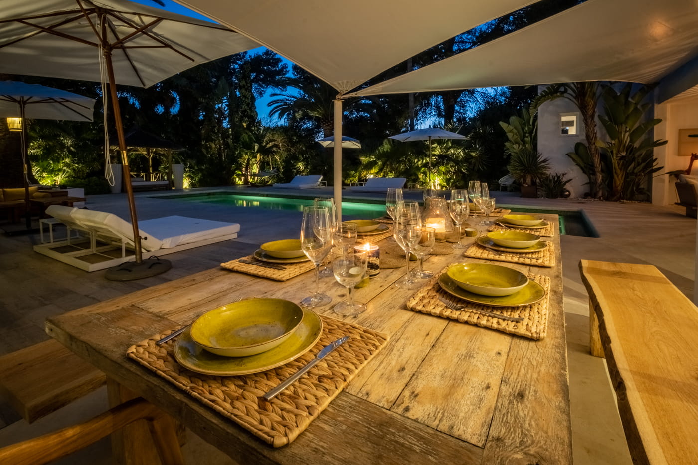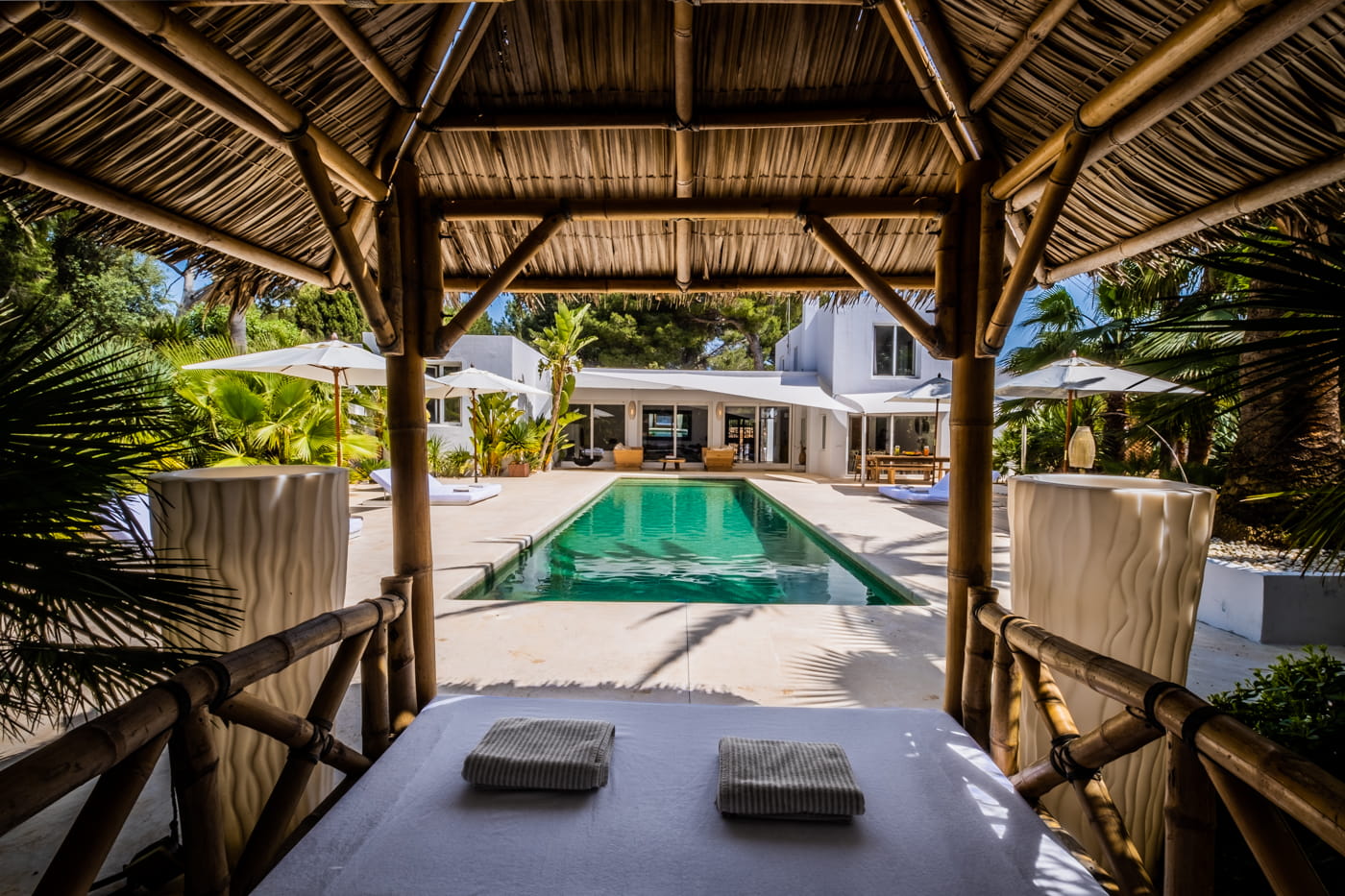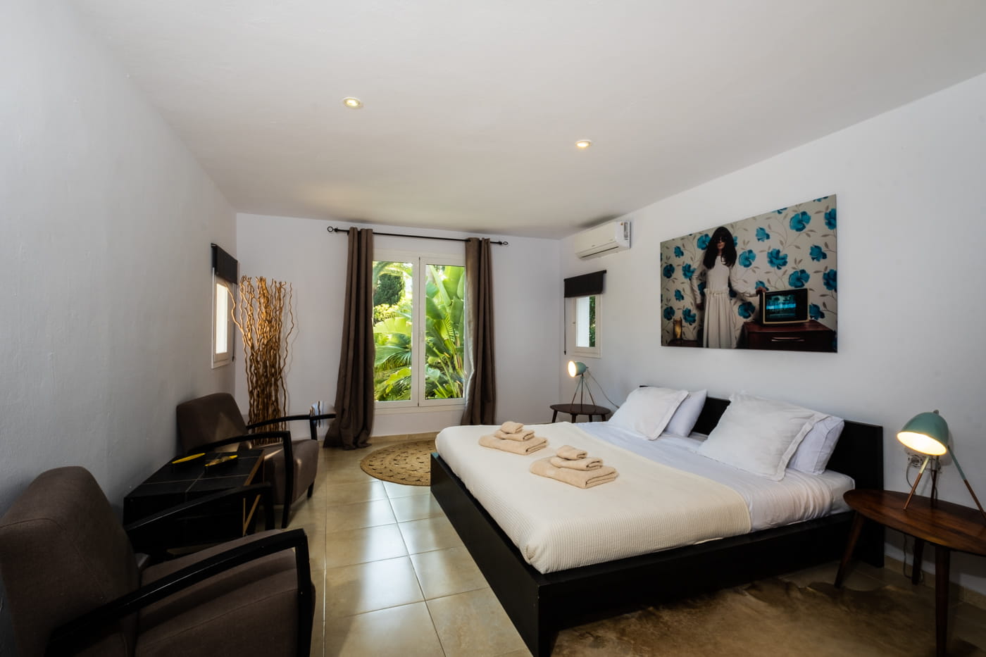 This chic and bohemian 5-bedroom villa is located in the sought-after private gated area of Roca Llisa, close to Ibiza’s golf course. Set over several acres, it masterfully blends bohemian chic with traditional and exotic natural decor.
