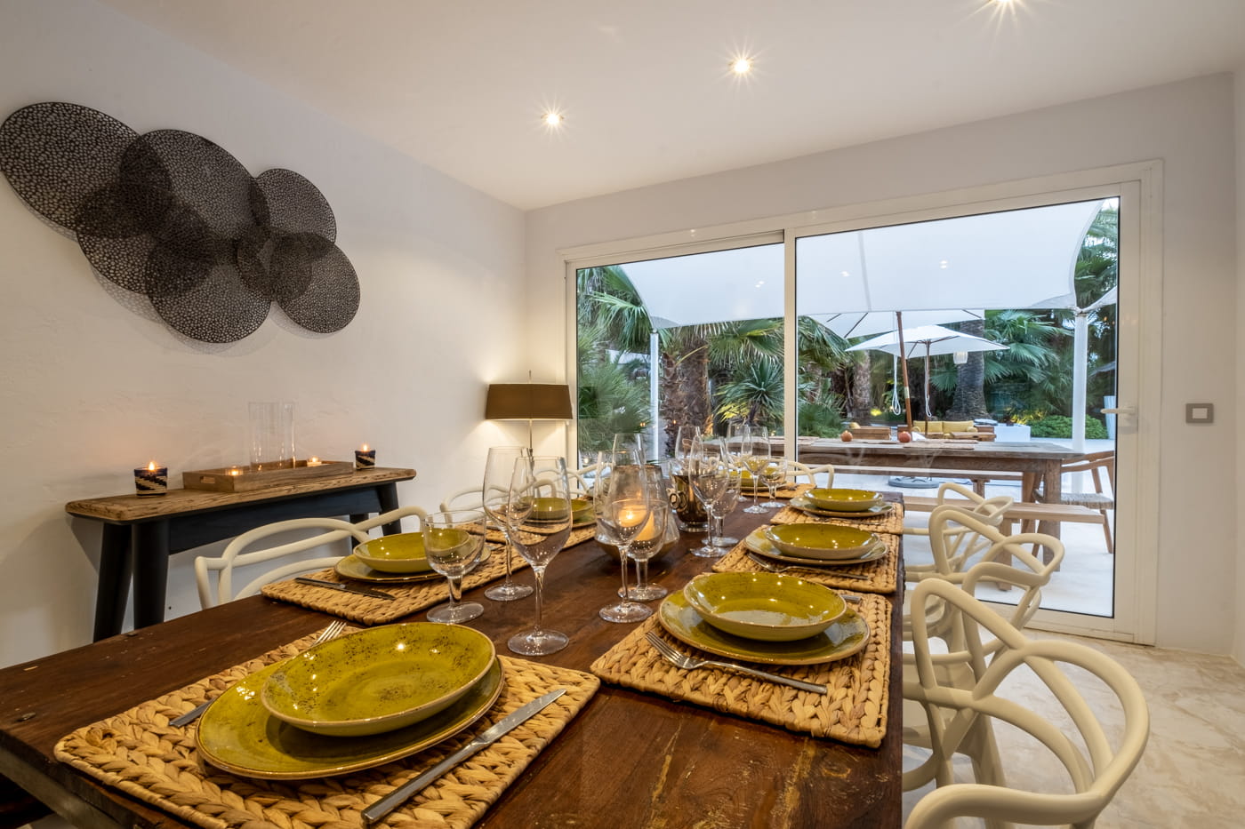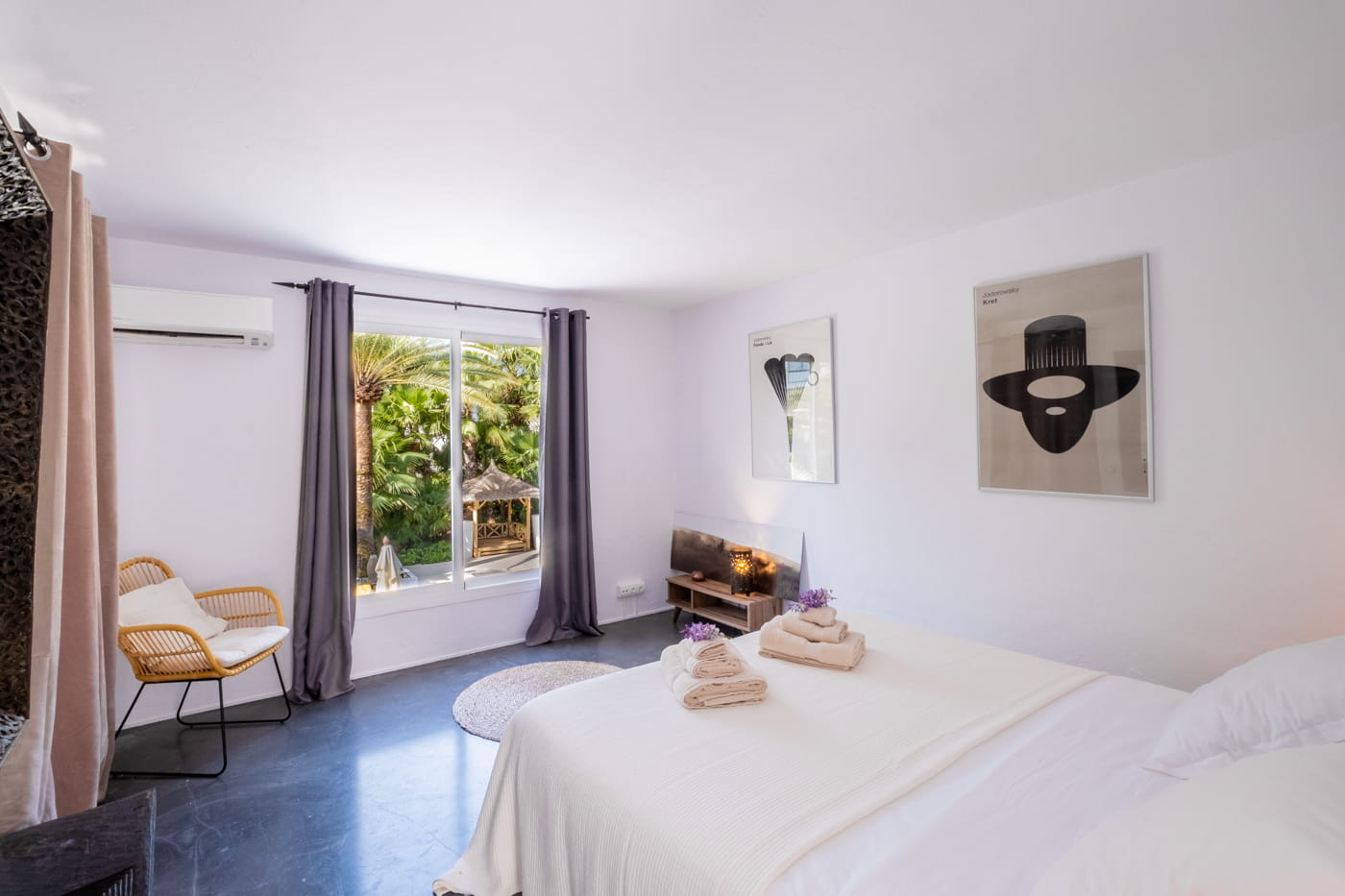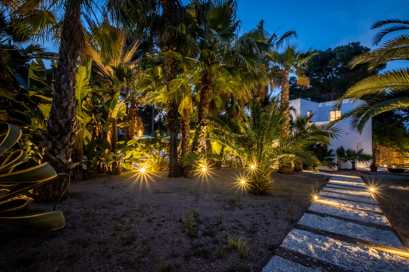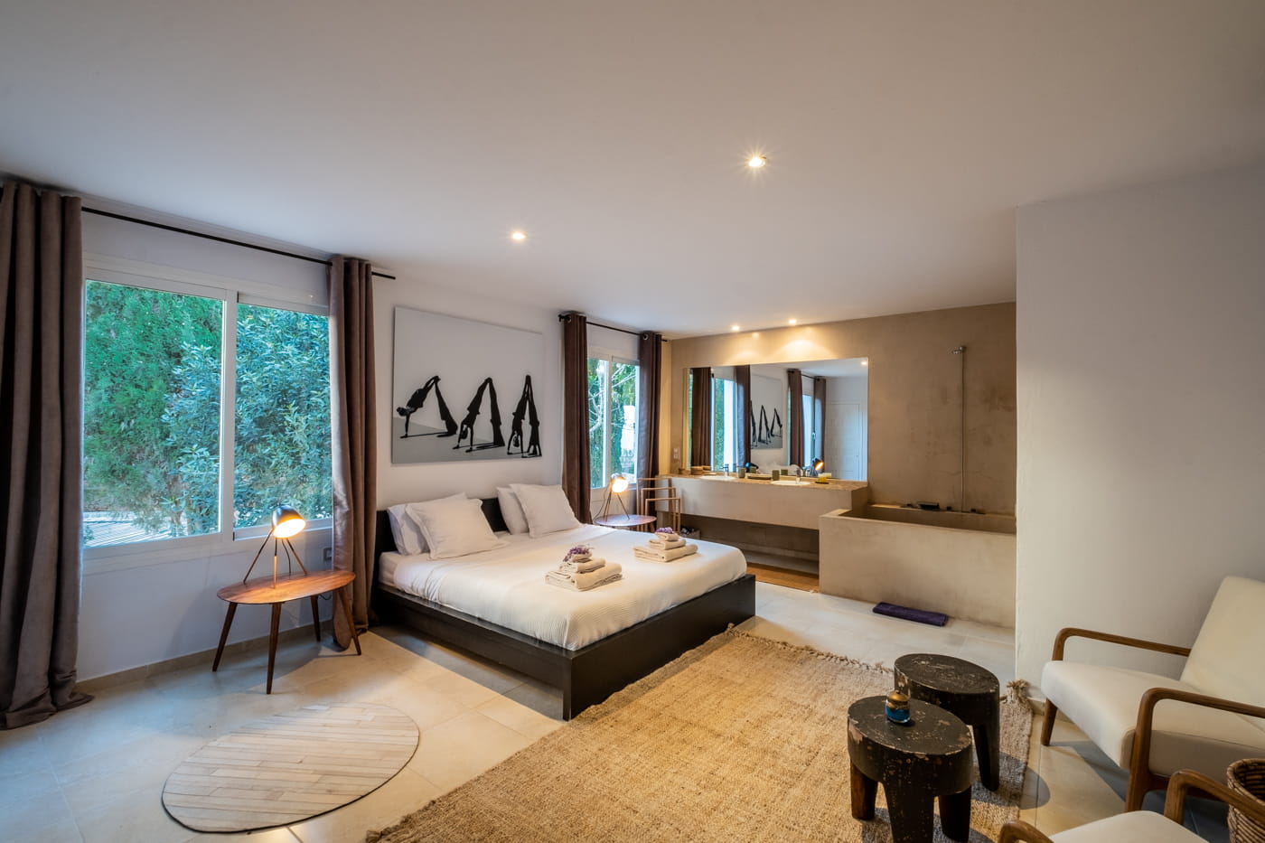 This chic and bohemian 5-bedroom villa is located in the sought-after private gated area of Roca Llisa, close to Ibiza’s golf course. Set over several acres, it masterfully blends bohemian chic with traditional and exotic natural decor.