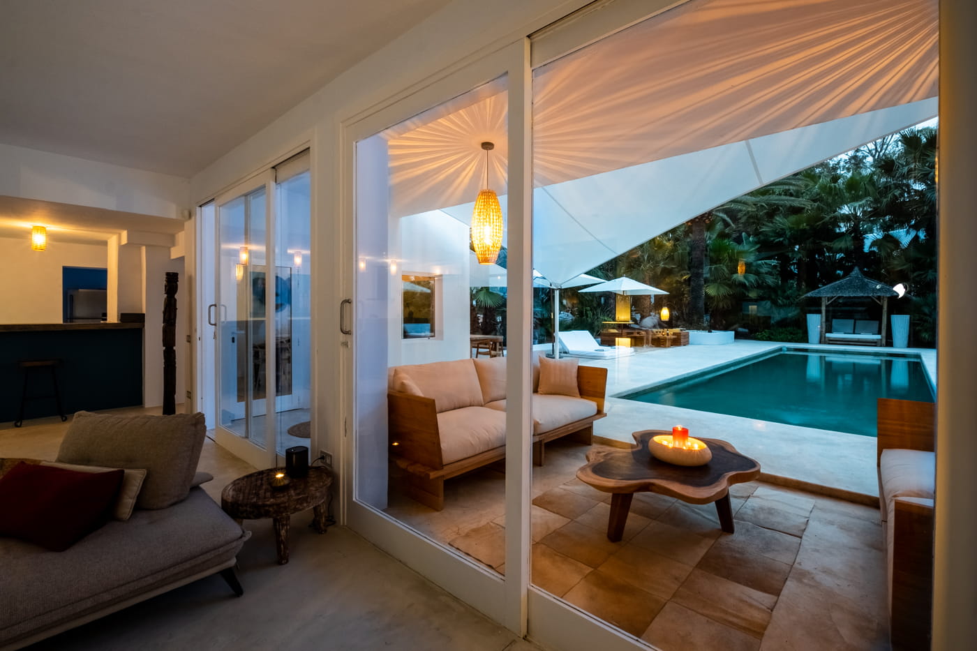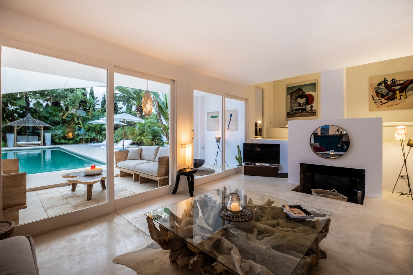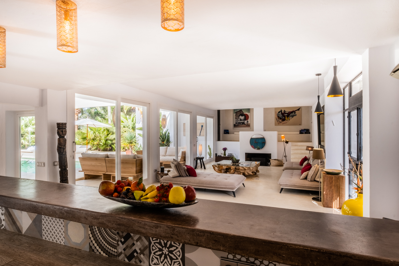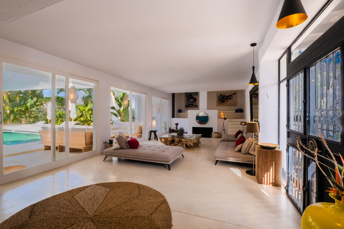 Inside, the vast open-plan living and dining areas are flooded with natural light through huge sliding windows and feature multiple lounge levels with eclectic, high-quality furnishings. The living space opens directly onto the pool terrace, and the modern kitchen is fully equipped.
