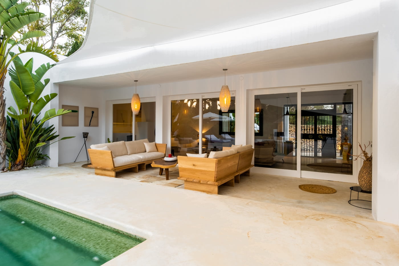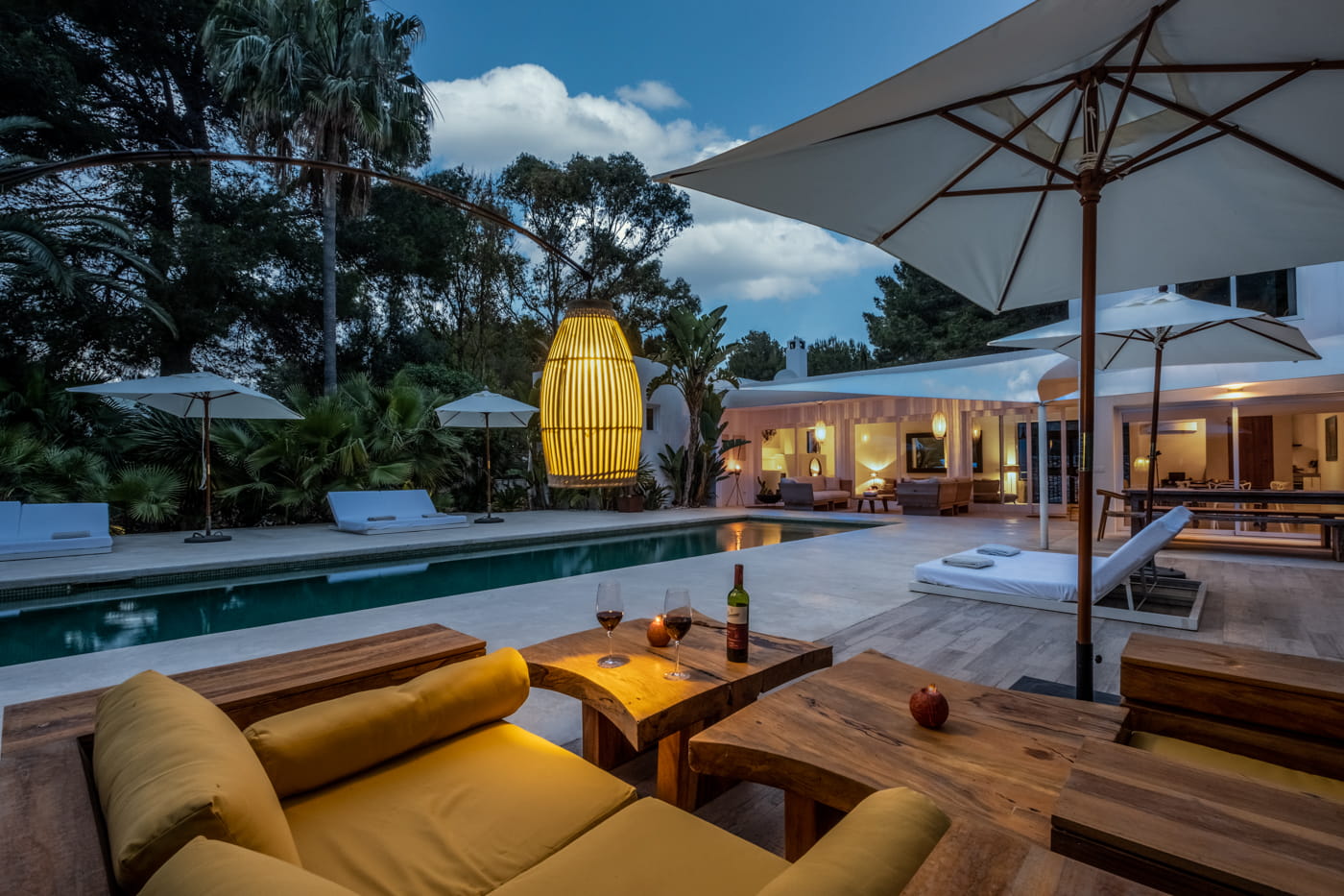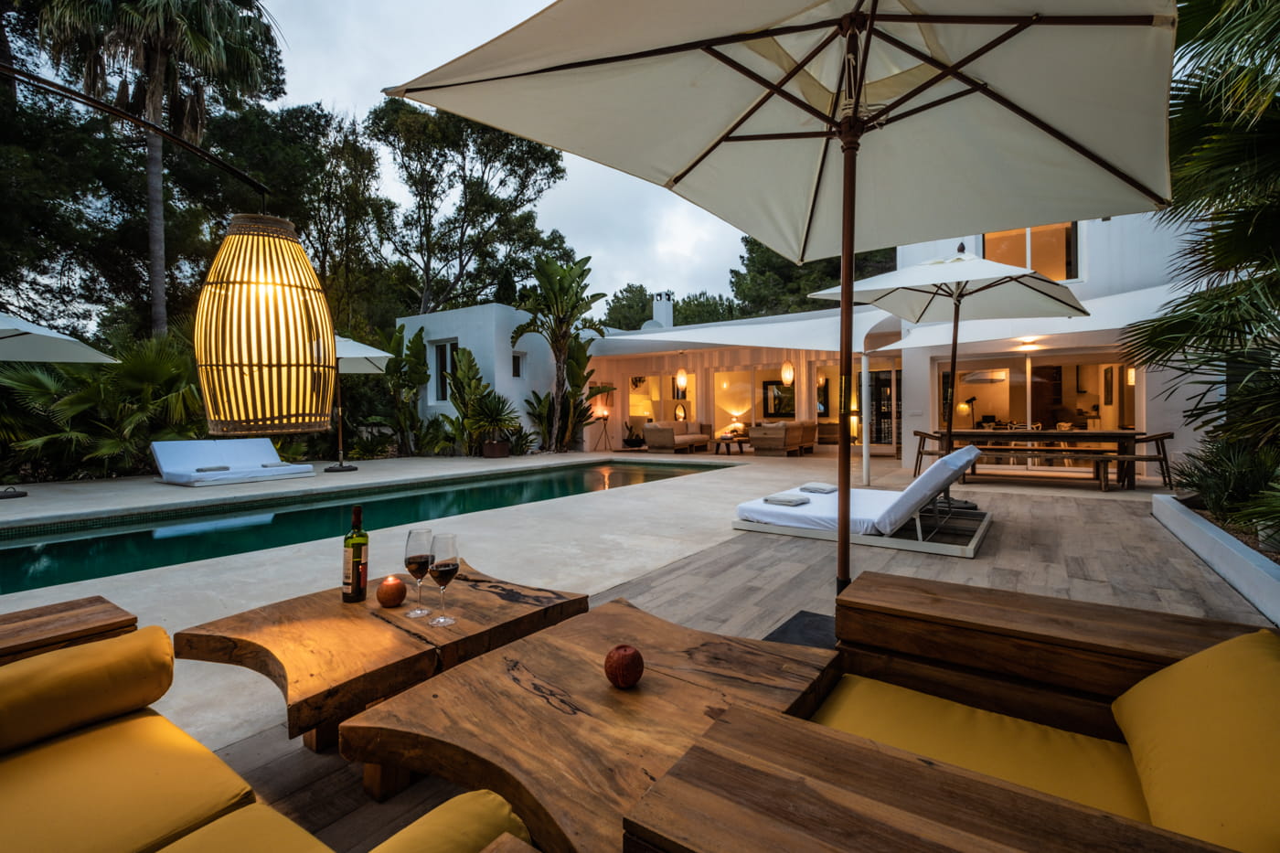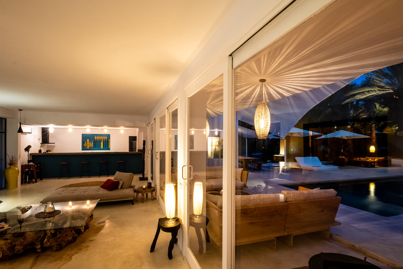 Inside, the vast open-plan living and dining areas are flooded with natural light through huge sliding windows and feature multiple lounge levels with eclectic, high-quality furnishings. The living space opens directly onto the pool terrace, and the modern kitchen is fully equipped.