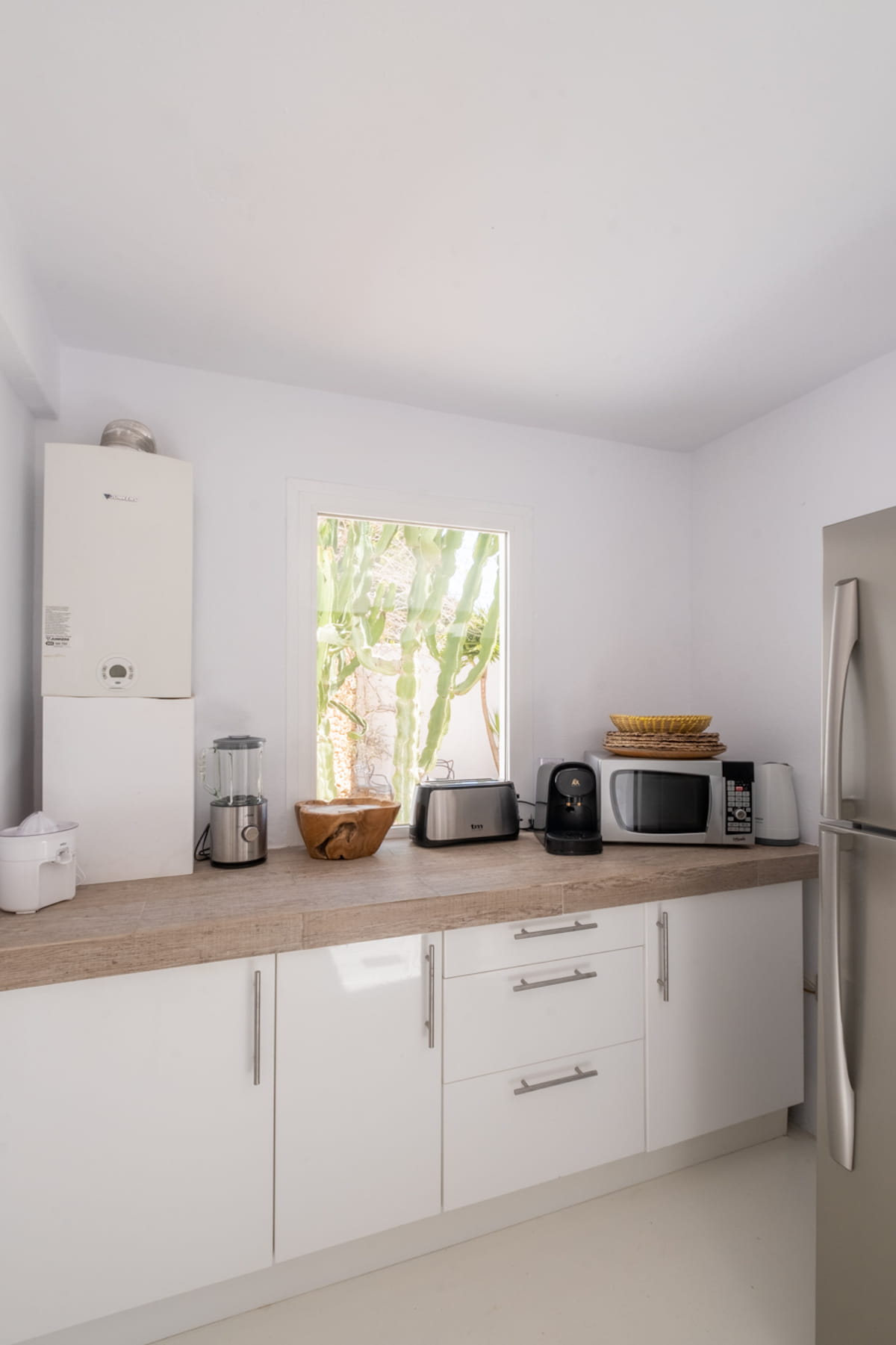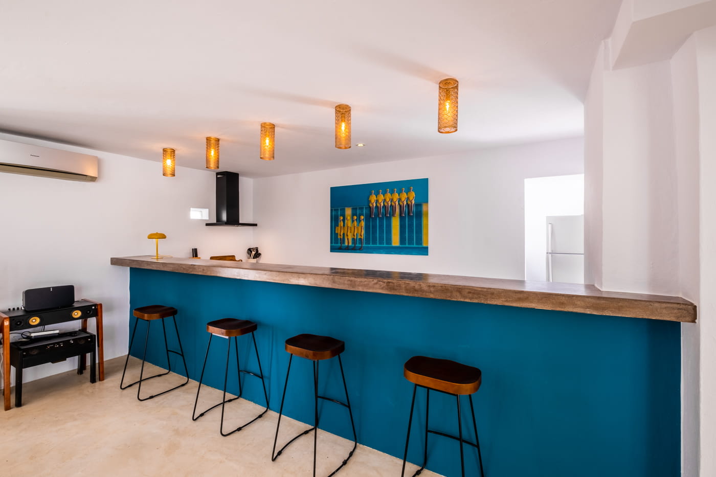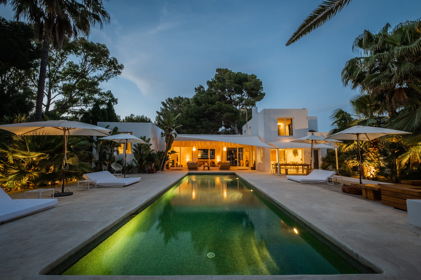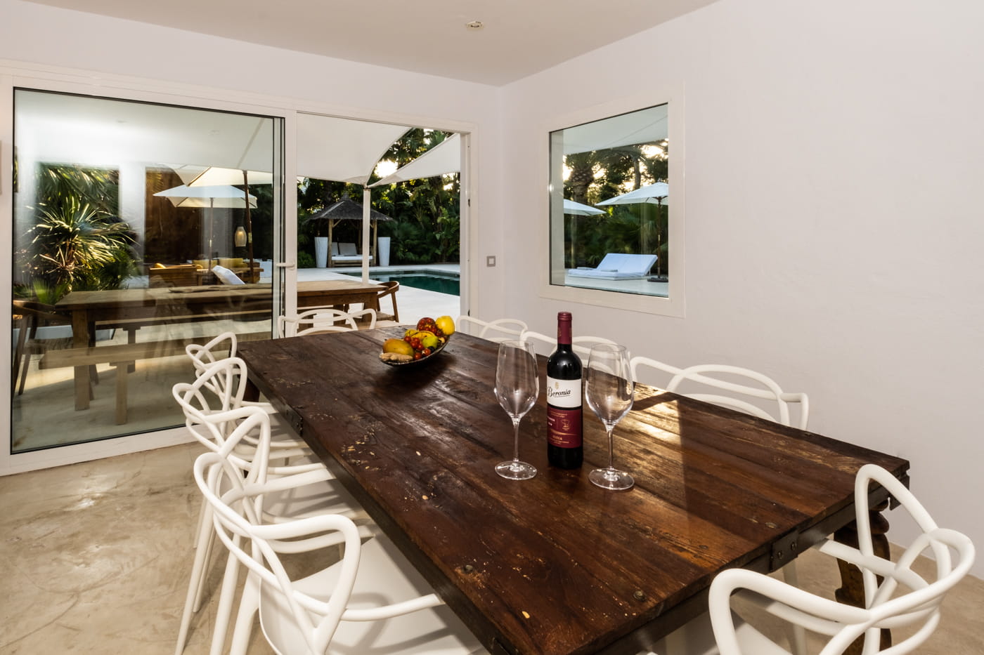 Inside, the vast open-plan living and dining areas are flooded with natural light through huge sliding windows and feature multiple lounge levels with eclectic, high-quality furnishings. The living space opens directly onto the pool terrace, and the modern kitchen is fully equipped.