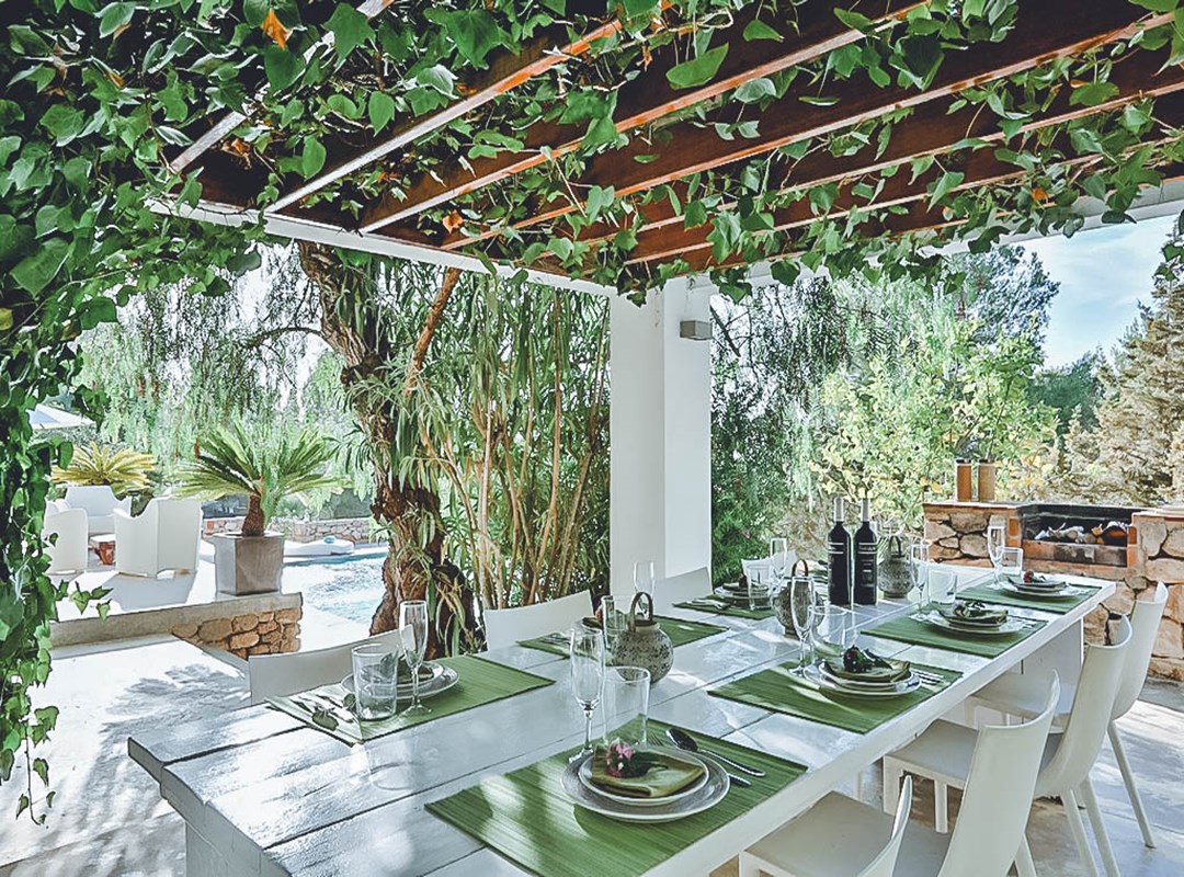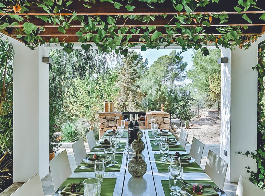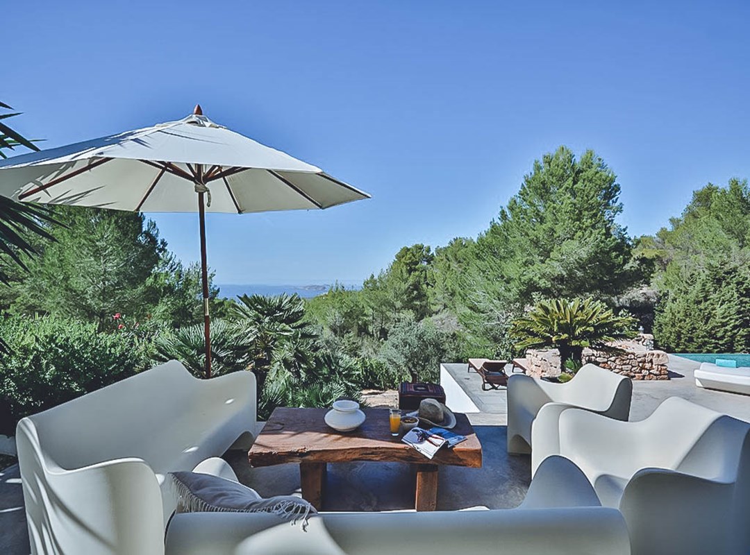 Outdoors: infinity pool surrounded by cascading terraces with multiple chill-out areas, al fresco dining, and BBQ – perfect for enjoying famous Ibiza sunsets.