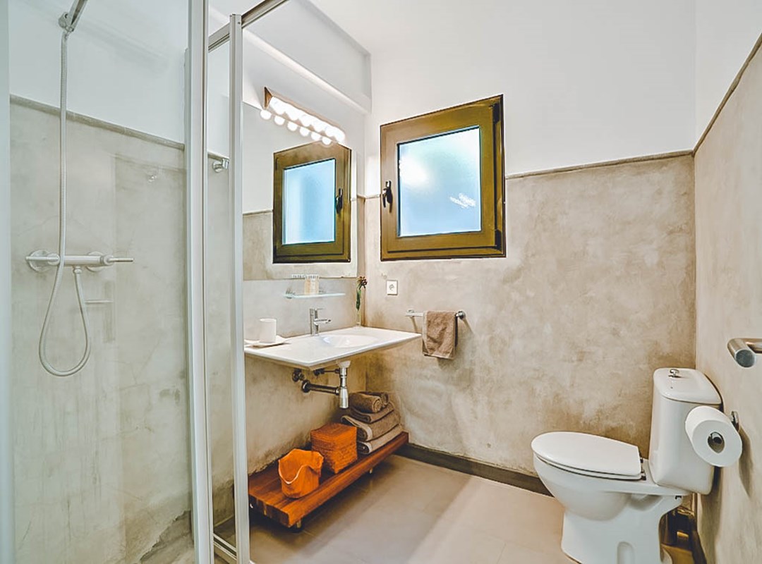 Ground floor: two double bedrooms with beautiful exterior views (one en-suite, the other with bathroom across the hall). One master suite at ground level with direct pool and terrace access. Second master suite on the top floor, reached via external staircase.