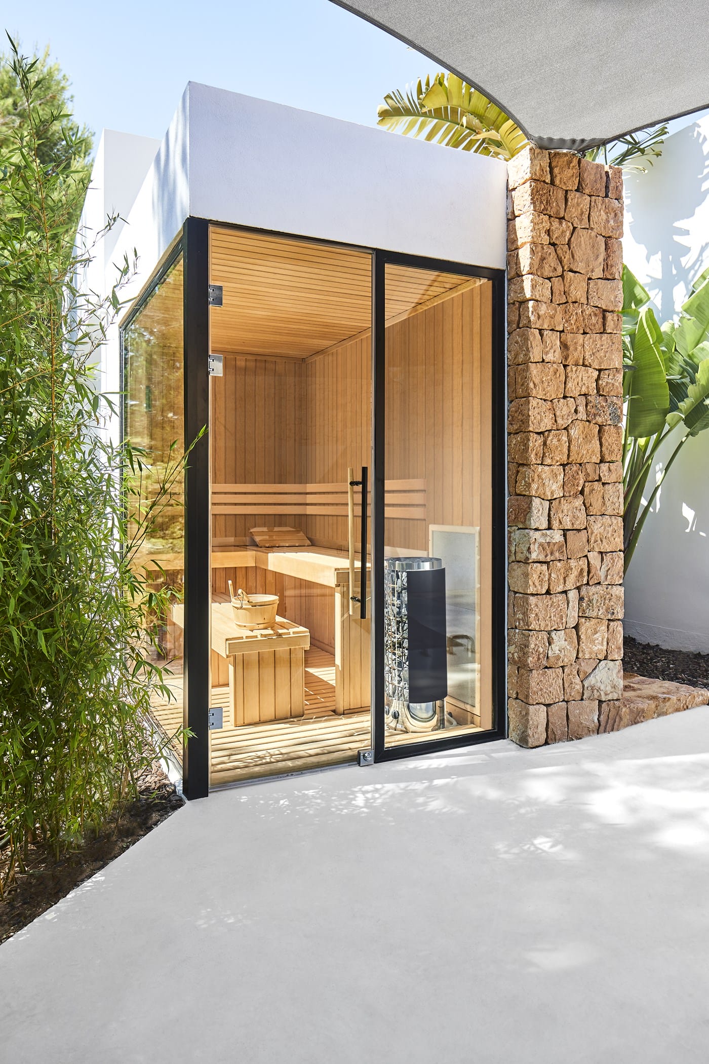 Outside: a rectangular heated infinity pool surrounded by a spacious sun terrace, large outdoor dining area, dedicated chill-out space, and a roof terrace with panoramic sea views. Additional amenities include an outdoor gym and a bespoke sauna with forest views.