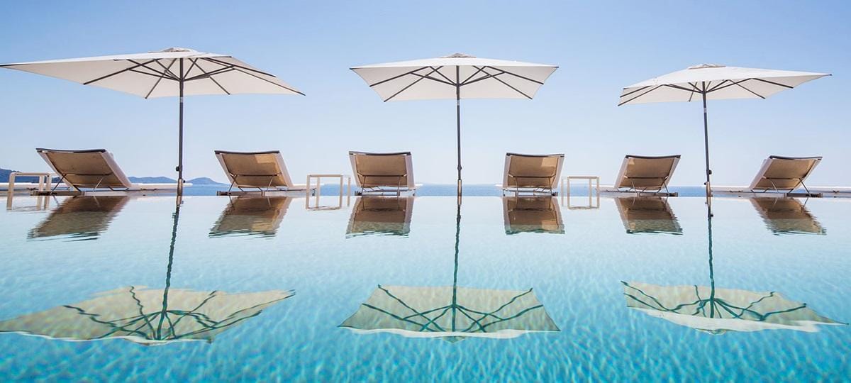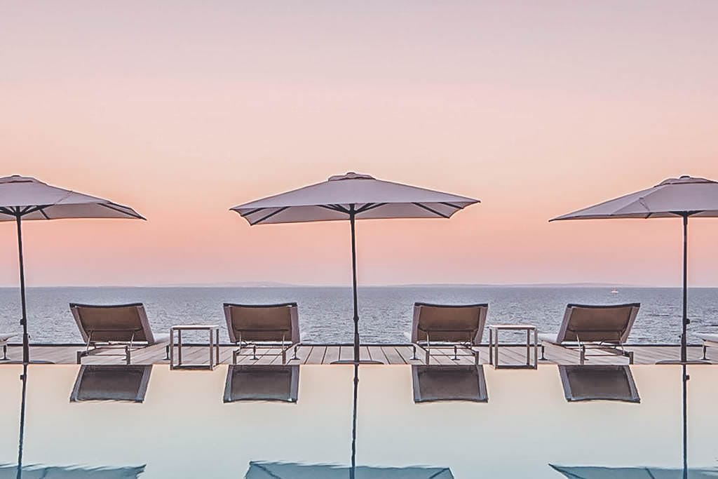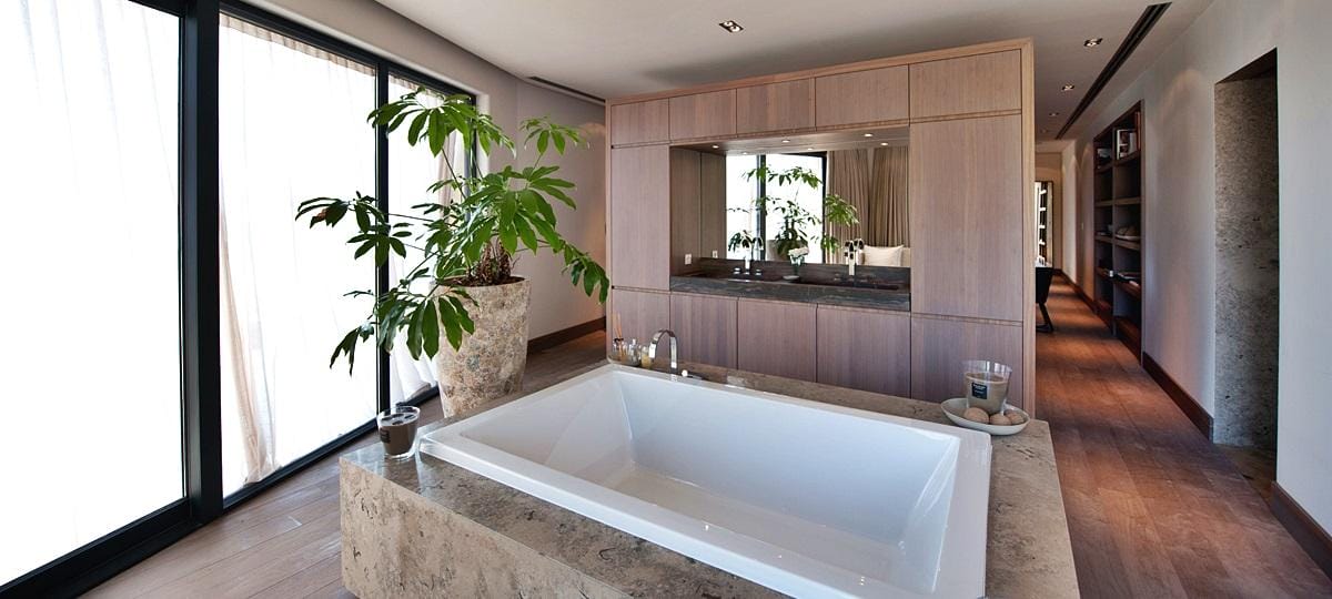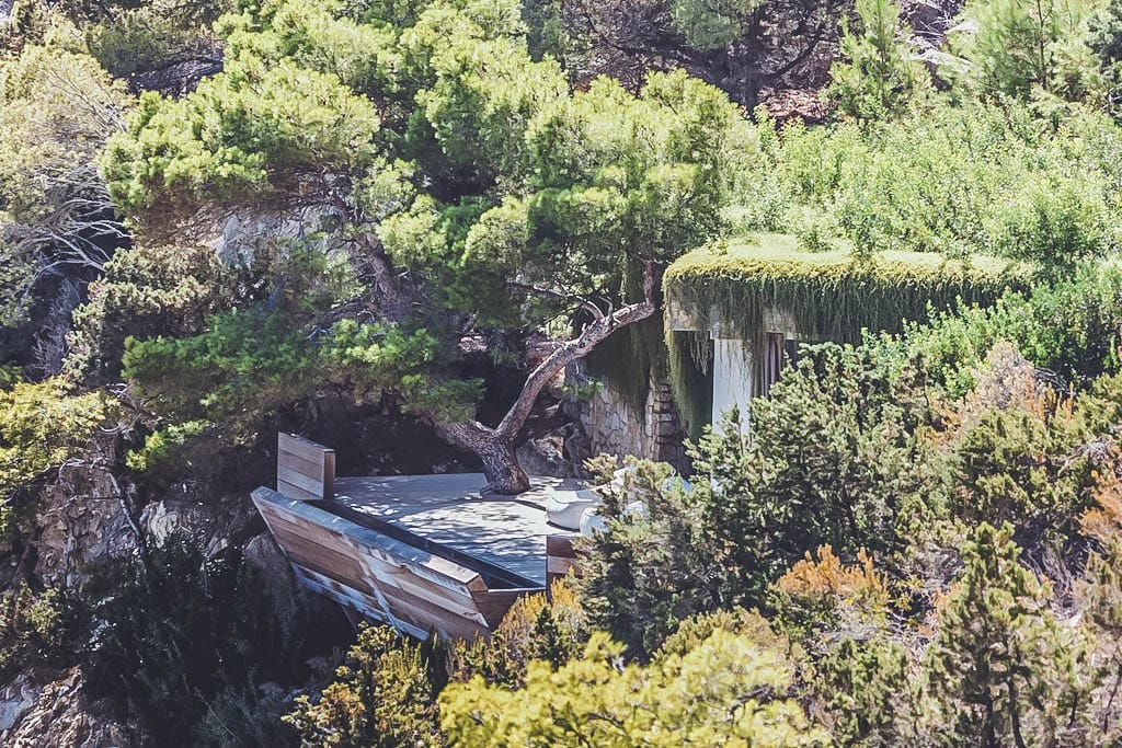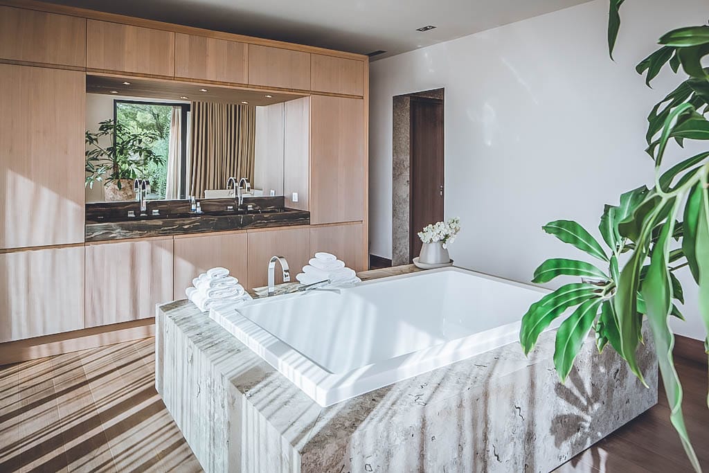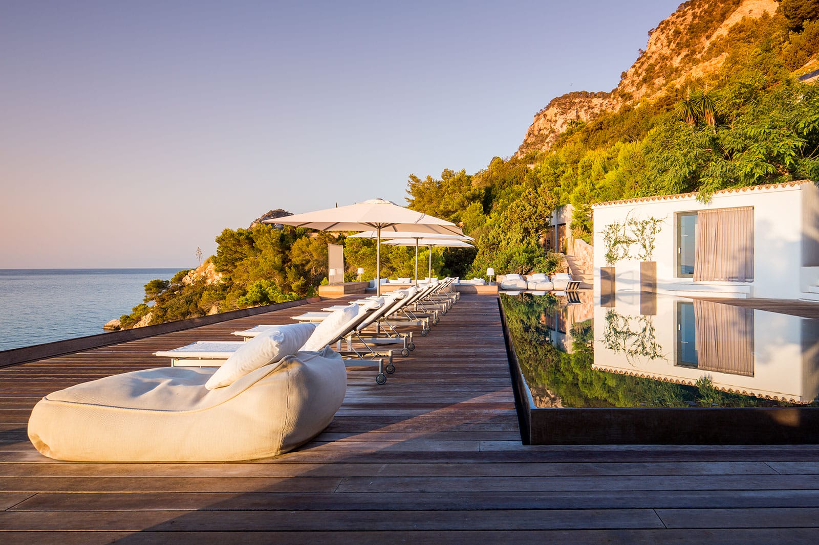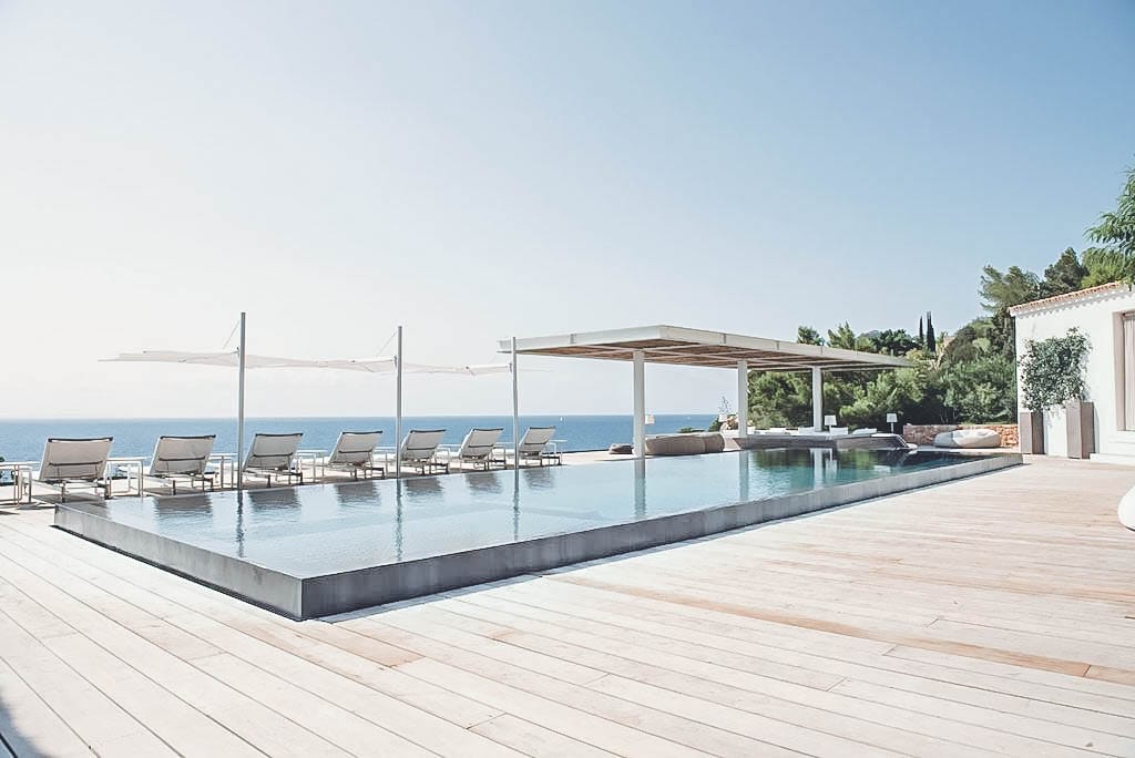 The centrepiece is the infinity pool and carved cliff-side terrace, surrounded by gardens, luxurious sunbeds, shaded seating, and al fresco dining areas. Rooftop has a shaded pavilion with swinging bench.