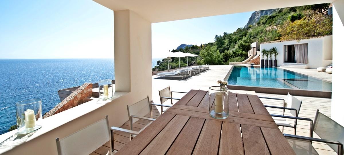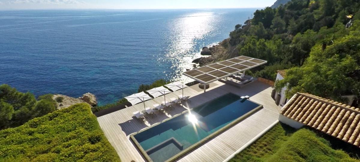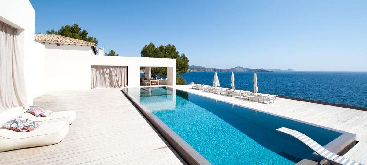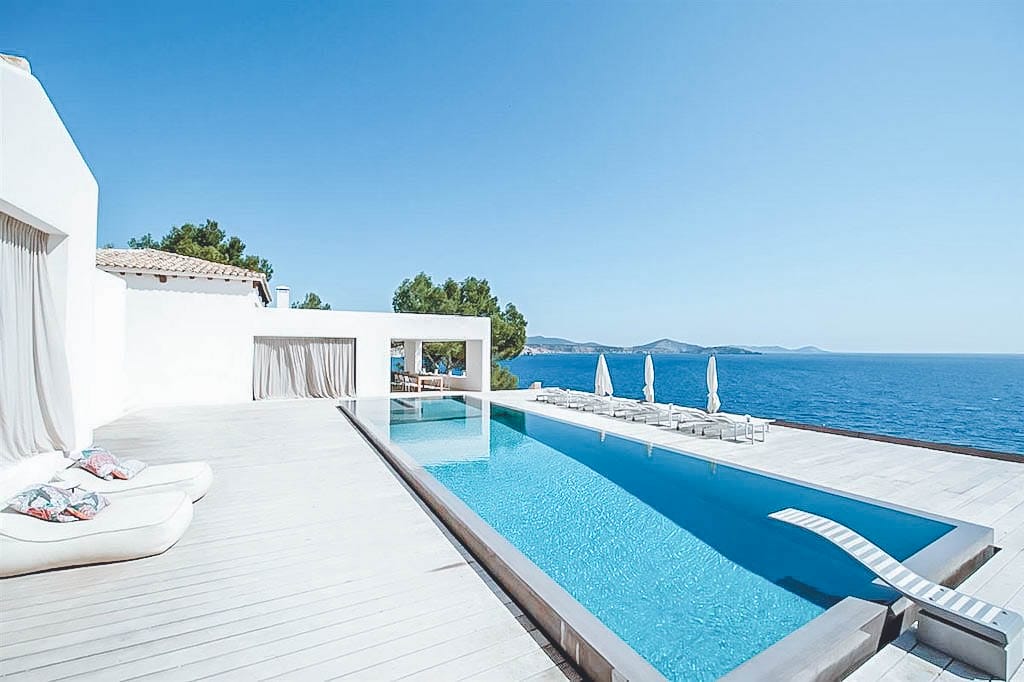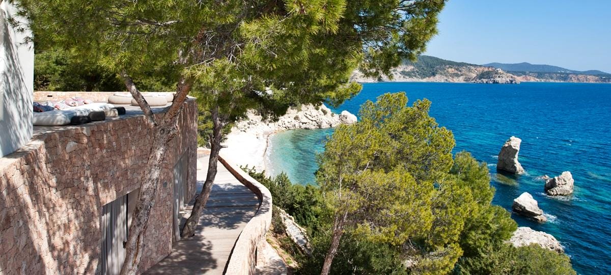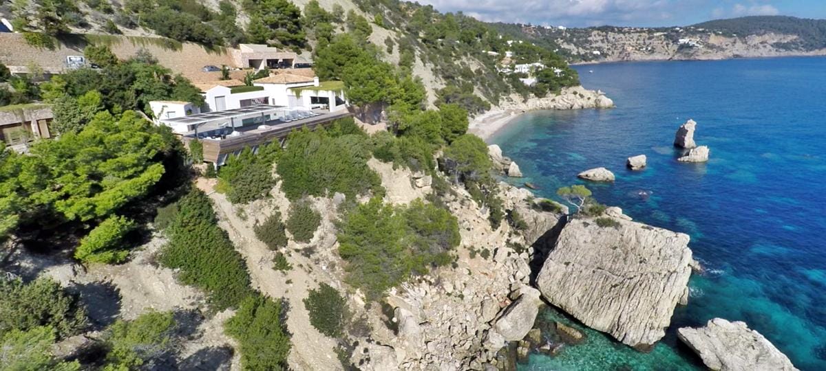 This exceptional front-line villa sits high on a cliffside in exclusive Es Cubells, with direct access to a secluded beach and spectacular uninterrupted views over the Mediterranean Sea, countryside, and coastline. Just a short drive from Ibiza Town.