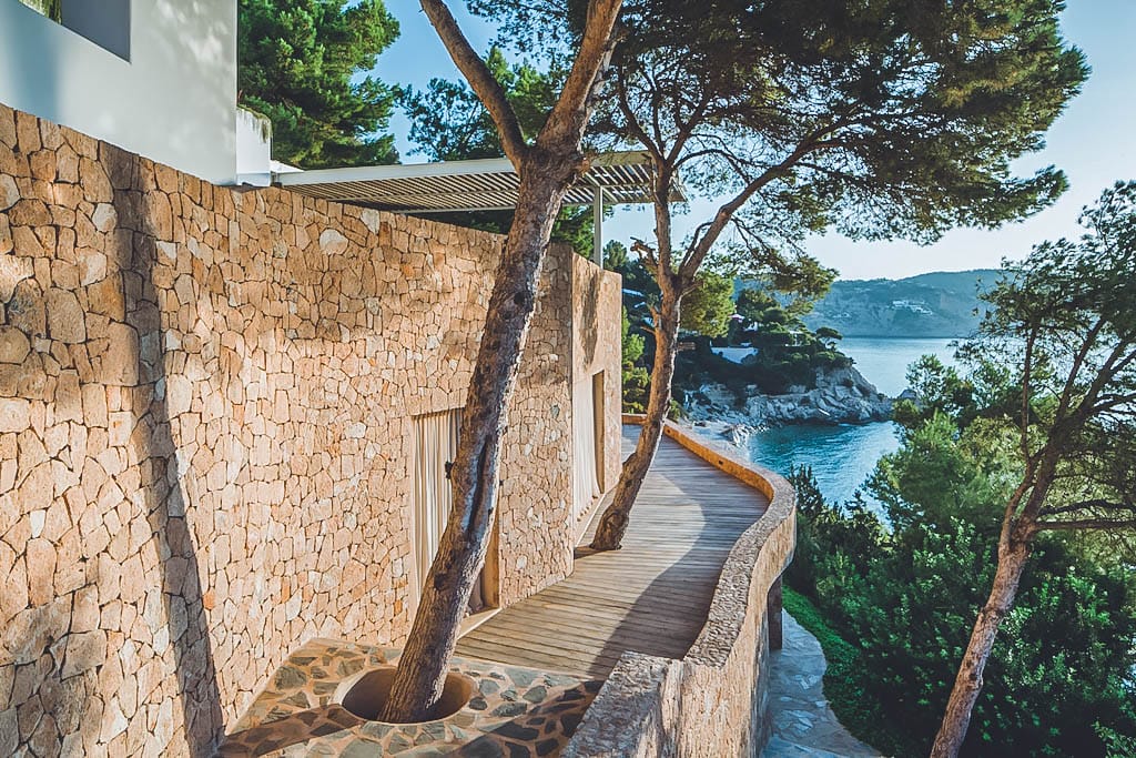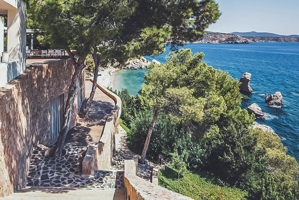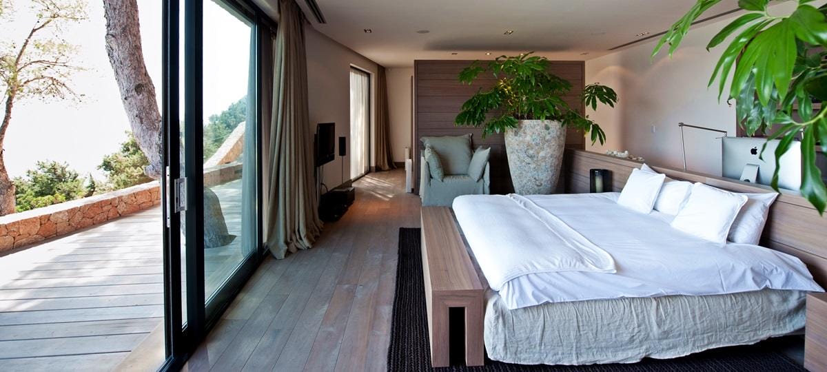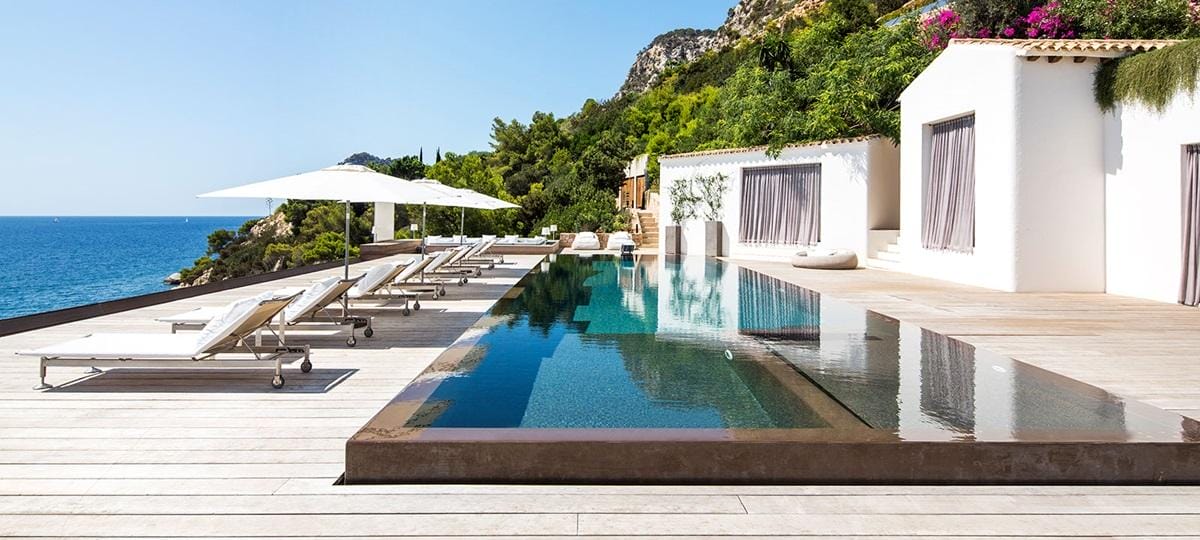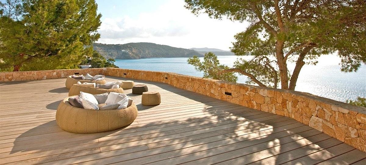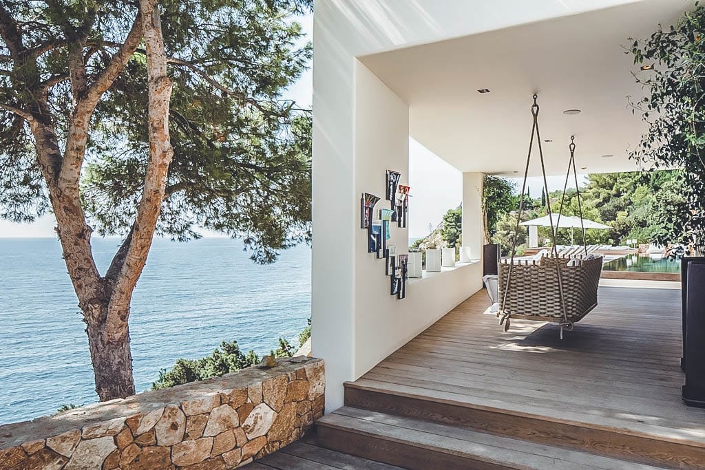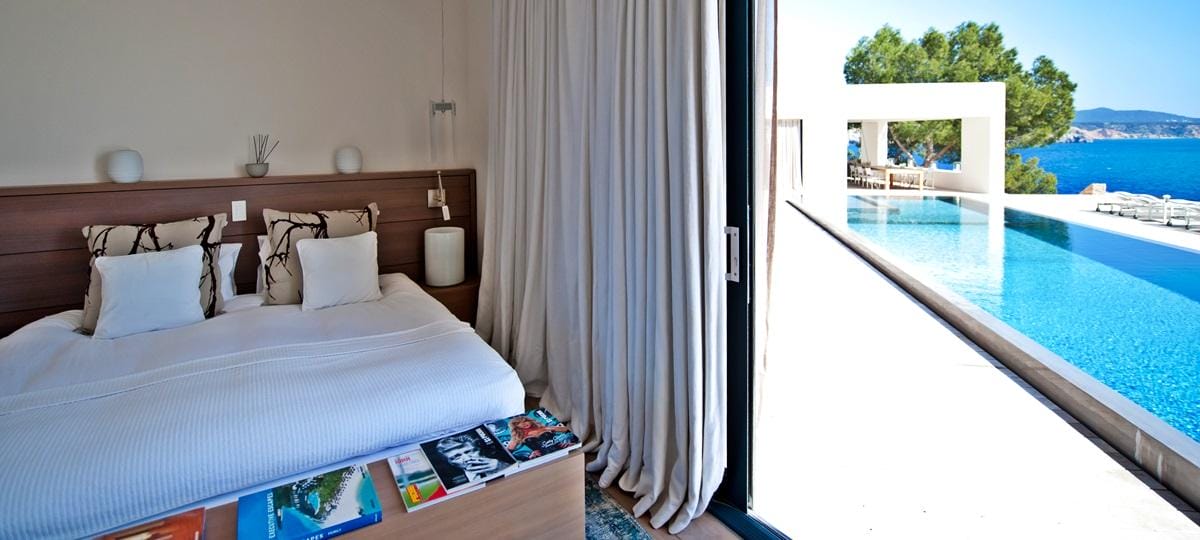 This exceptional front-line villa sits high on a cliffside in exclusive Es Cubells, with direct access to a secluded beach and spectacular uninterrupted views over the Mediterranean Sea, countryside, and coastline. Just a short drive from Ibiza Town.