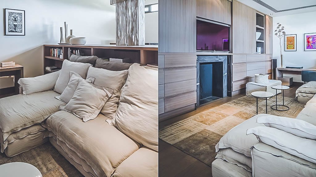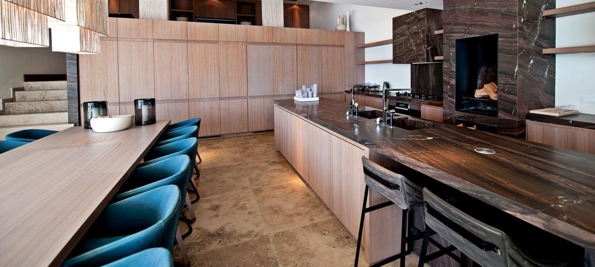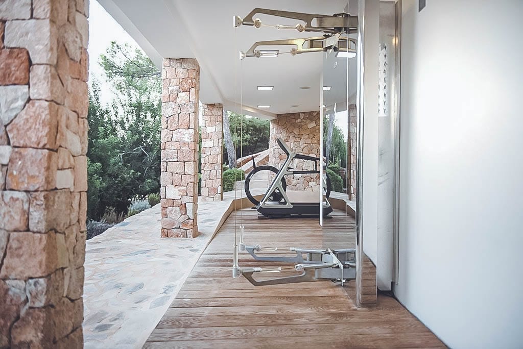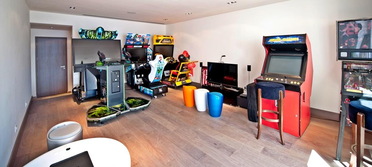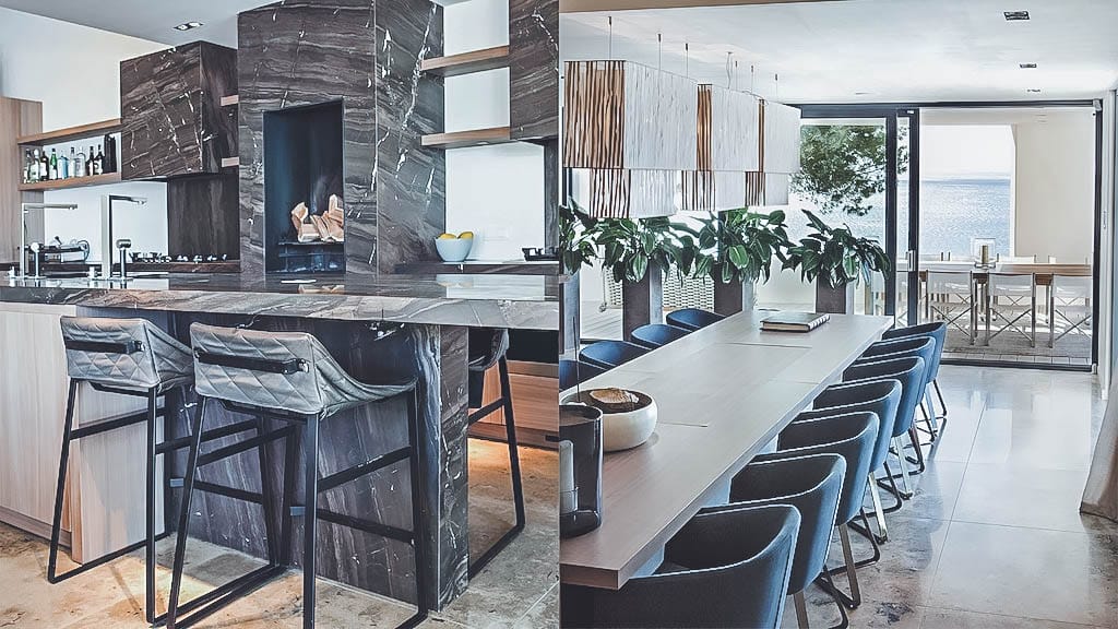 The modern, fully renovated home features sophisticated living spaces, a fully equipped kitchen with centre island, a separate professional kitchen for private chefs, casino table, home cinema, large indoor games room, game tables, projector, and open-air Techno-gym.