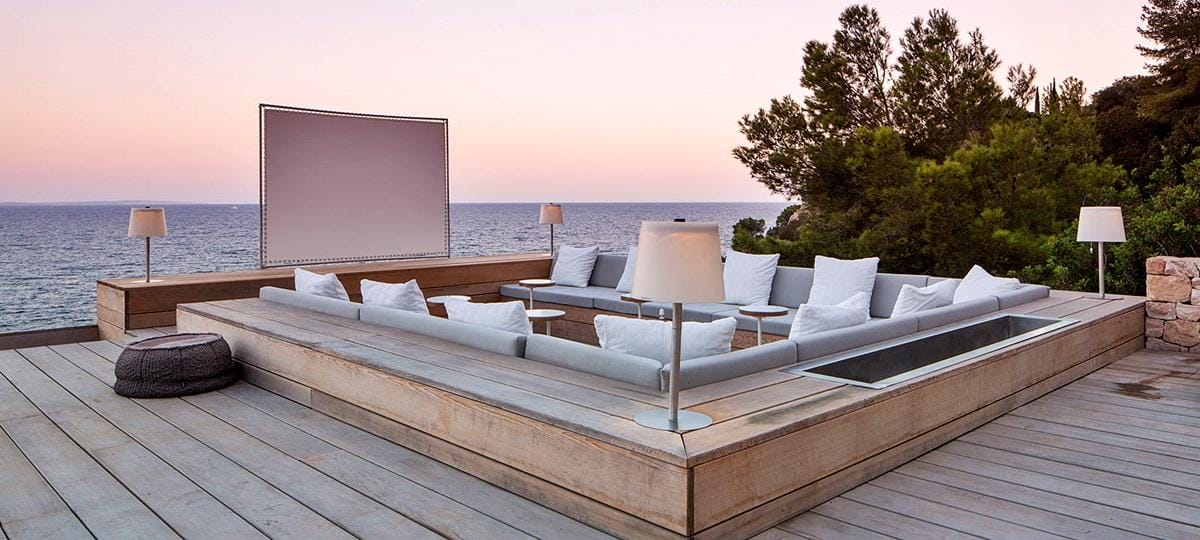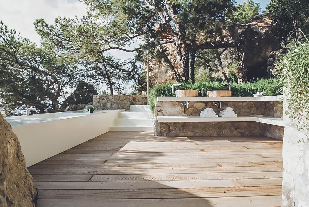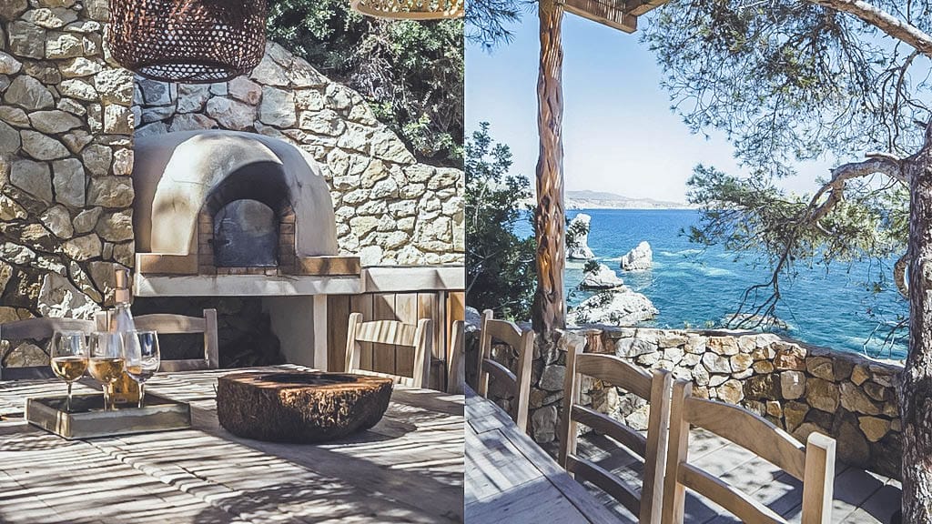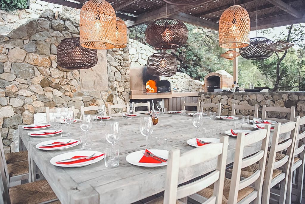Additional highlights include a private spa with steam room and massage tables, plus a pizza oven with large rustic table.