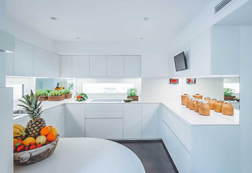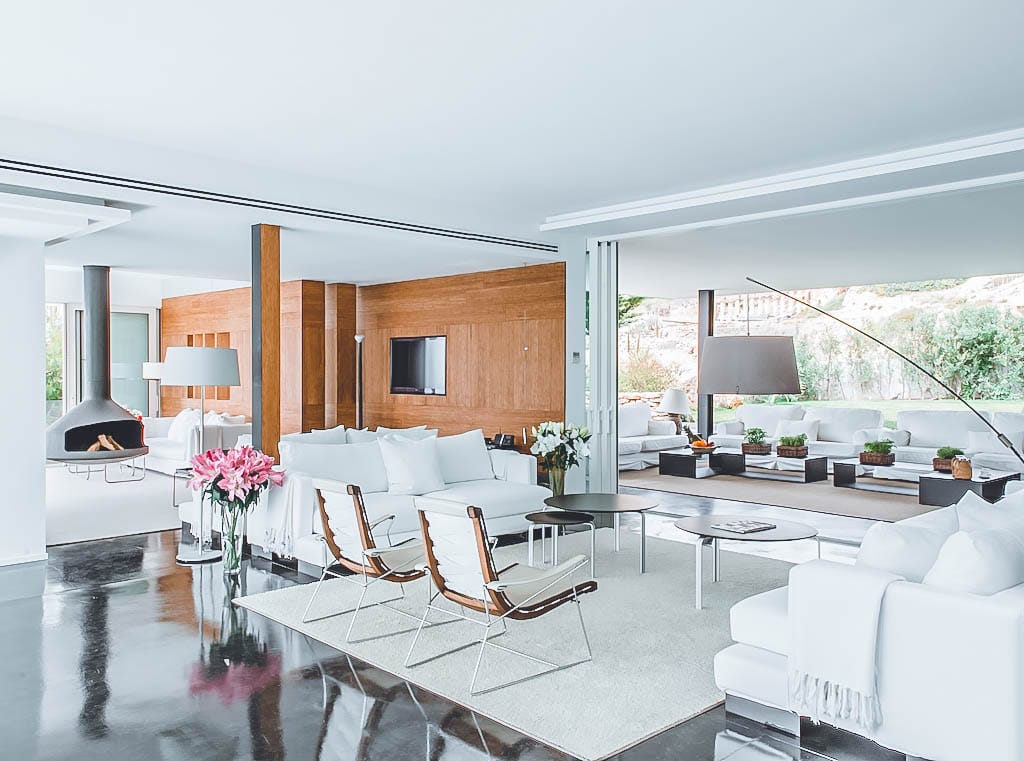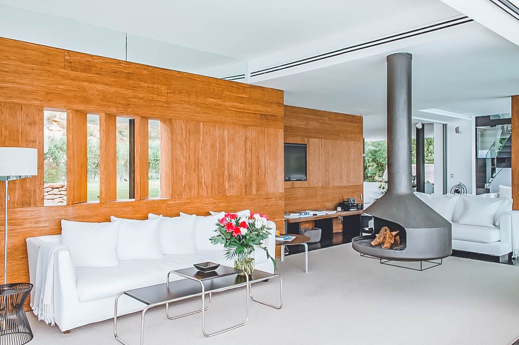 Inside, the expansive living areas feature welcoming luxurious sofas, huge floor-to-ceiling sliding windows that open onto the pool terrace, and a striking ceiling-mounted wood-burning stove. The bright, modern kitchen is fully equipped with all high-end appliances, and there is an inviting dining area.