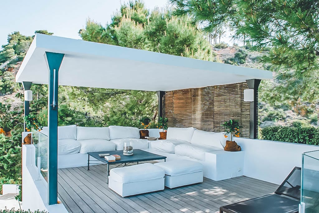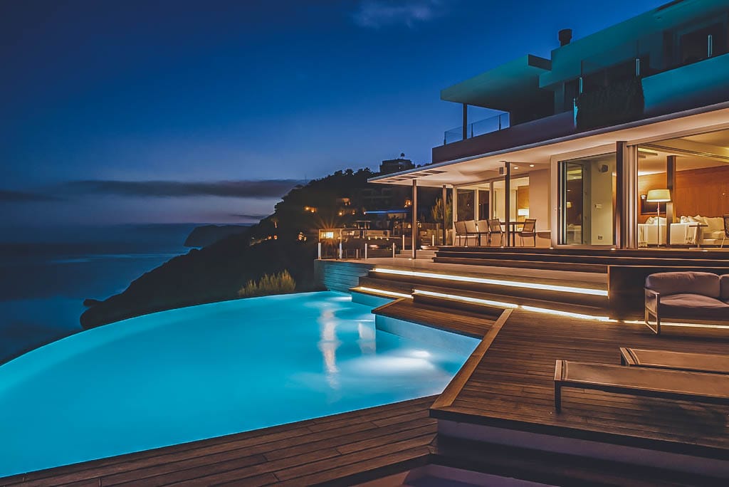 The jewel in the crown is the breathtaking infinity pool overlooking the cliff edge, surrounded by a fully decked terrace with ample sun loungers. It leads to a shaded chill-out area with vast outdoor daybeds and sofas, plus a second expansive covered luxury lounge with splendid al fresco dining space — both offering uninterrupted sea views, perfect for entertaining or quiet relaxation.