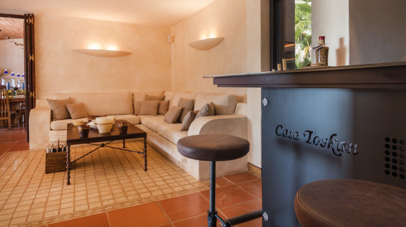 The main house features a spacious living room with bar, indoor dining for 12, a fully equipped professional kitchen, TV/cinema room with fireplace, and a master suite with en-suite bathroom, dressing room, and terrace. Additional bedrooms and annexes (including two apartments with kitchenettes) provide a total of 6 en-suite bedrooms, all with independent access and sea views for maximum privacy.