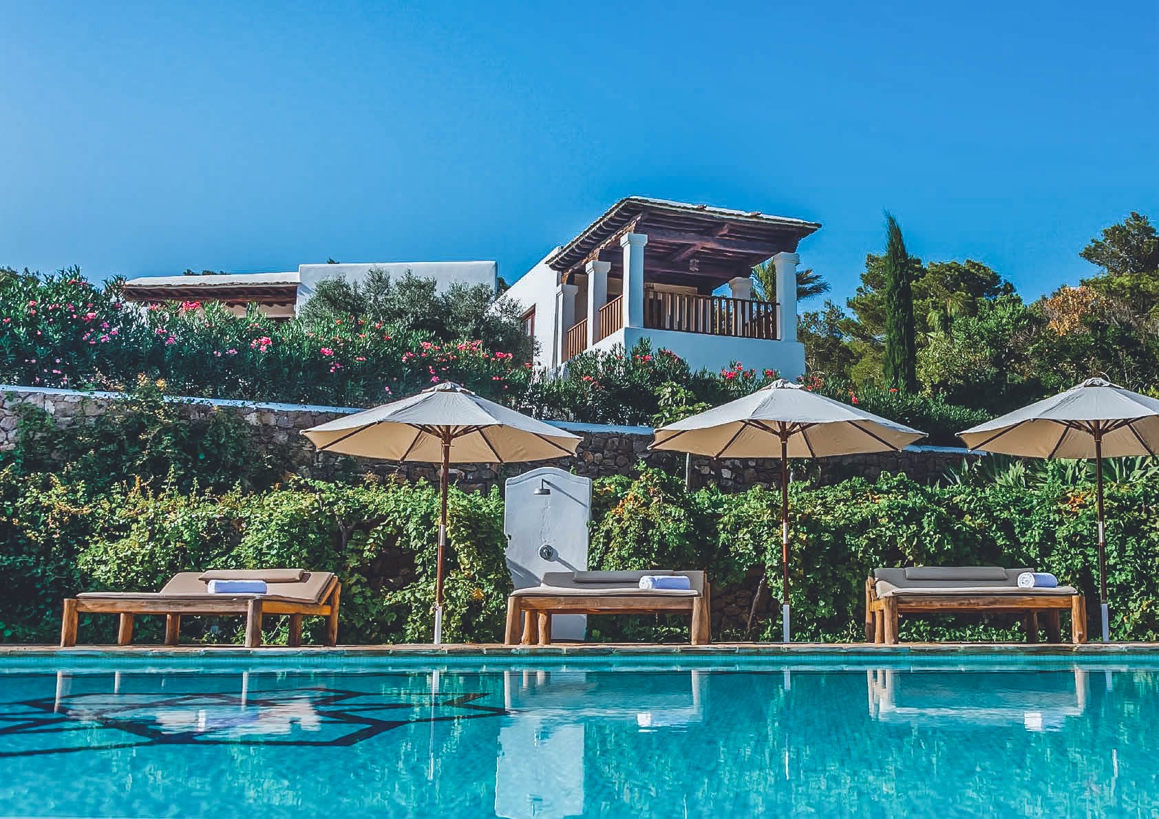 Outside: an inviting swimming pool, shaded pergola, multiple terraces, shaded dining areas, cool relaxation beds, and sunny lounge zones surrounded by lush gardens.