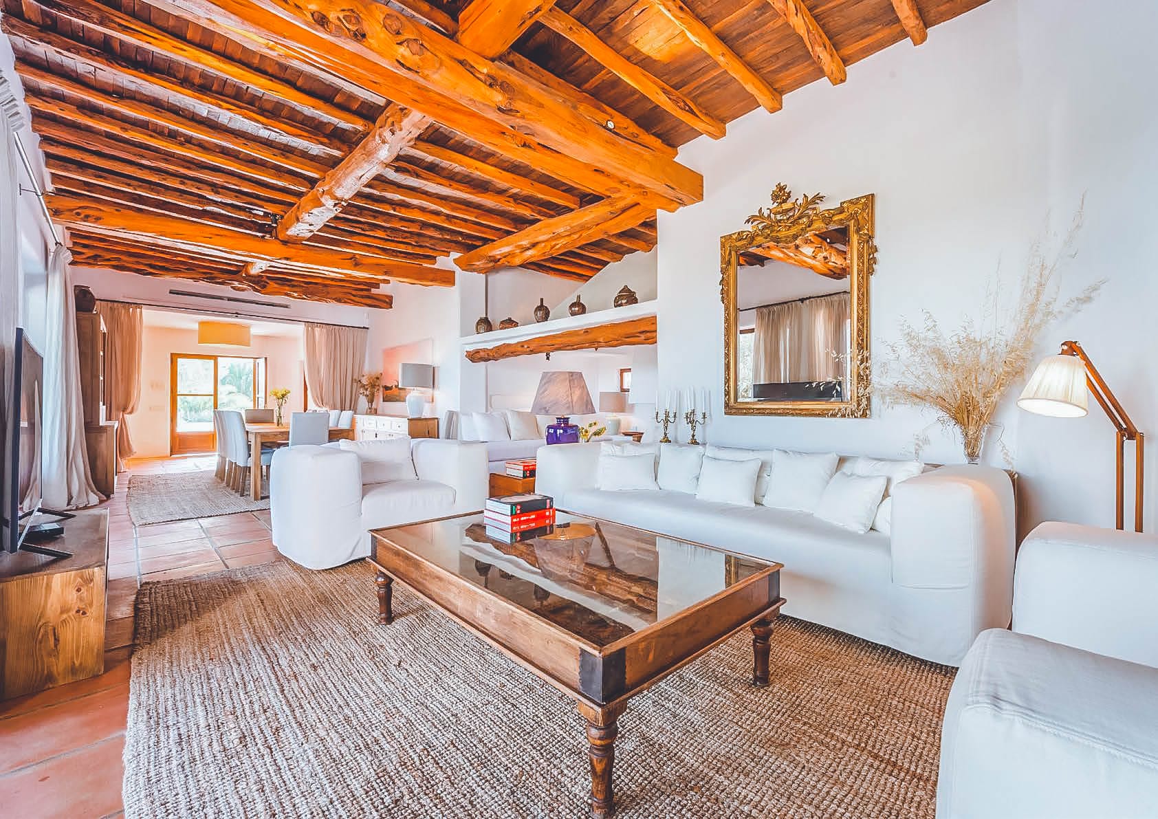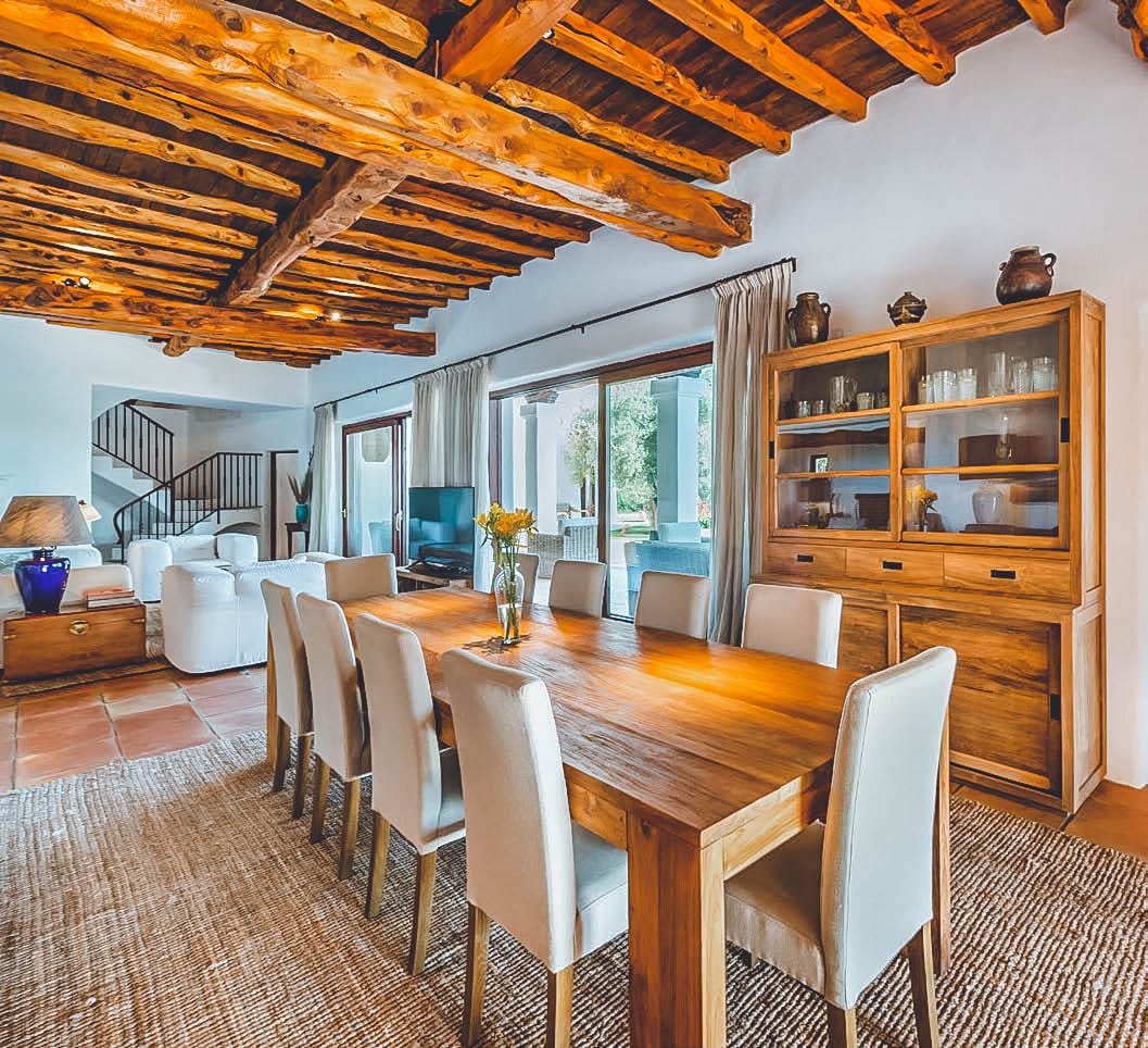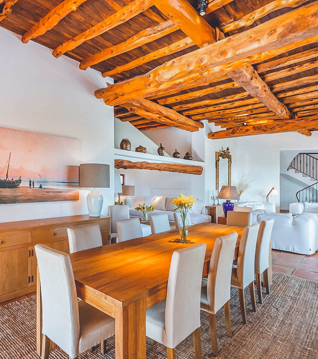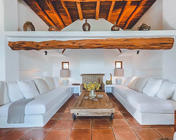 The interiors beautifully blend traditional rustic elements — stunning sabina wooden beams and terracotta tiles — with timeless designer furniture and fresh modern furnishings, creating a warm and welcoming atmosphere.