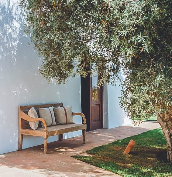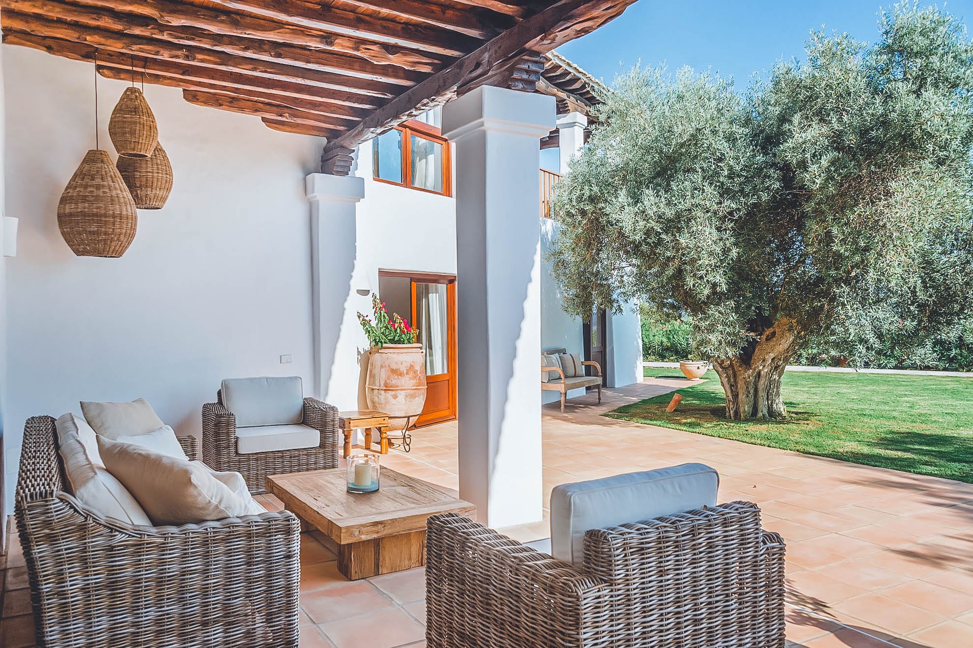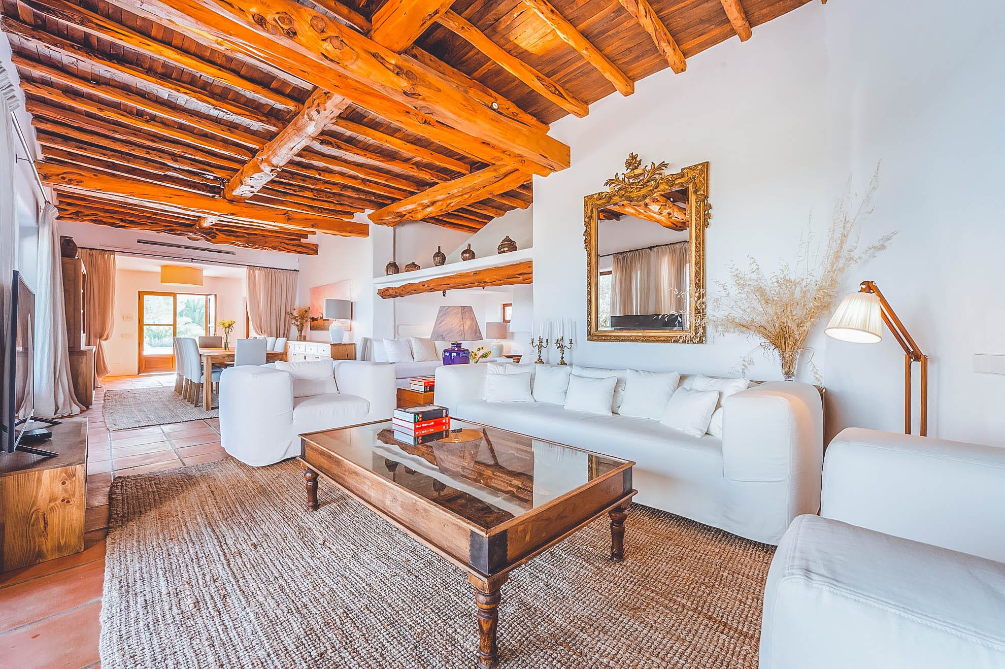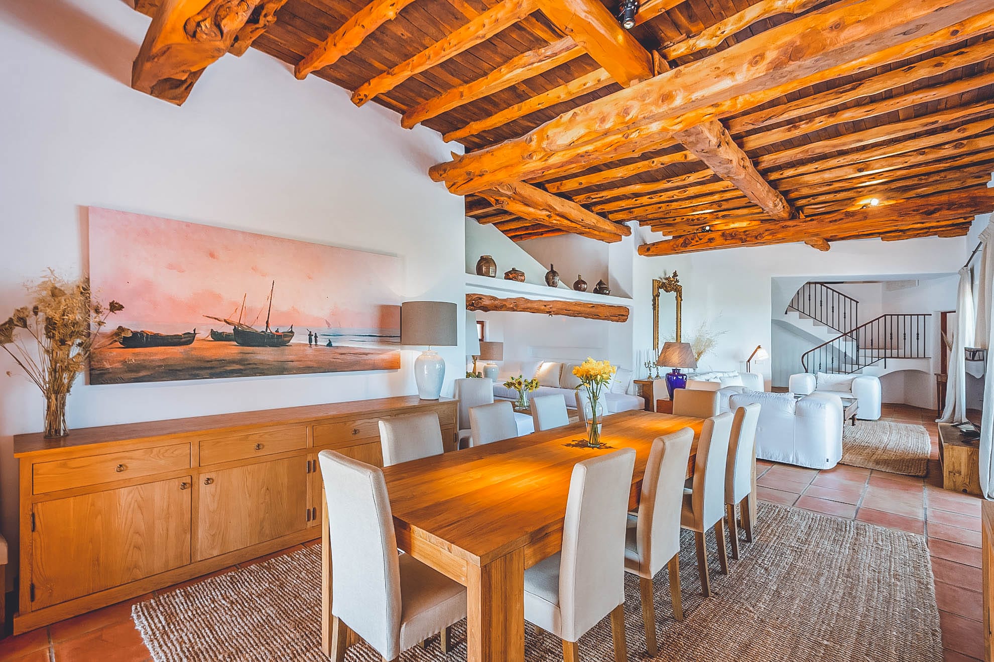 The interiors beautifully blend traditional rustic elements — stunning sabina wooden beams and terracotta tiles — with timeless designer furniture and fresh modern furnishings, creating a warm and welcoming atmosphere.
