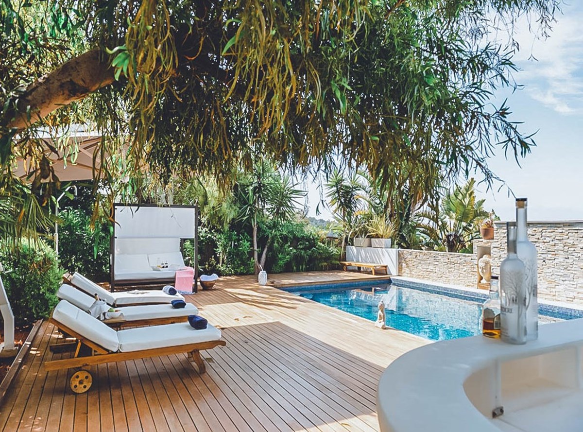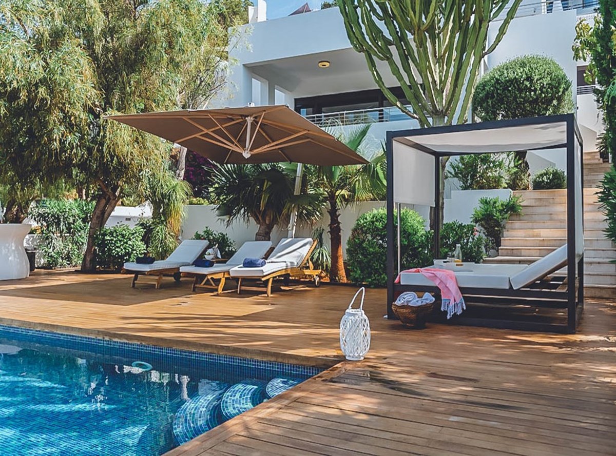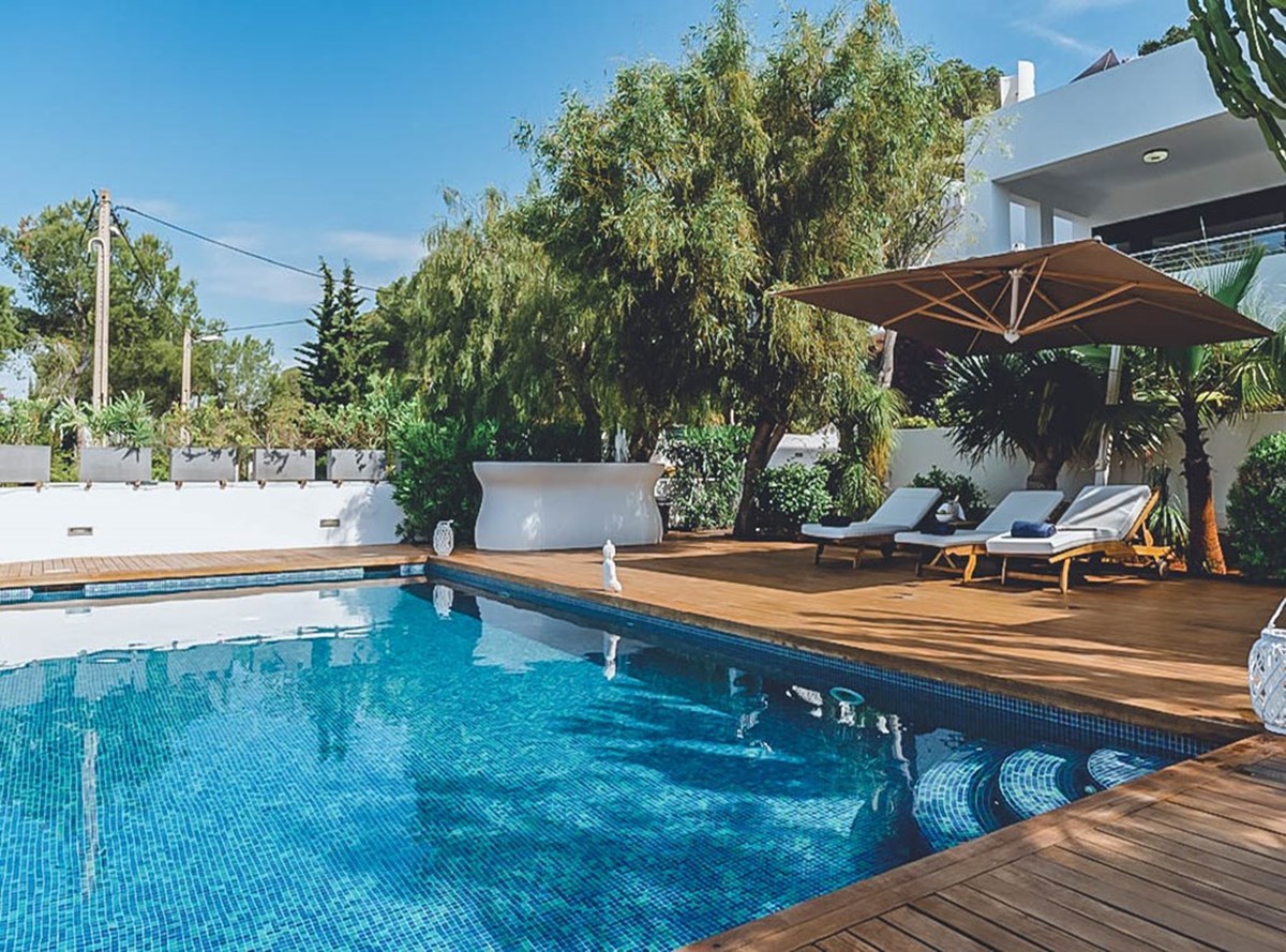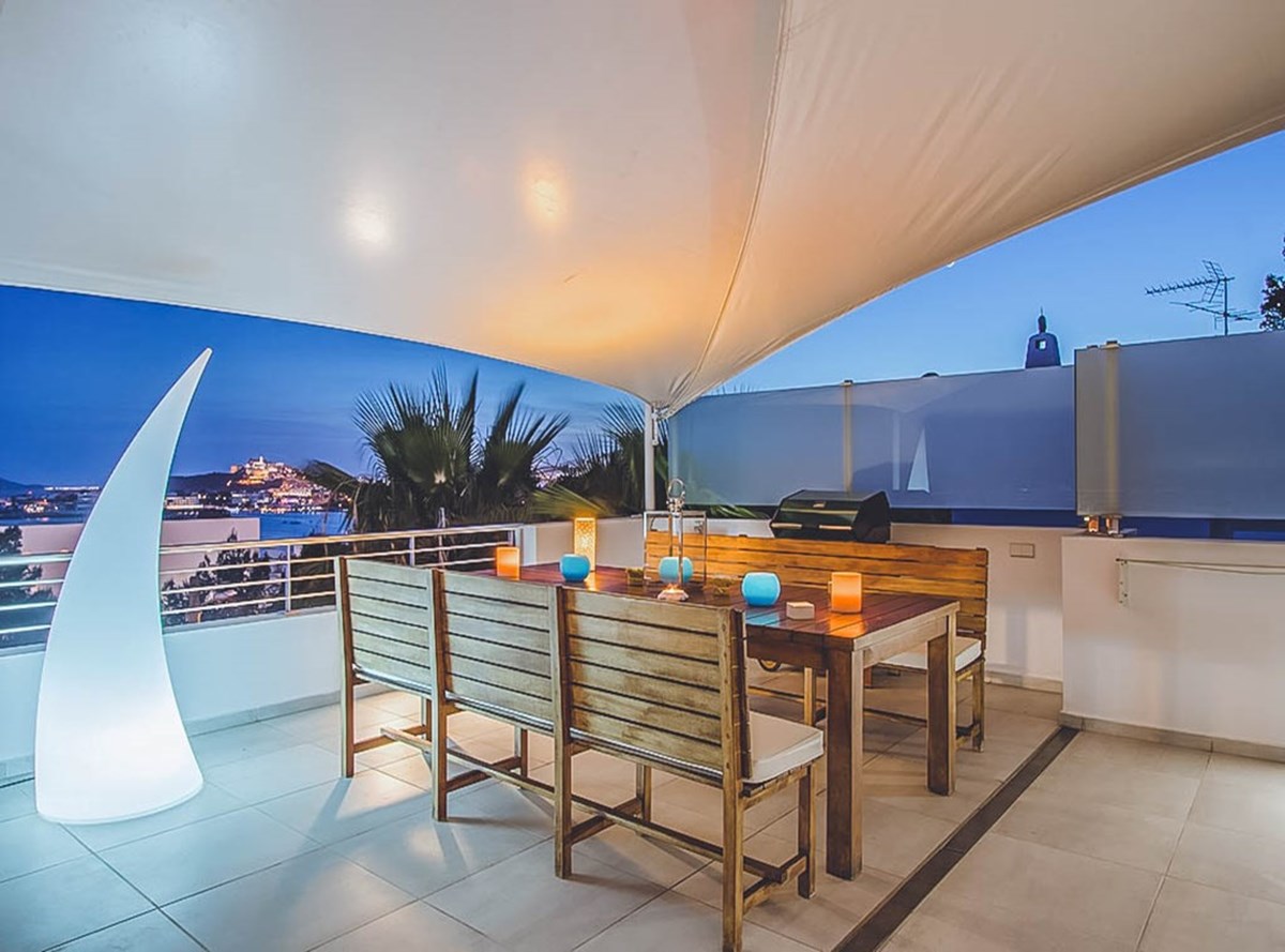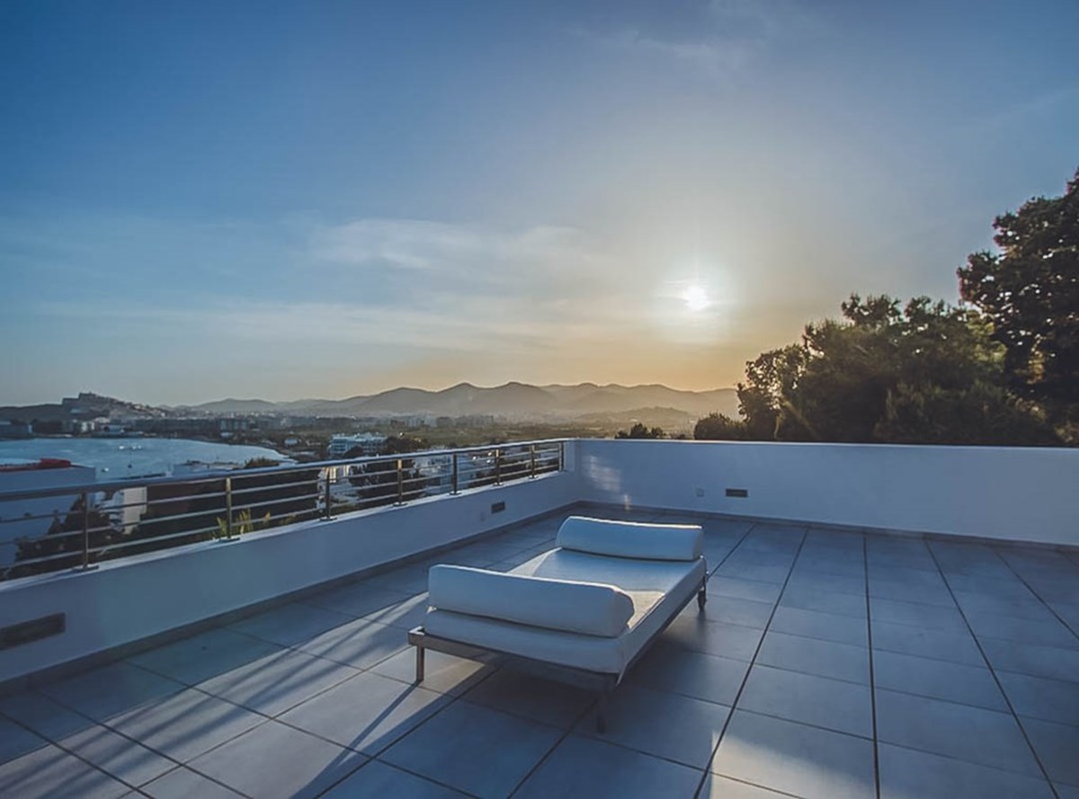 Outside: a spacious terrace with outdoor lounge, summer dining area, gas barbecue, wooden decked pool area, bespoke bar, and relaxing hammocks. Perfect for breakfast to starlit dinners while enjoying uninterrupted sea views and the dazzling lights of Ibiza Town.