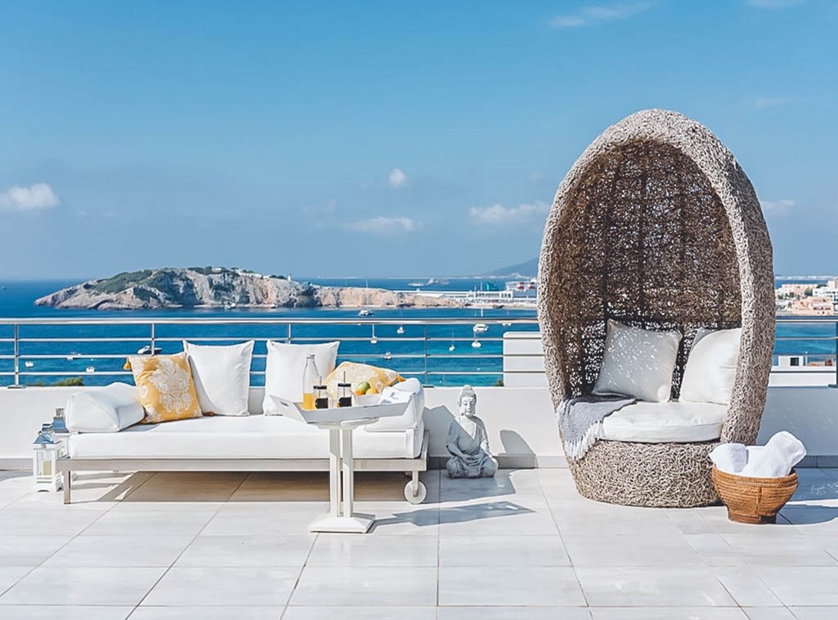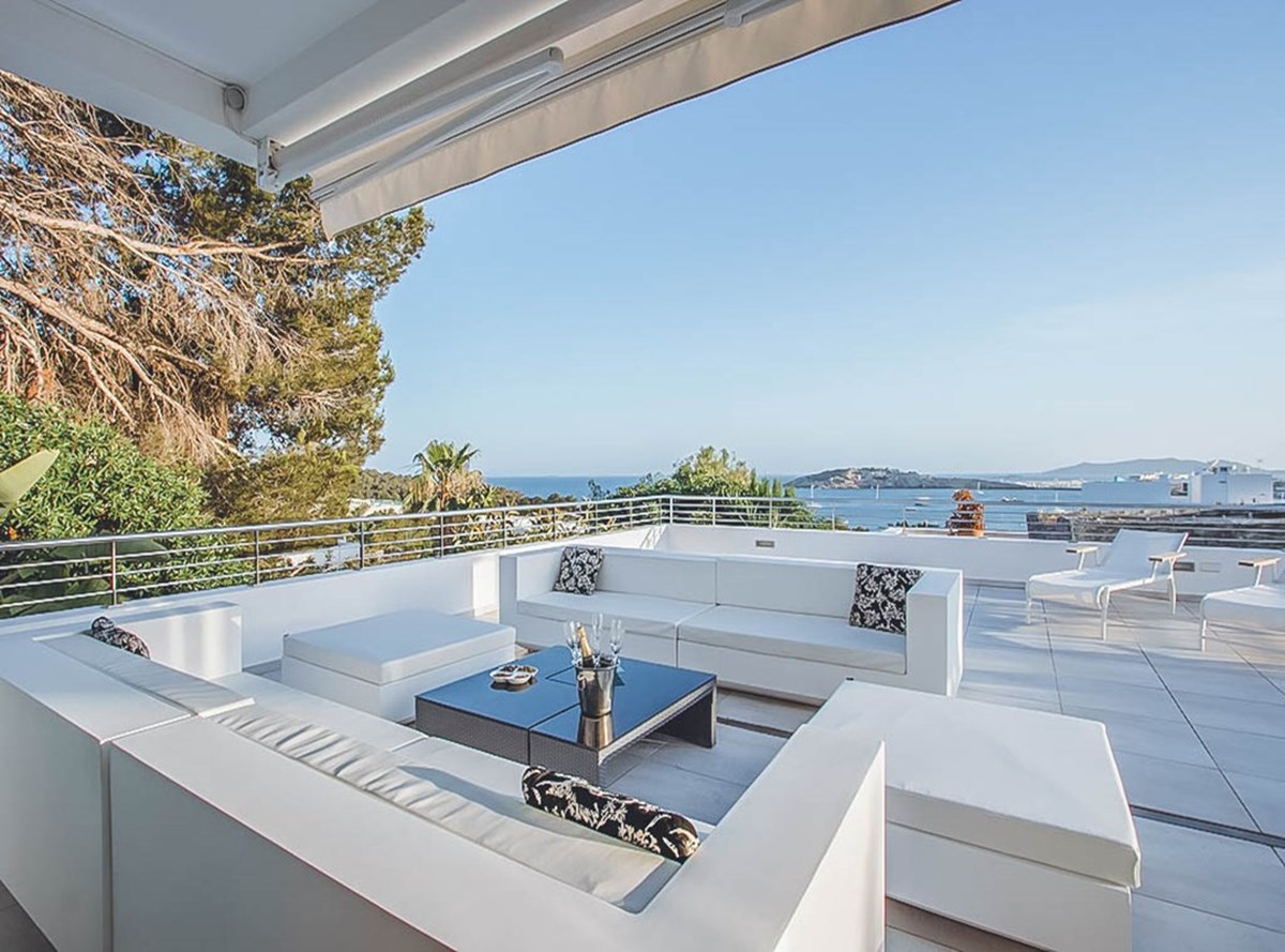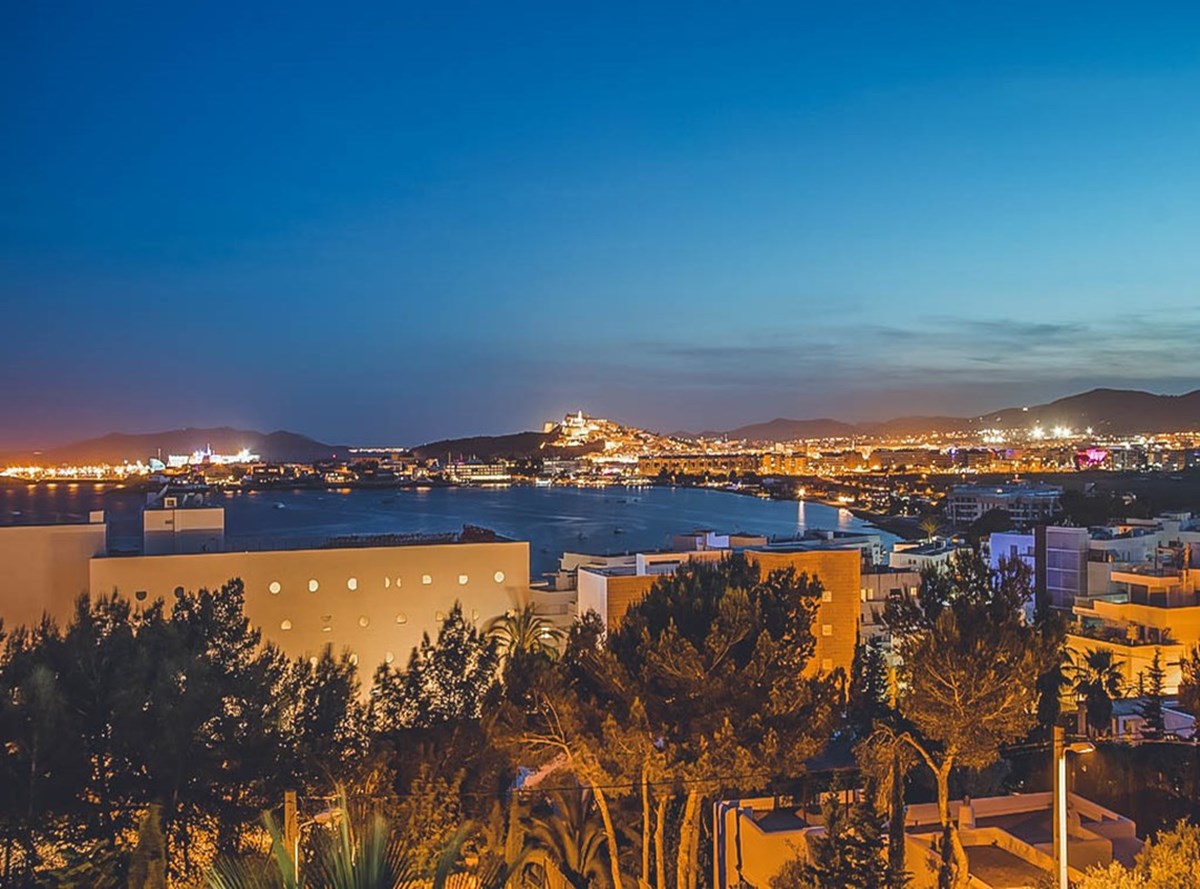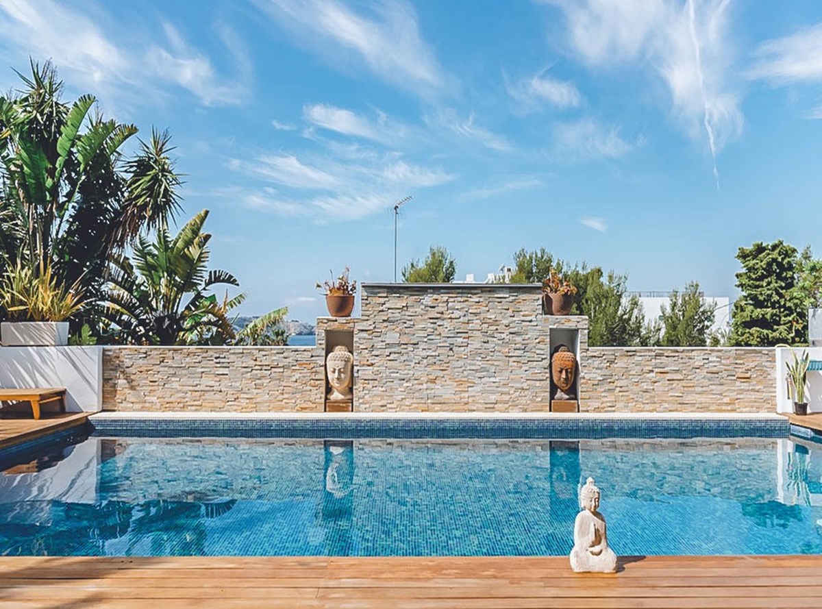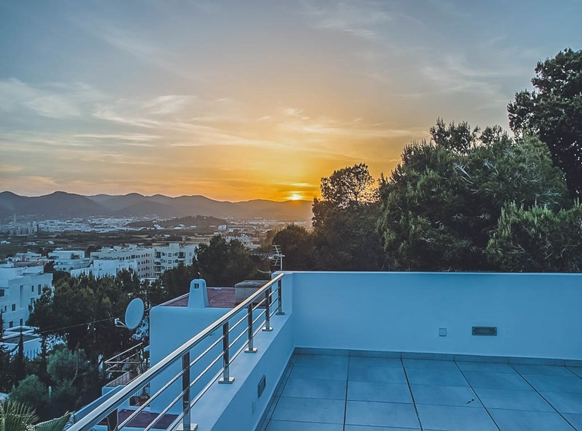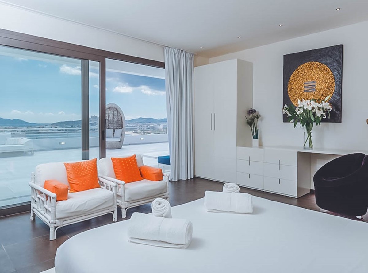 Outside: a spacious terrace with outdoor lounge, summer dining area, gas barbecue, wooden decked pool area, bespoke bar, and relaxing hammocks. Perfect for breakfast to starlit dinners while enjoying uninterrupted sea views and the dazzling lights of Ibiza Town.