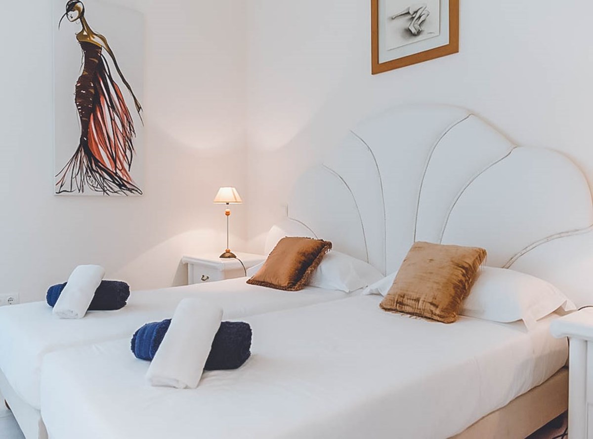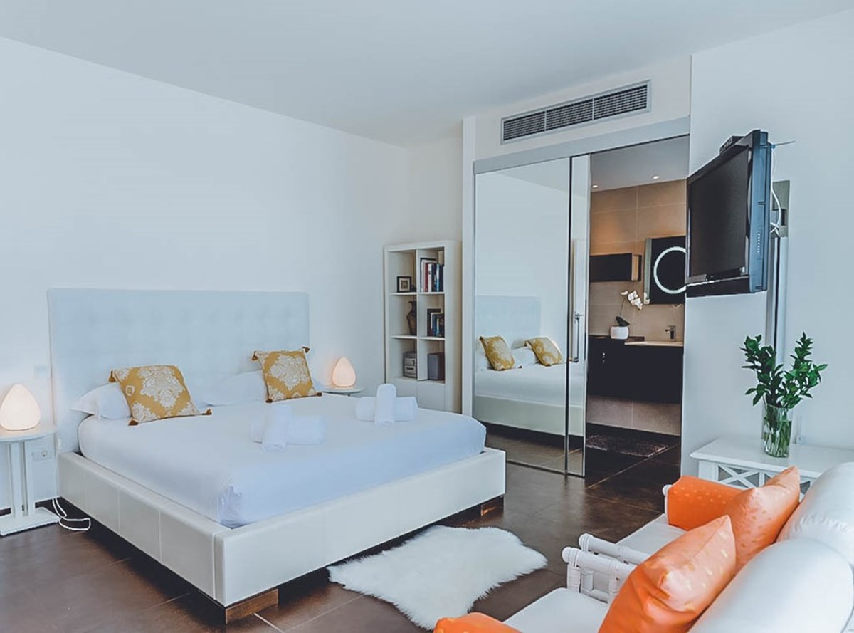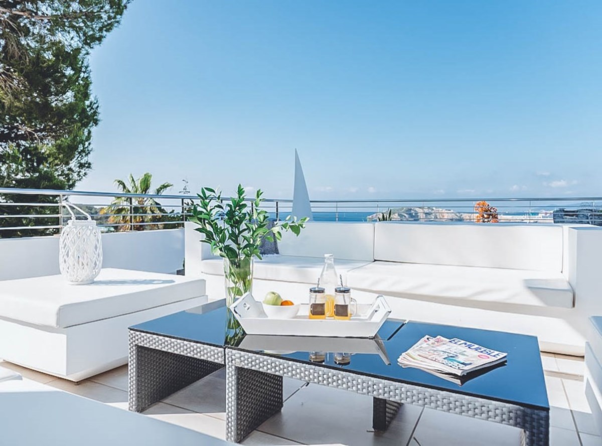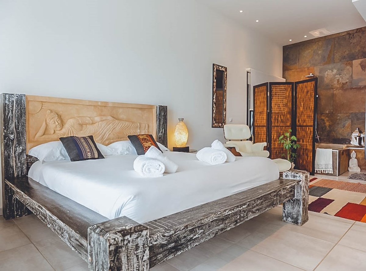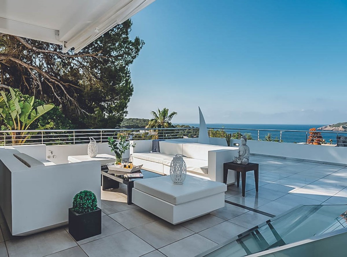 Outside: a spacious terrace with outdoor lounge, summer dining area, gas barbecue, wooden decked pool area, bespoke bar, and relaxing hammocks. Perfect for breakfast to starlit dinners while enjoying uninterrupted sea views and the dazzling lights of Ibiza Town.