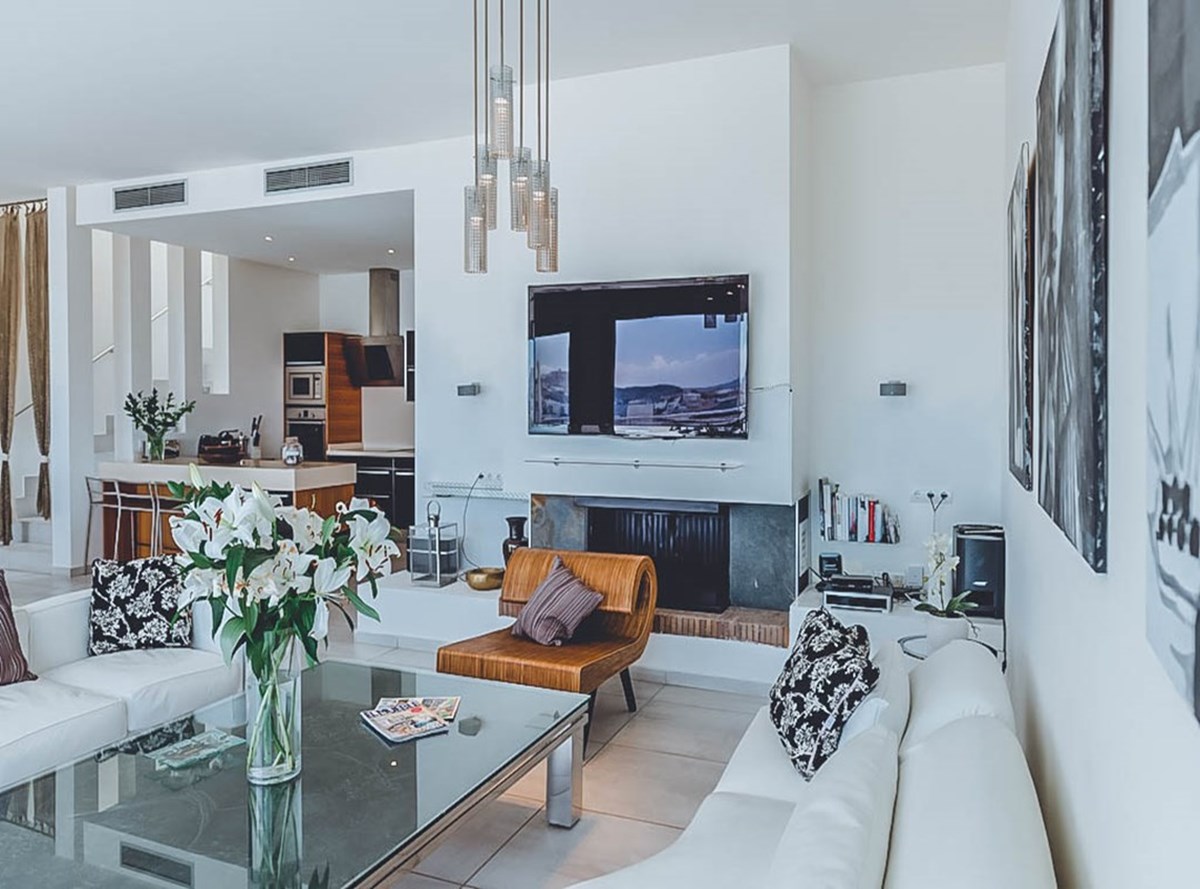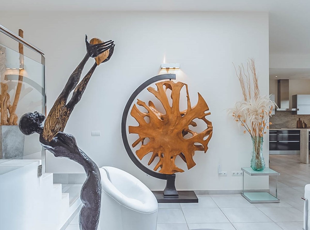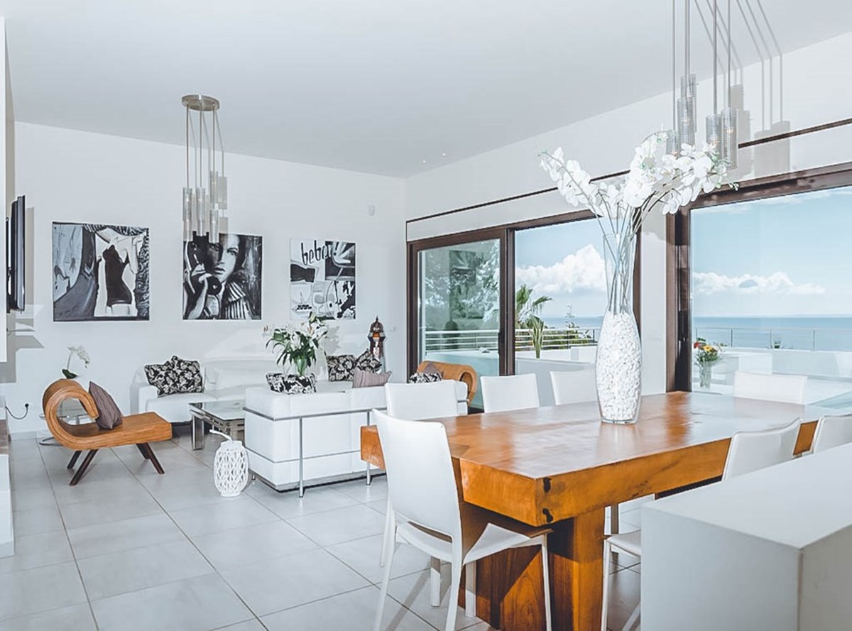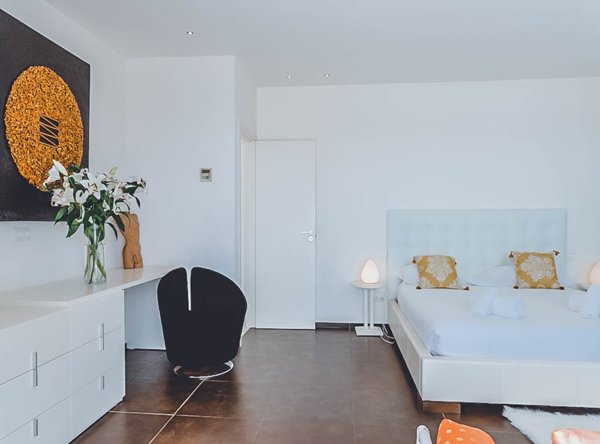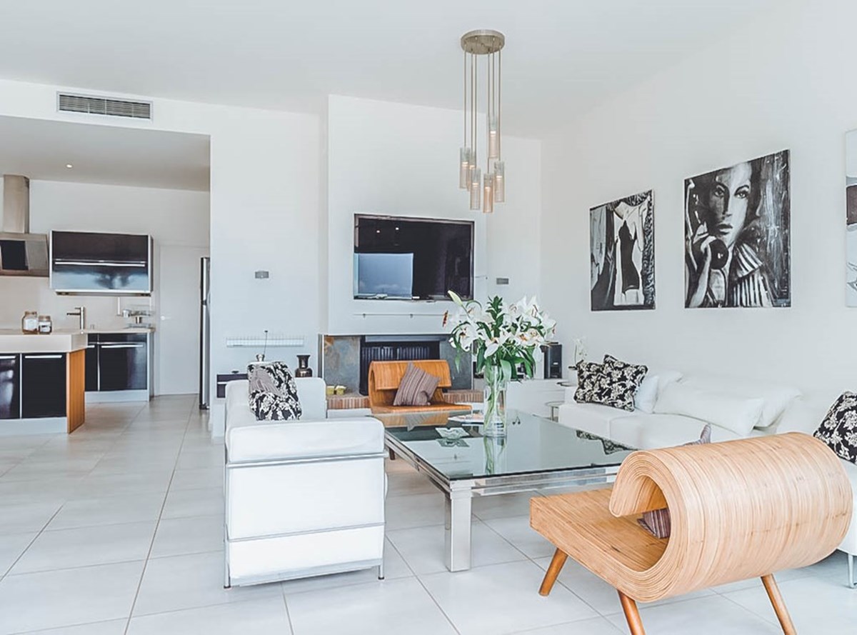 Spread over three levels, the villa features five outstanding bedrooms, all with en-suite bathrooms, plus two additional guest bathrooms. The sleek, monochrome interiors are brightened with colourful contemporary decor, artworks, and unique sculptures.