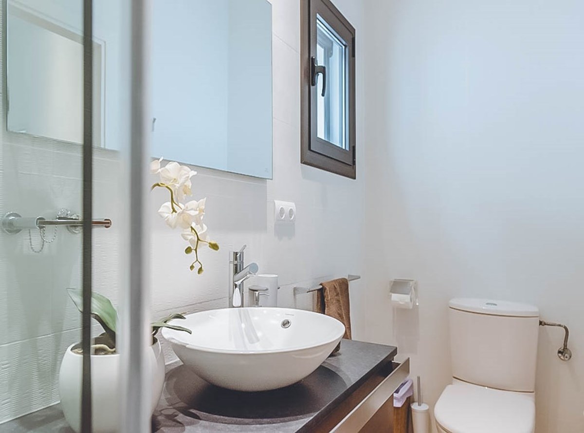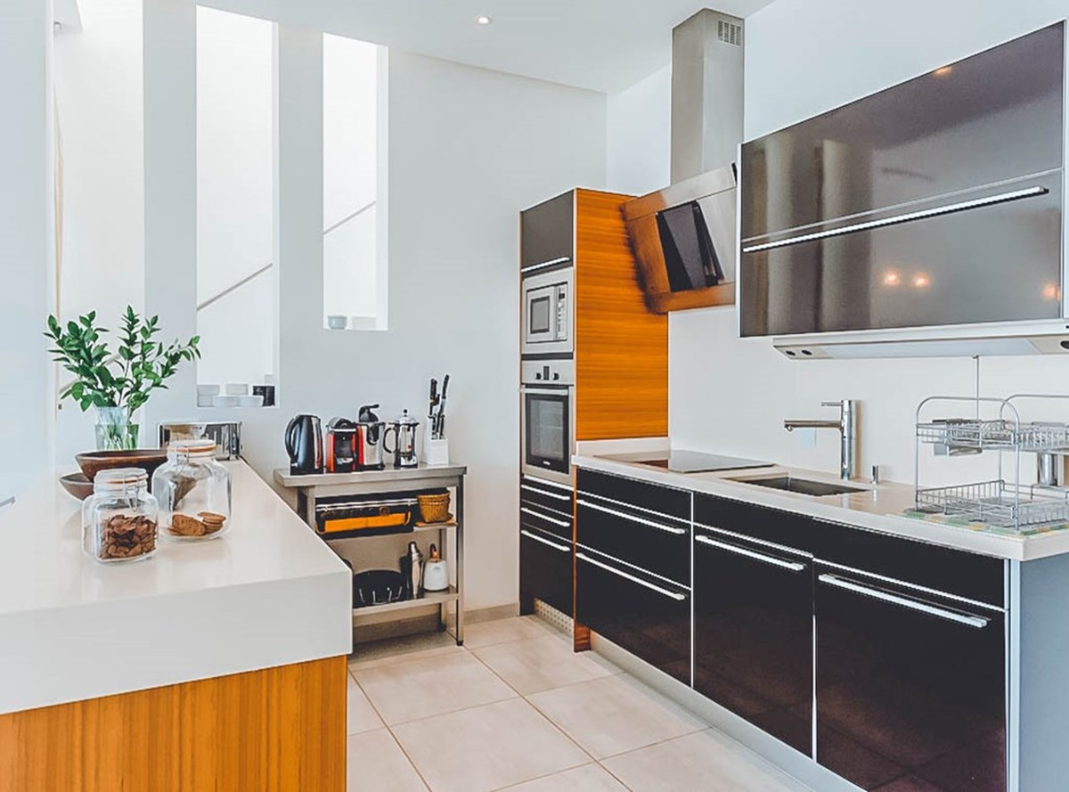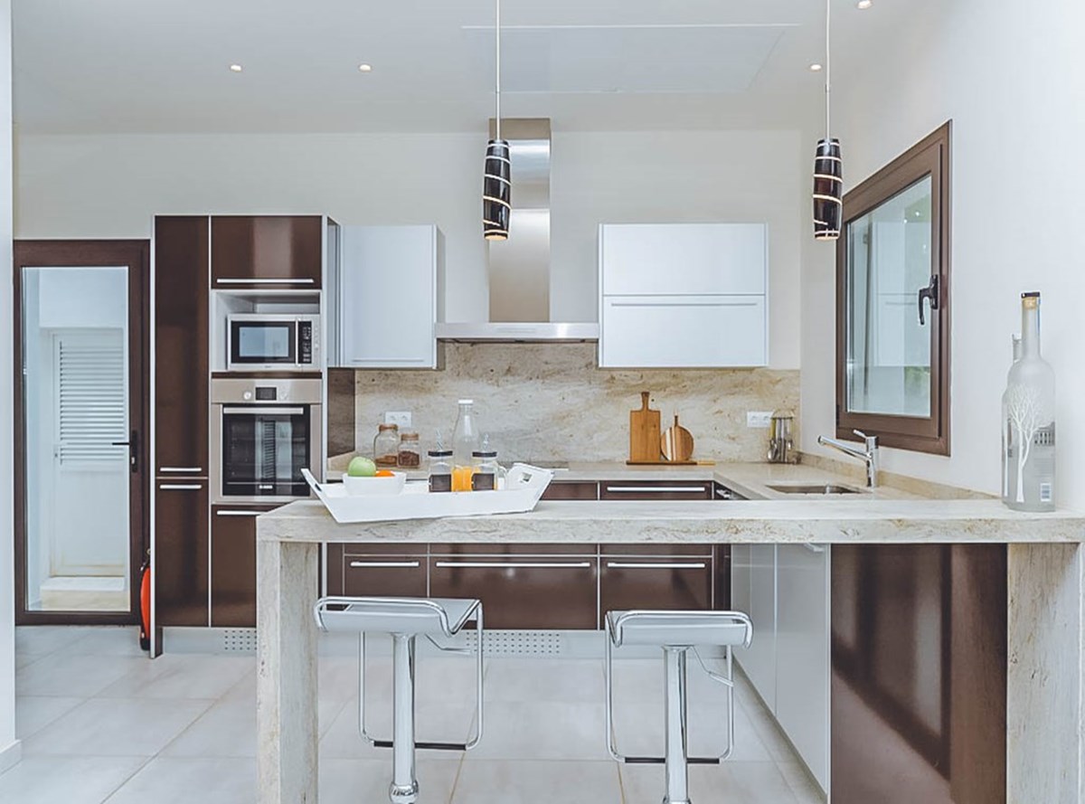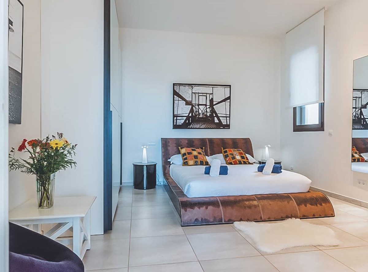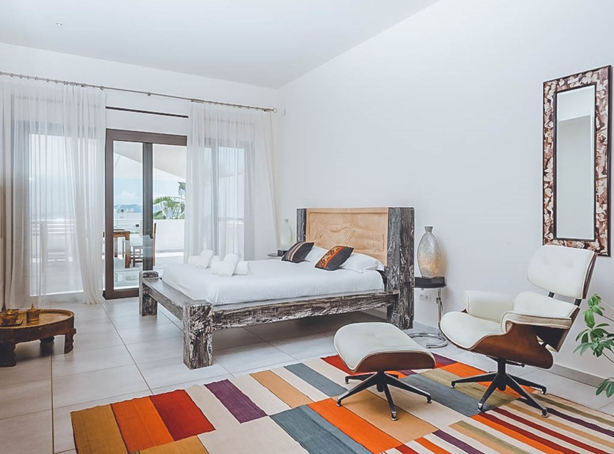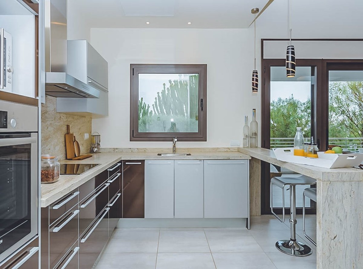 Spread over three levels, the villa features five outstanding bedrooms, all with en-suite bathrooms, plus two additional guest bathrooms. The sleek, monochrome interiors are brightened with colourful contemporary decor, artworks, and unique sculptures.