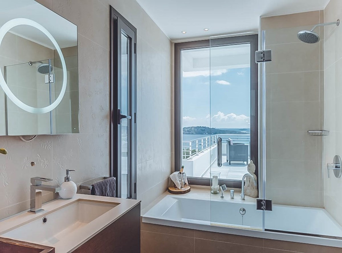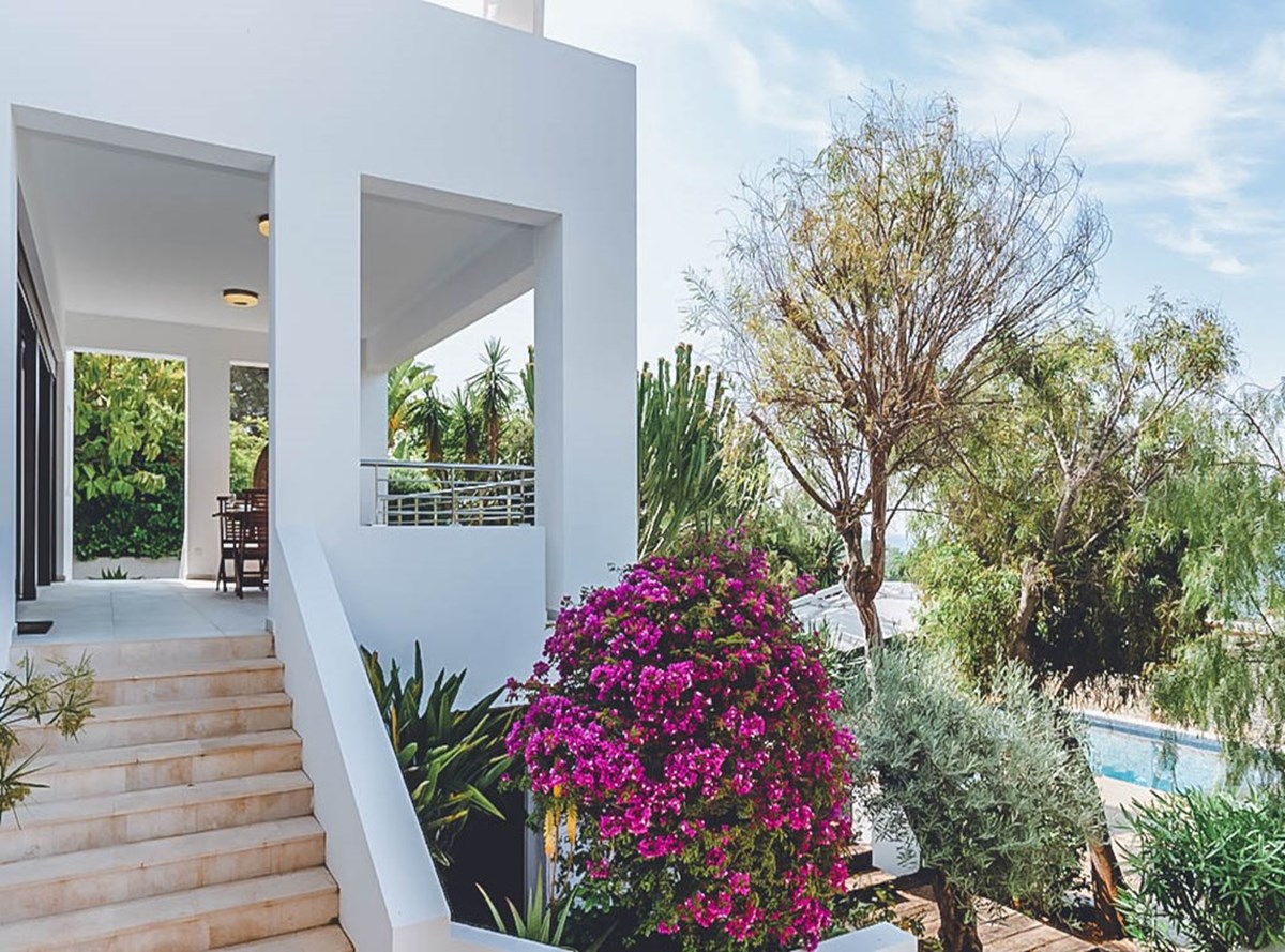 The ground floor has an impressive entrance leading to a lounge with fully equipped kitchen and bar, opening onto an outdoor terrace. The first floor offers another large living room with direct access to a private terrace. The highlight is the master suite on the entire second floor, with its own large private terrace, outdoor lounge, and spectacular sea views.