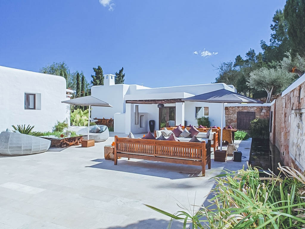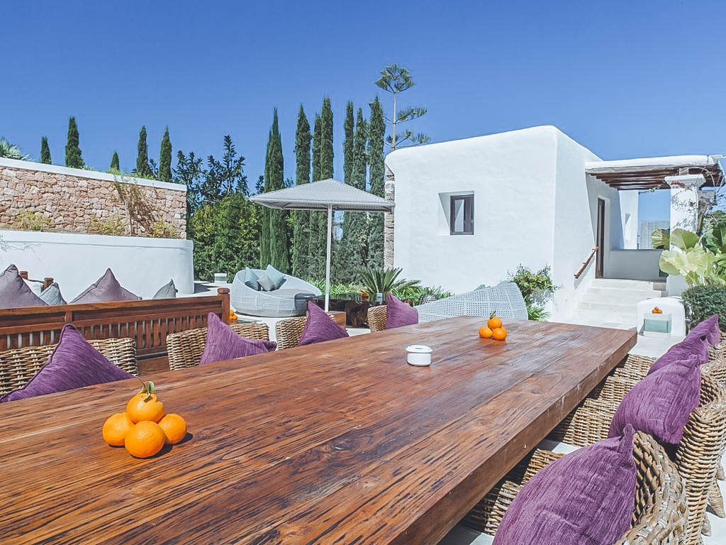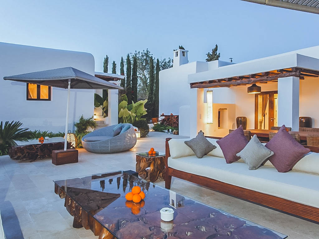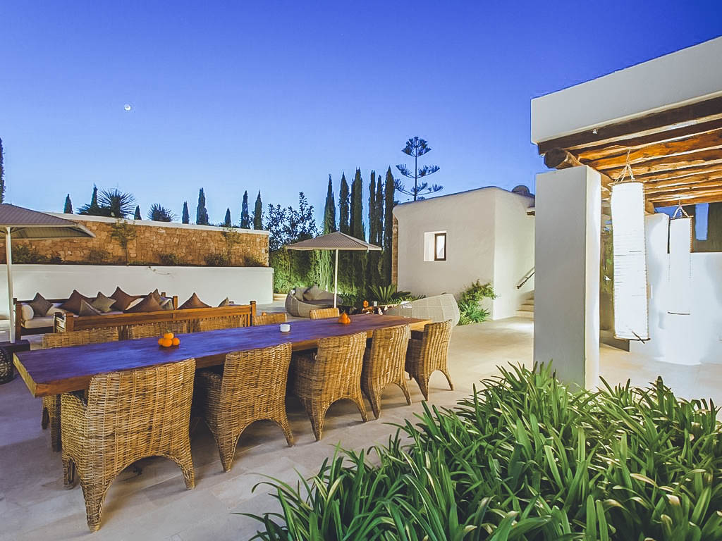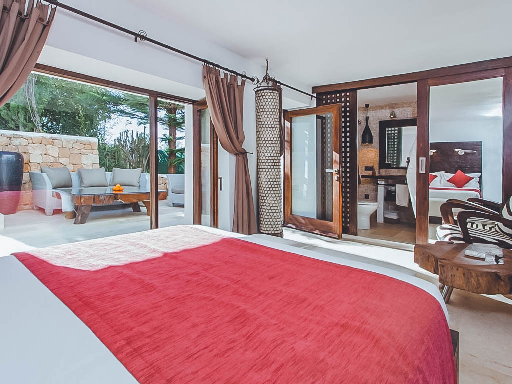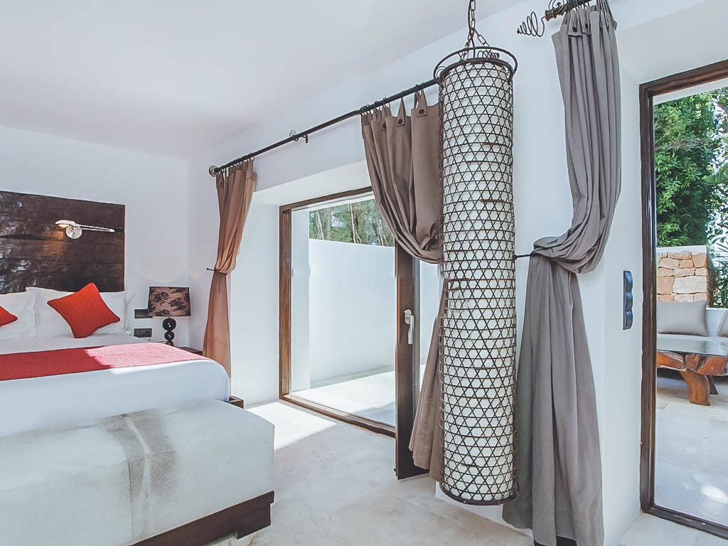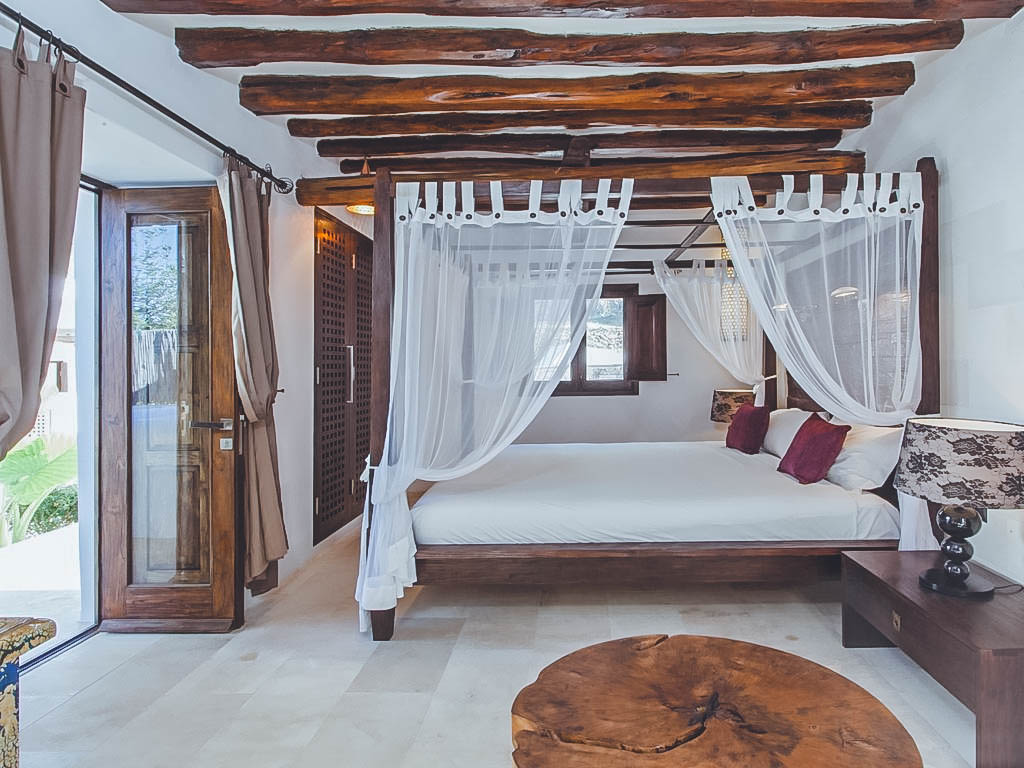 It blends modern elegance with traditional Ibizan architecture and Balinese influences: wooden beamed ceilings, fully equipped kitchen, four-poster beds, and stylish stone masonry.