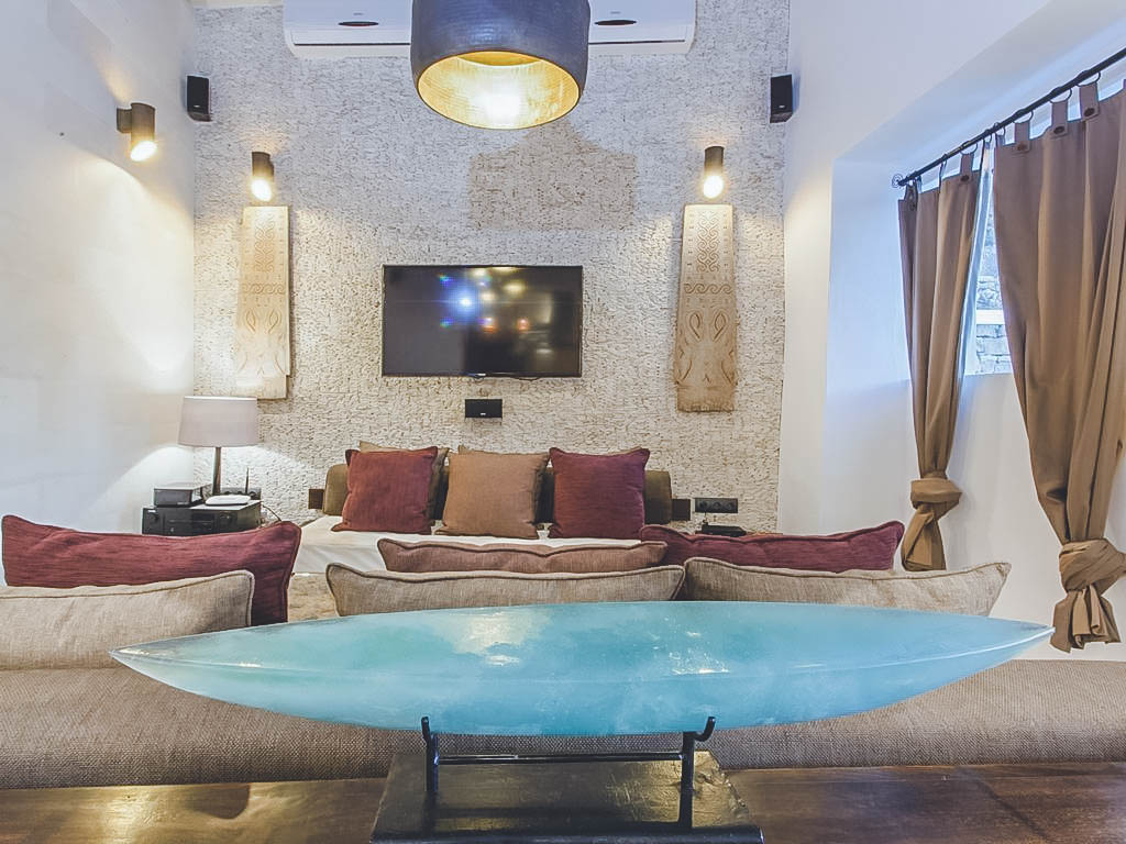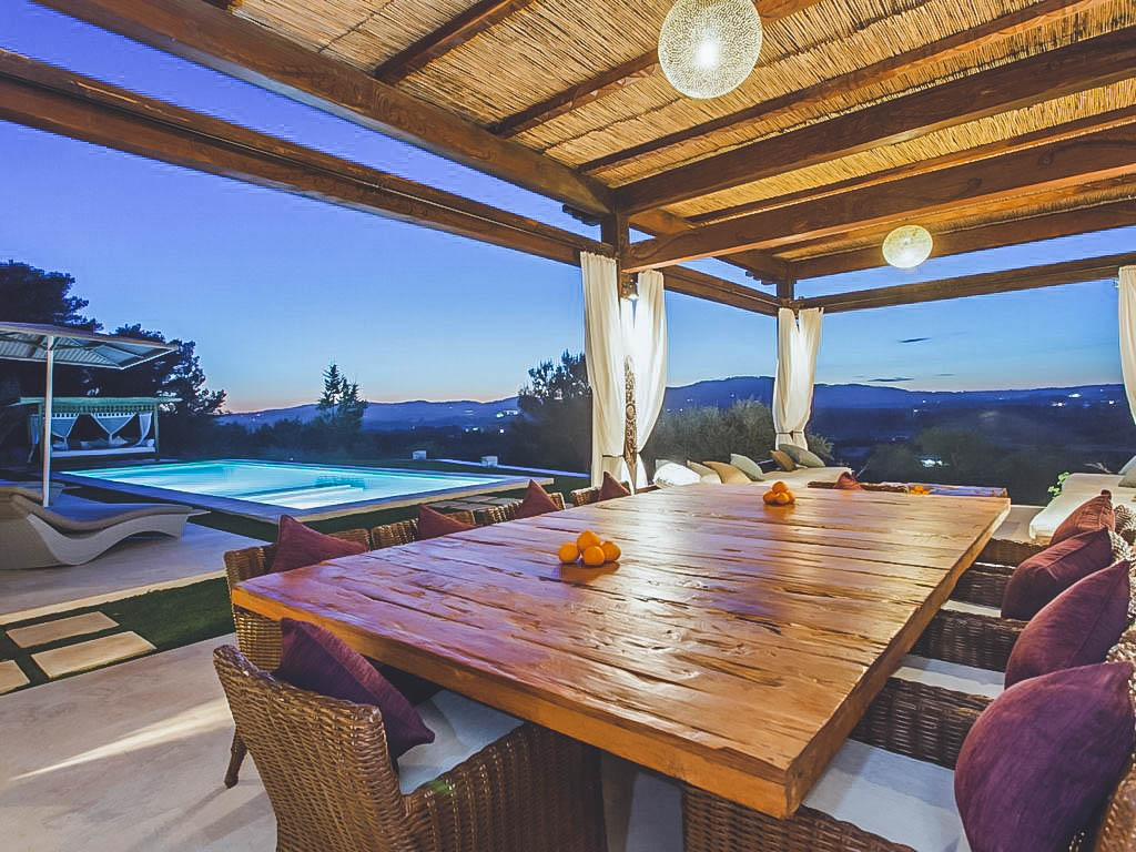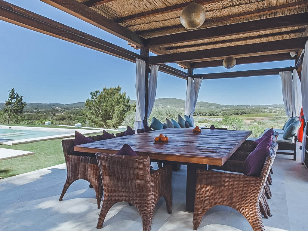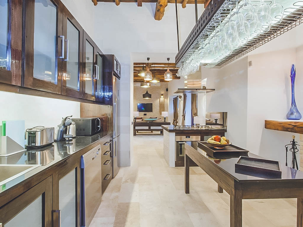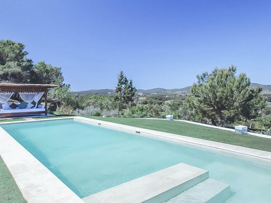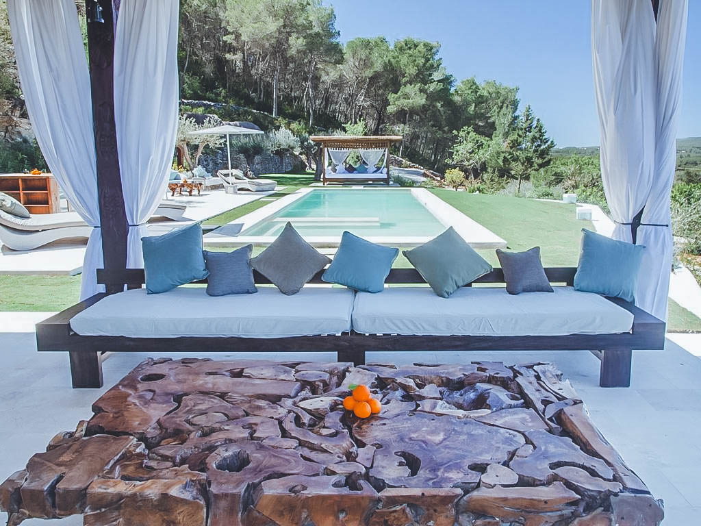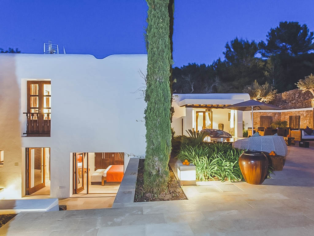 It blends modern elegance with traditional Ibizan architecture and Balinese influences: wooden beamed ceilings, fully equipped kitchen, four-poster beds, and stylish stone masonry.