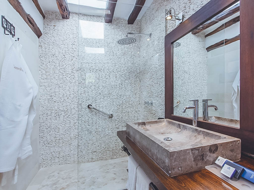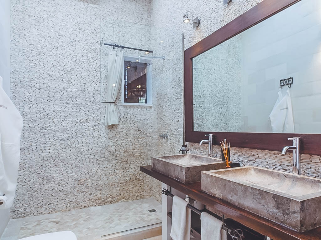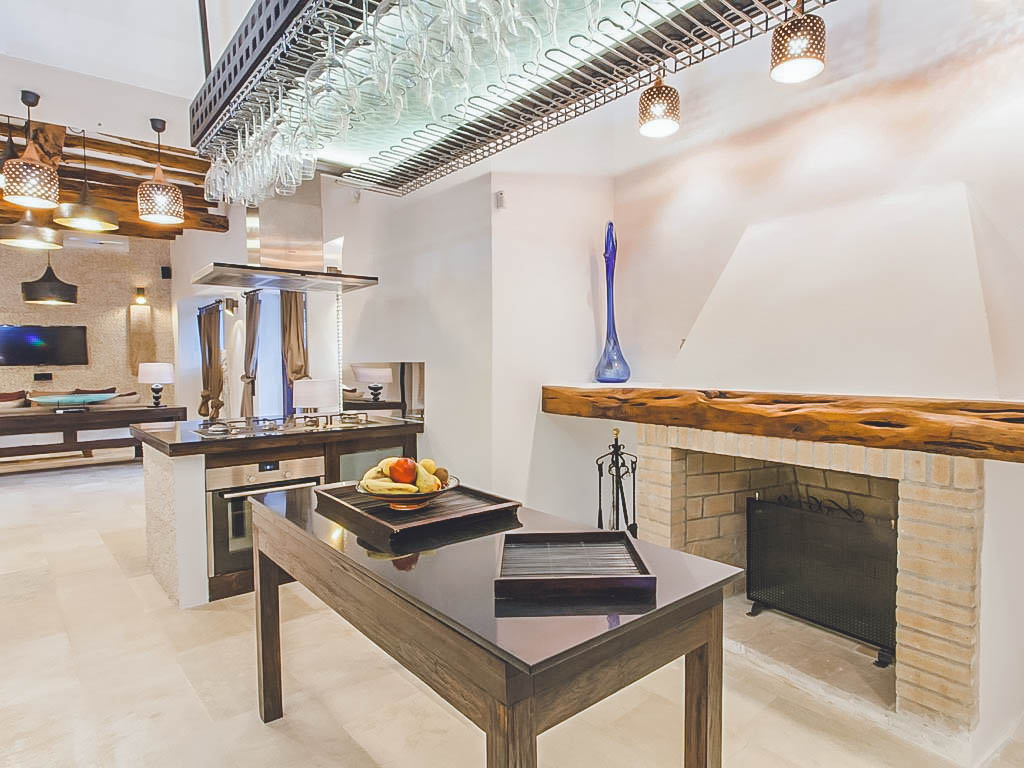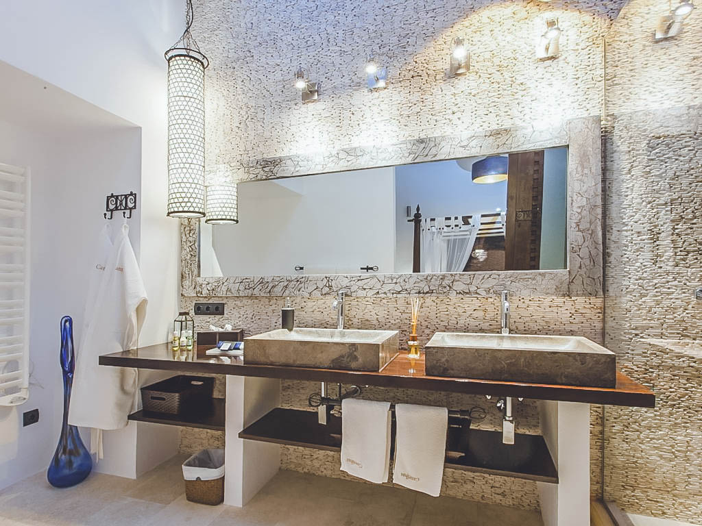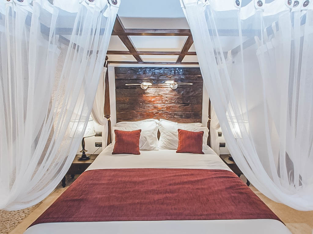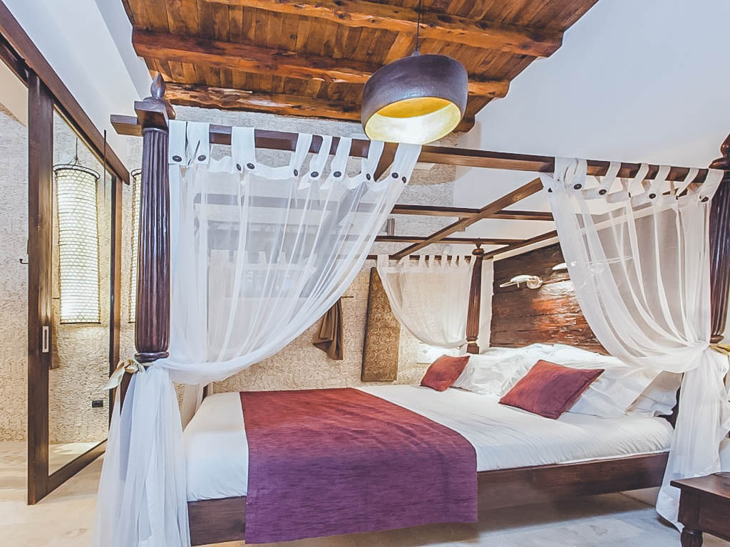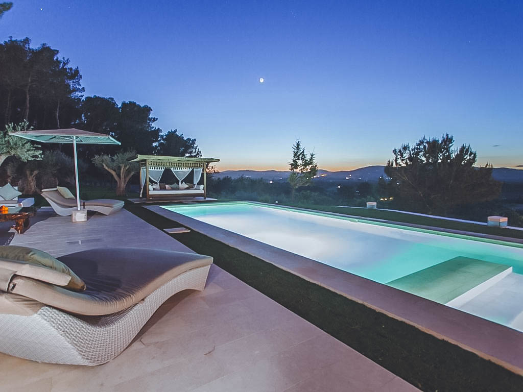 It blends modern elegance with traditional Ibizan architecture and Balinese influences: wooden beamed ceilings, fully equipped kitchen, four-poster beds, and stylish stone masonry.
