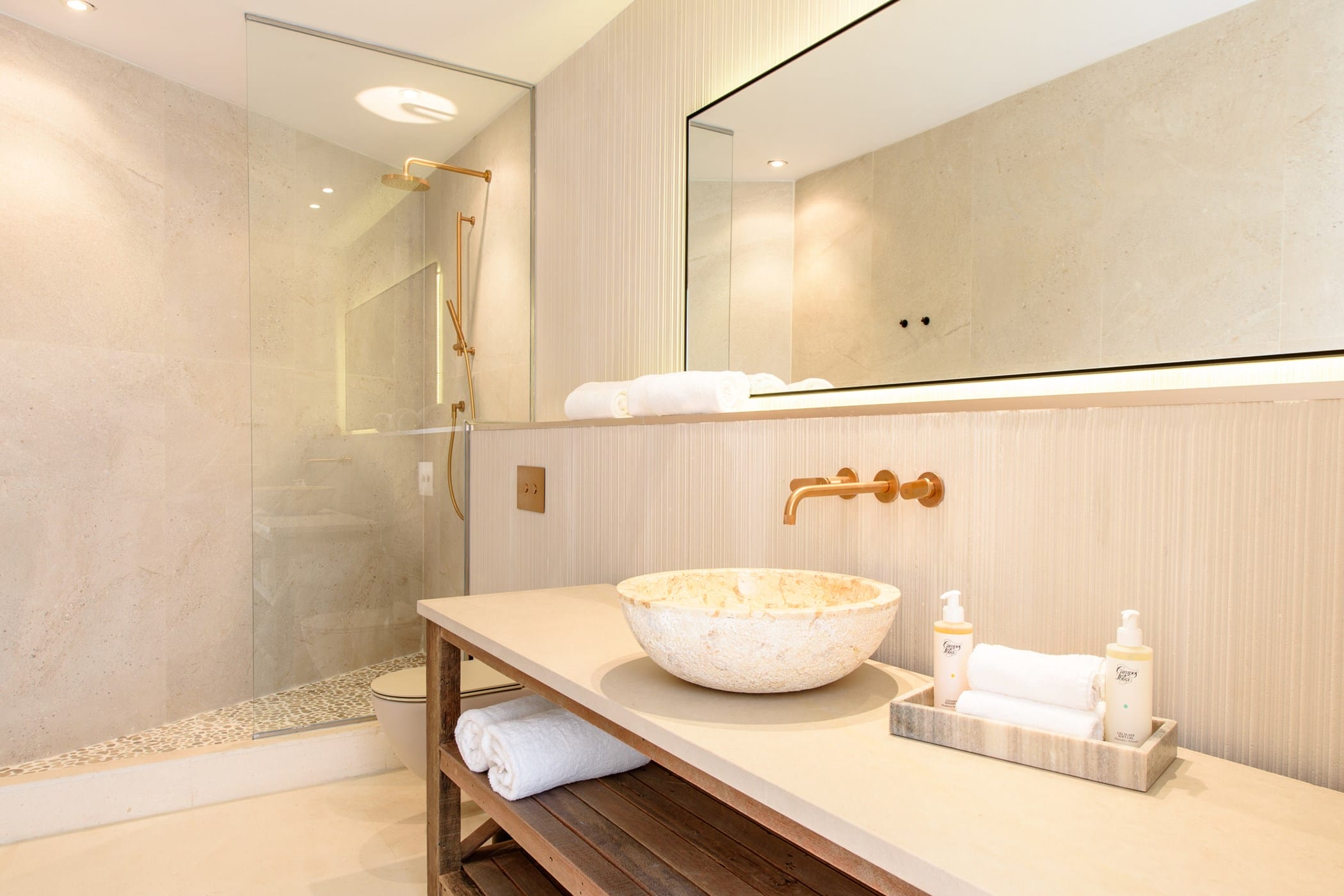 The open-plan living, dining, and kitchen areas are elegant and sophisticated, with a fully equipped kitchen including a large central island, two ovens, and premium appliances. An additional separate suite with its own bathroom and kitchenette provides flexible accommodation.