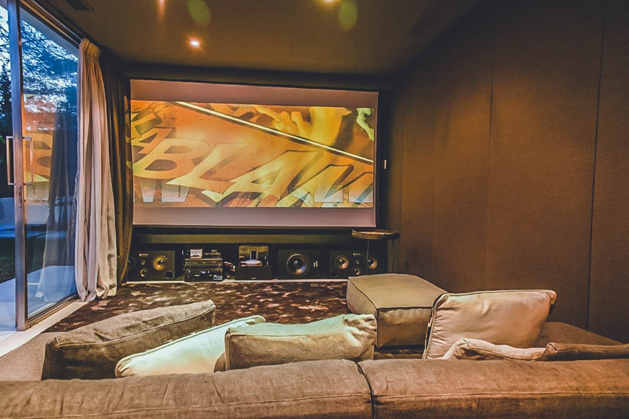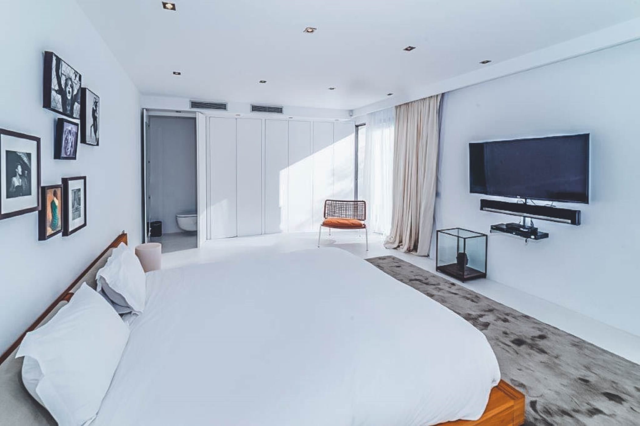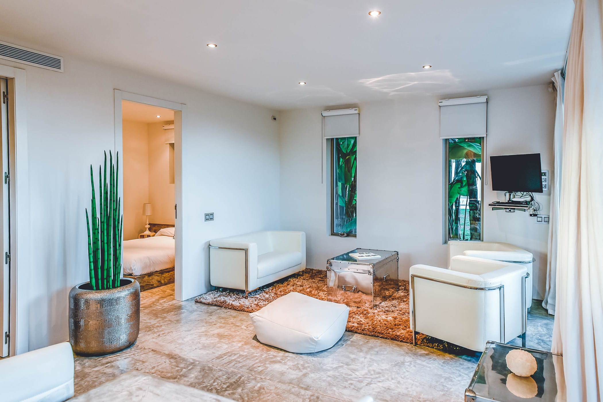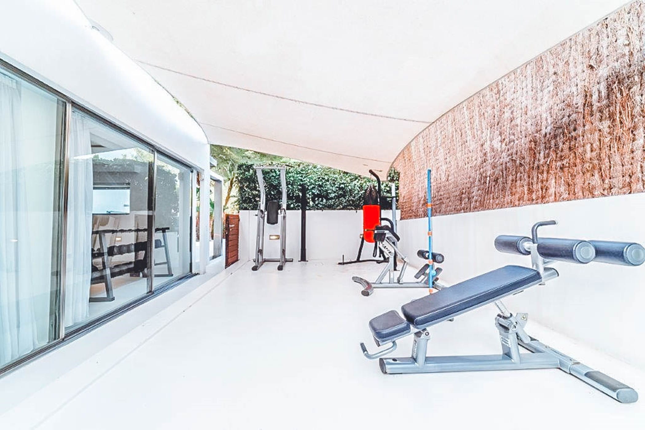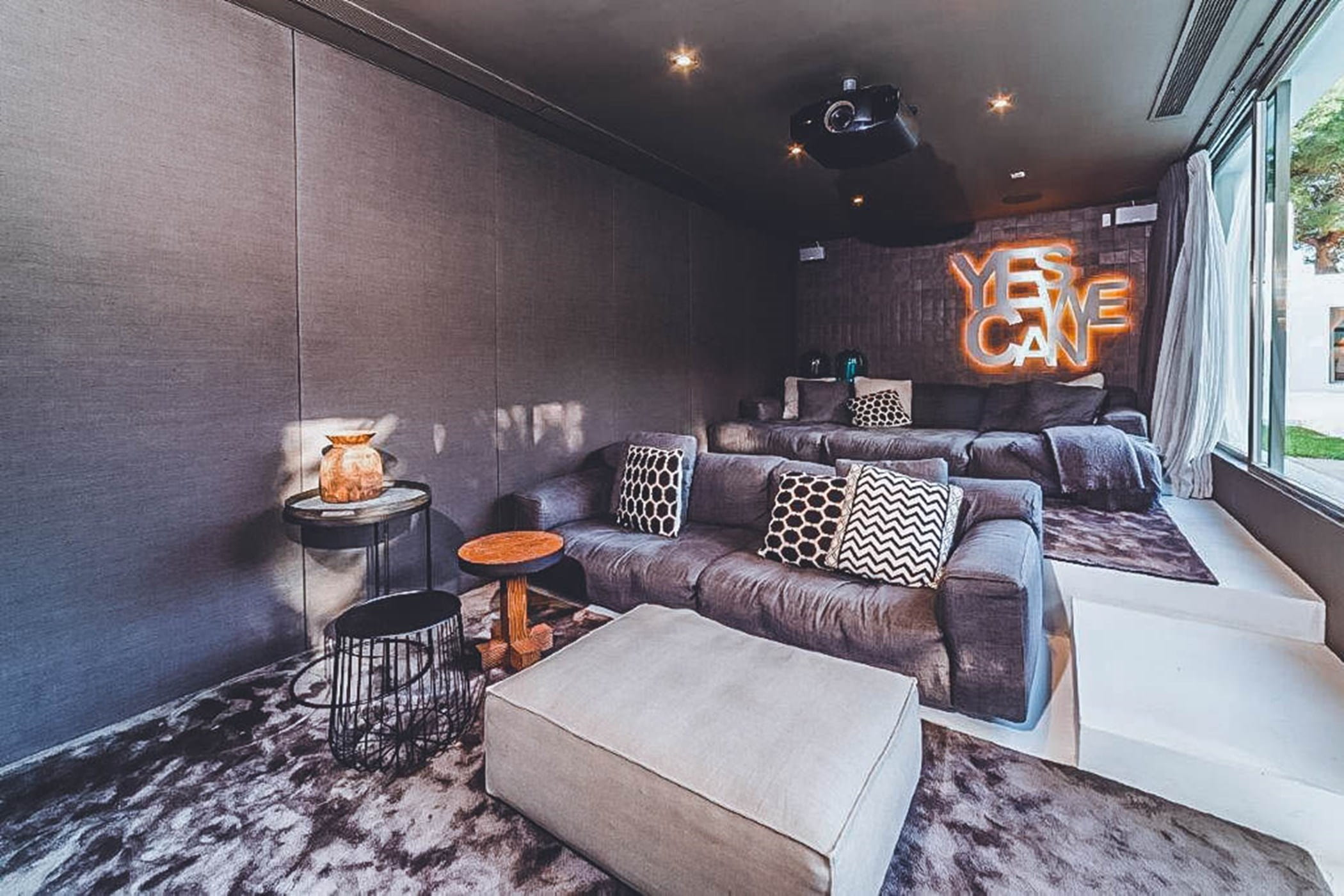 The main house features 2 master suites and 3 guest rooms, all with king-size beds, en-suite bathrooms, TVs, and heated floors. The interiors combine warm neutral tones with splashes of colour, stylish furnishings, and a fully equipped kitchen that opens onto the living and dining areas. Additional amenities include a home cinema room and a fully equipped indoor/outdoor gym.