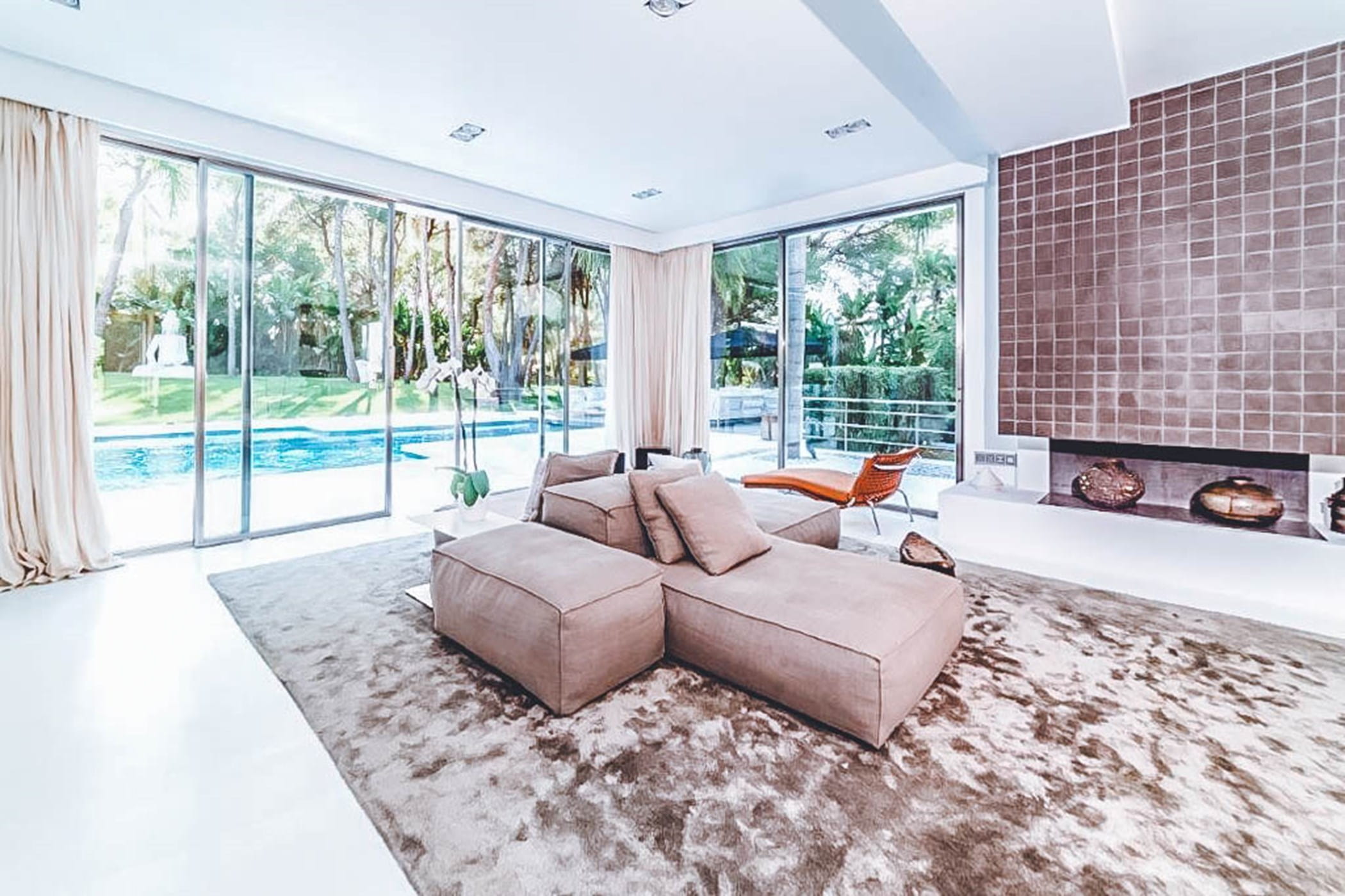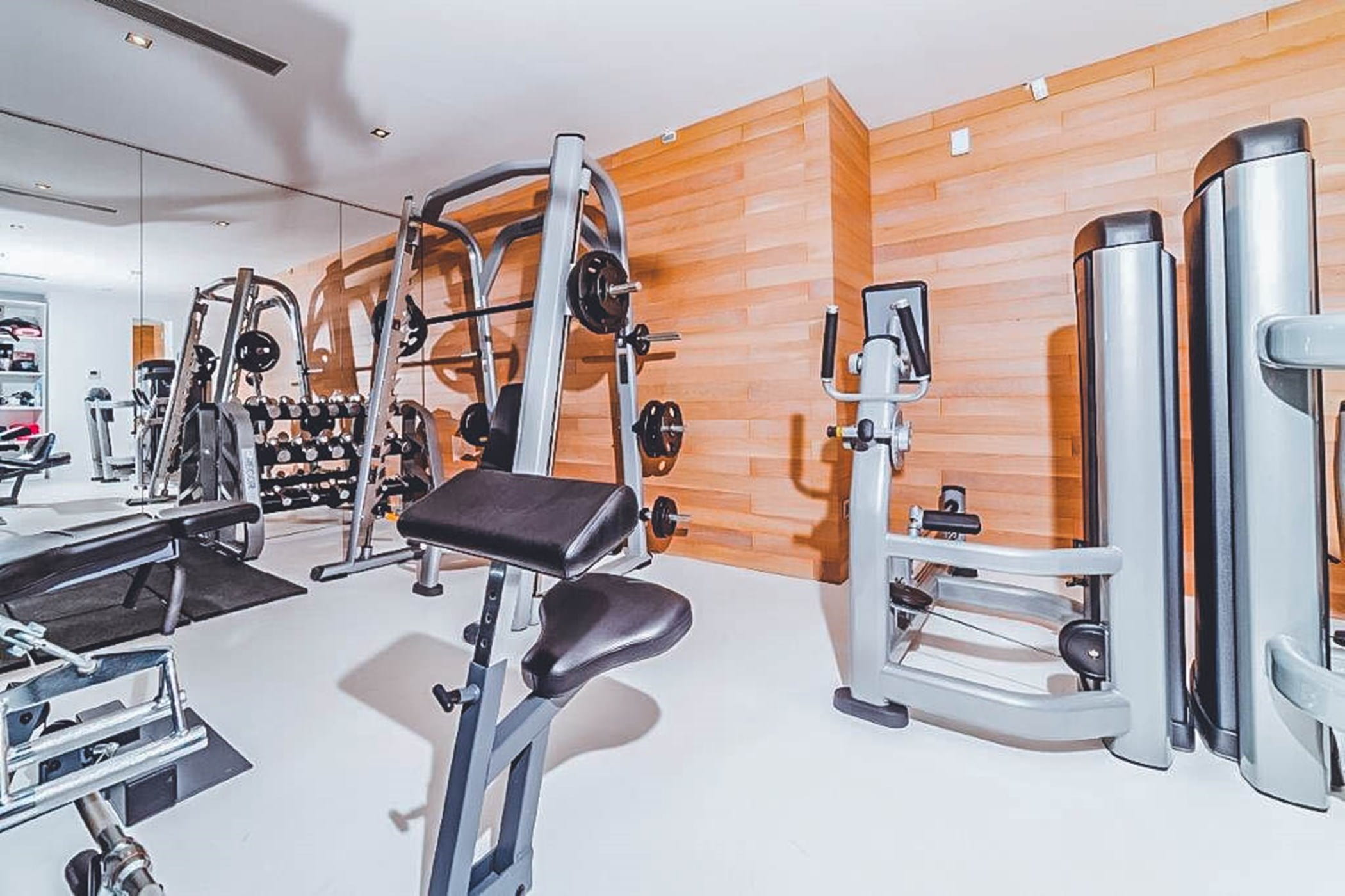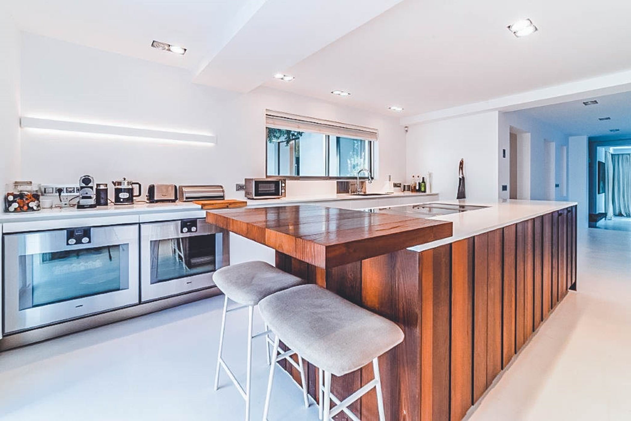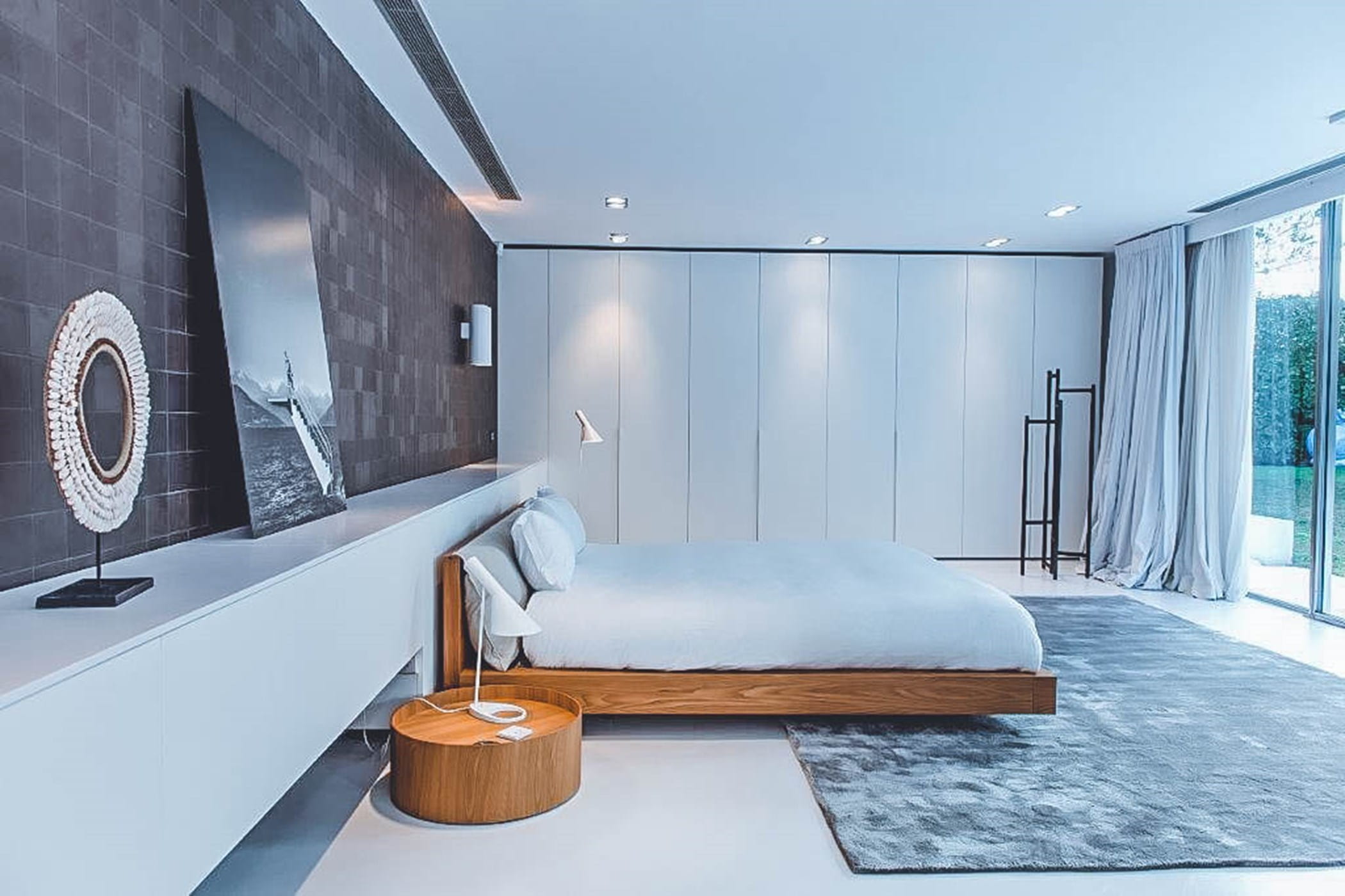 The main house features 2 master suites and 3 guest rooms, all with king-size beds, en-suite bathrooms, TVs, and heated floors. The interiors combine warm neutral tones with splashes of colour, stylish furnishings, and a fully equipped kitchen that opens onto the living and dining areas. Additional amenities include a home cinema room and a fully equipped indoor/outdoor gym.