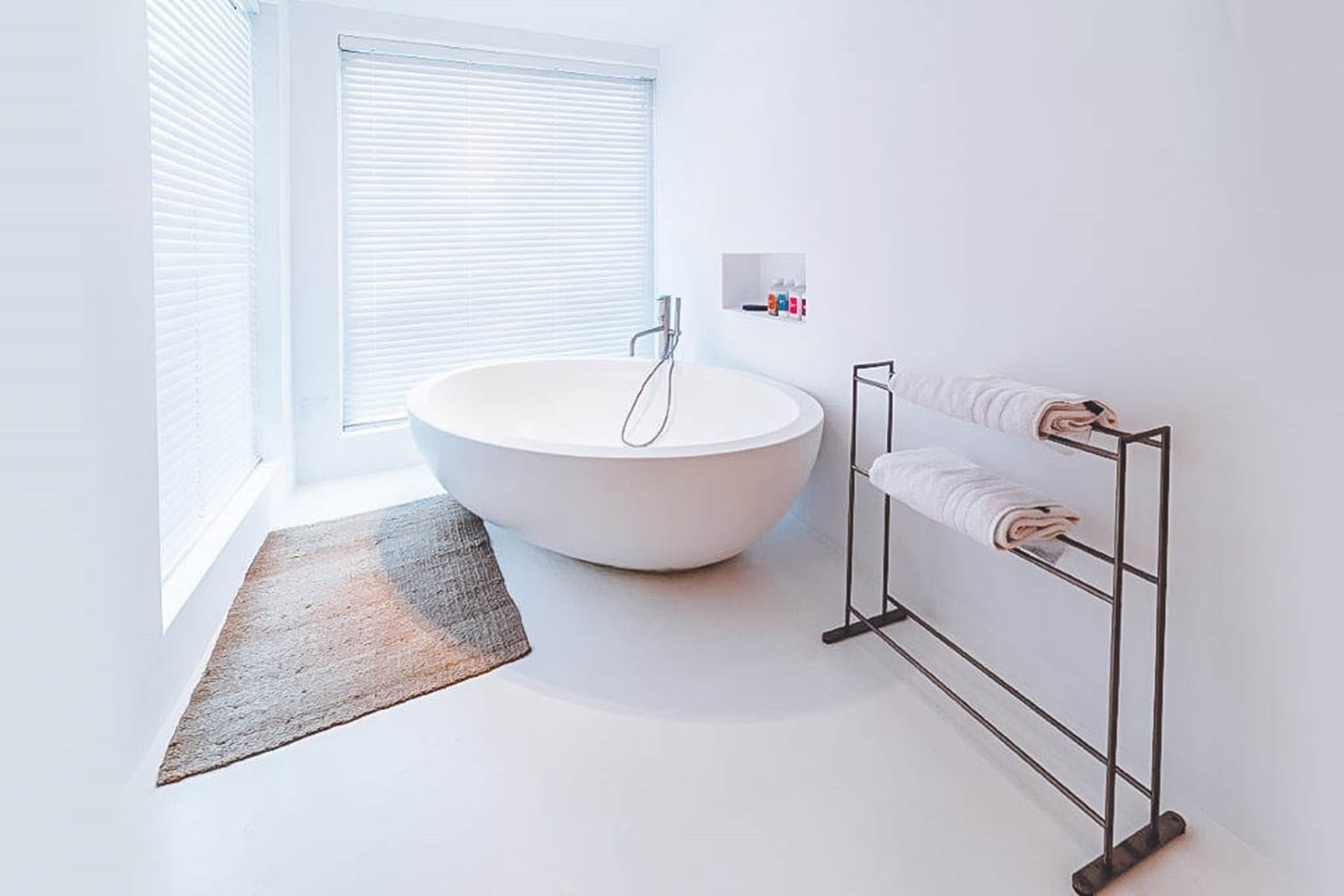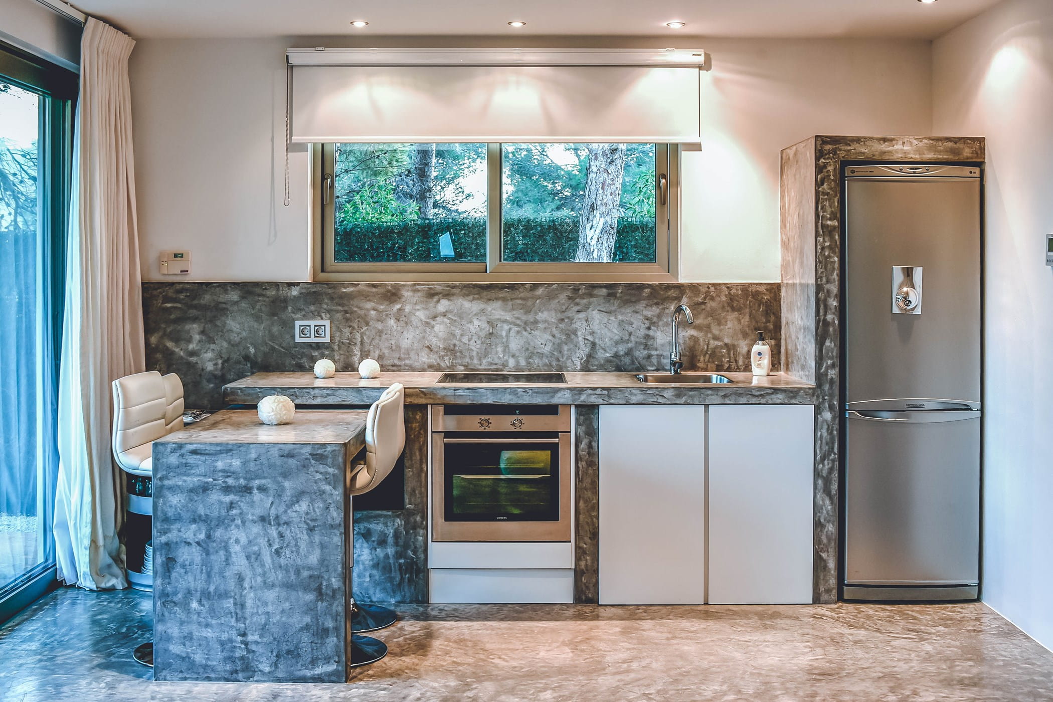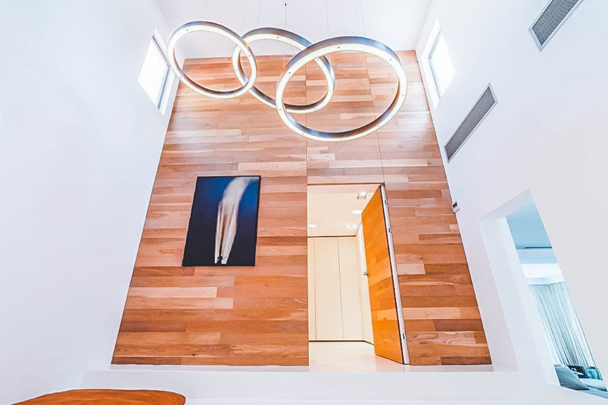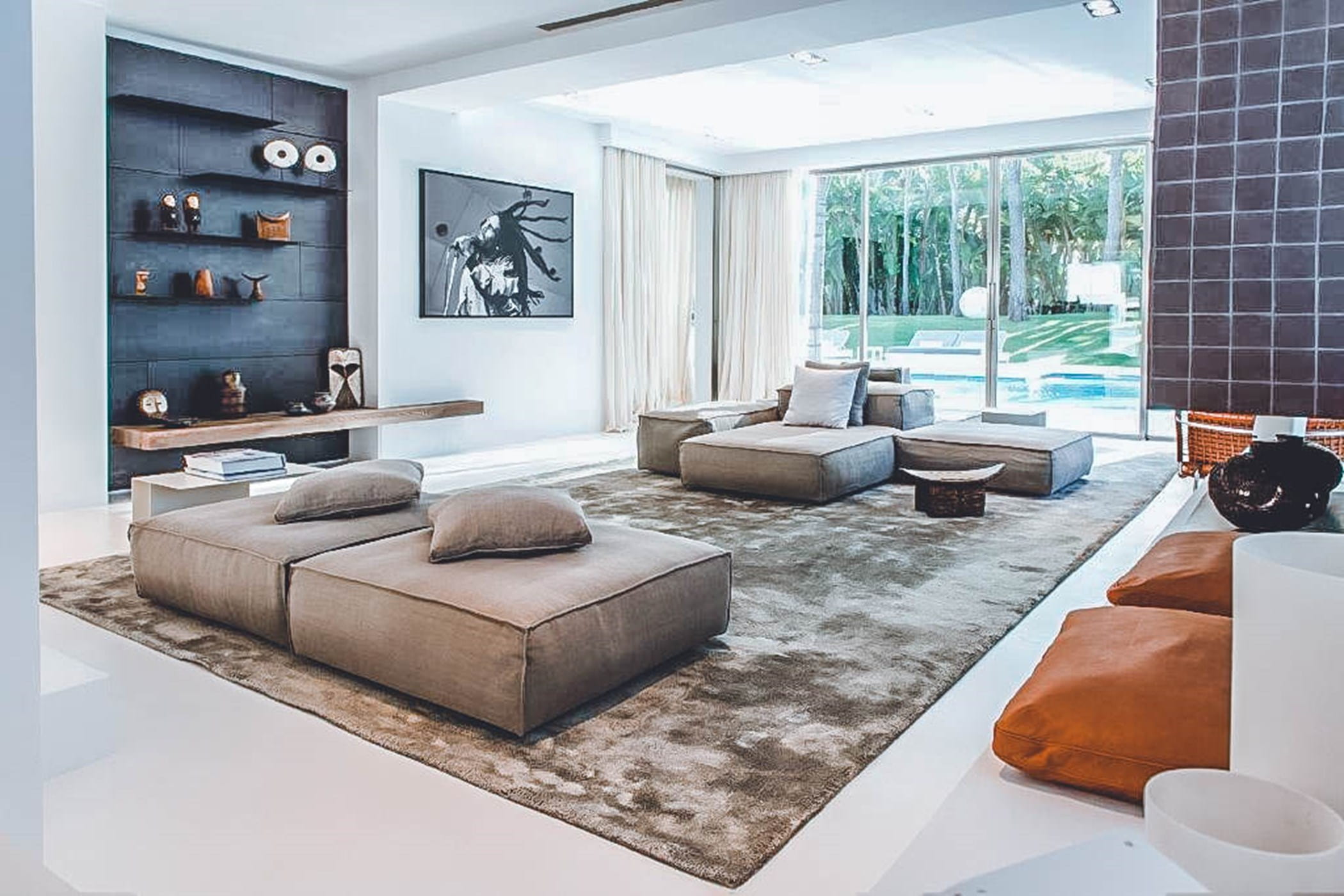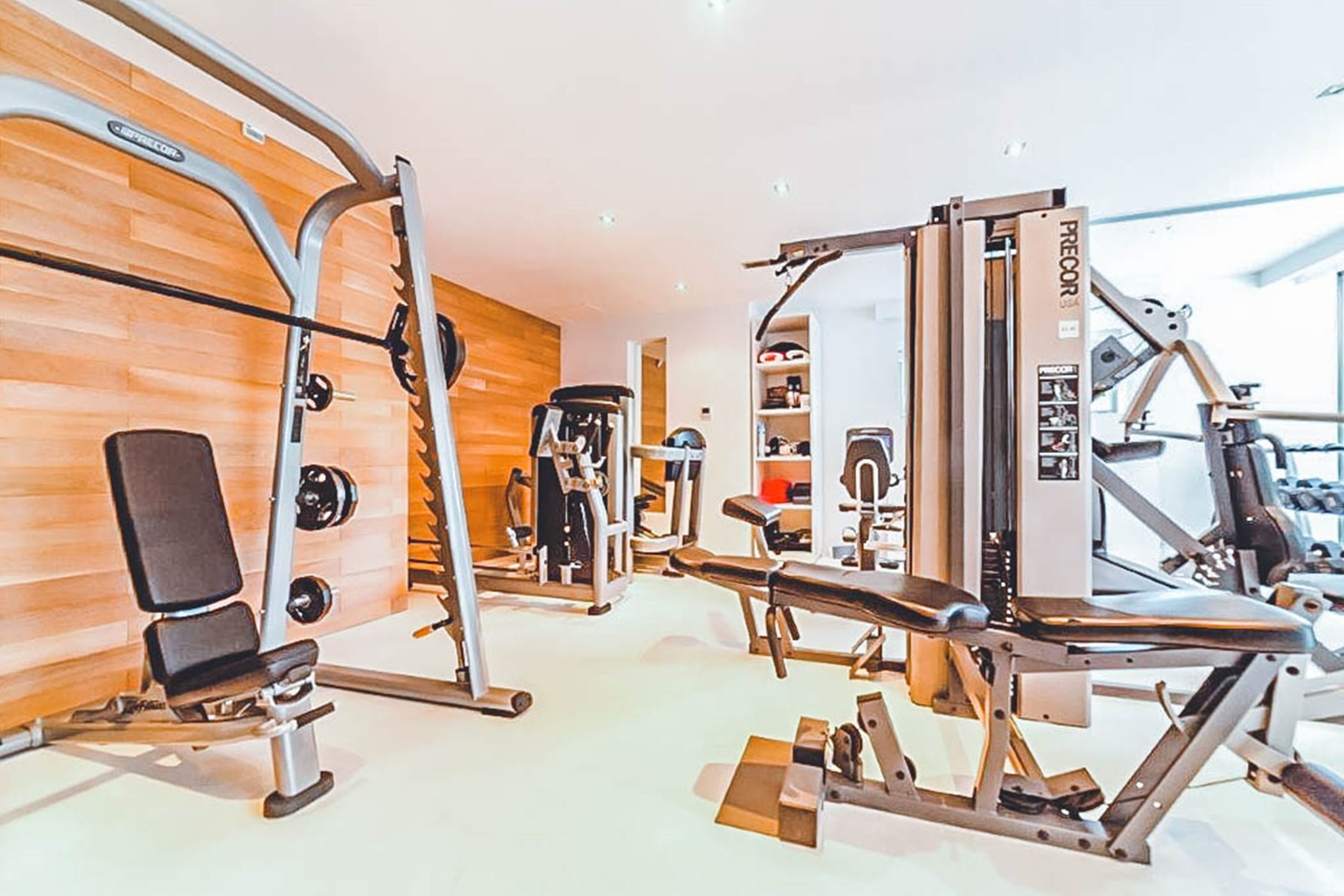 The main house features 2 master suites and 3 guest rooms, all with king-size beds, en-suite bathrooms, TVs, and heated floors. The interiors combine warm neutral tones with splashes of colour, stylish furnishings, and a fully equipped kitchen that opens onto the living and dining areas. Additional amenities include a home cinema room and a fully equipped indoor/outdoor gym.