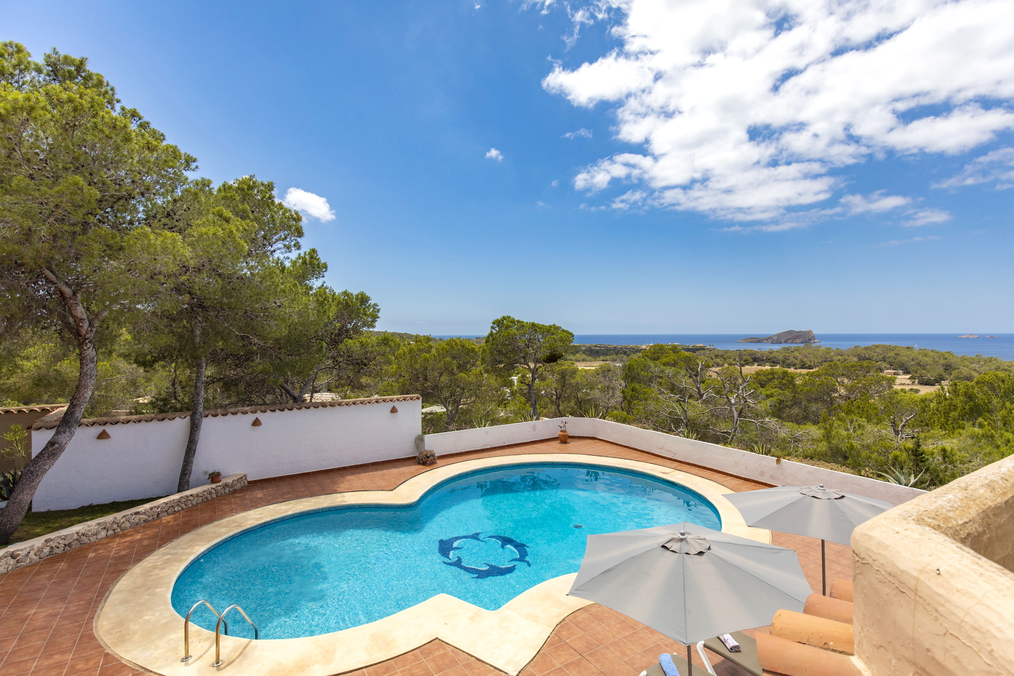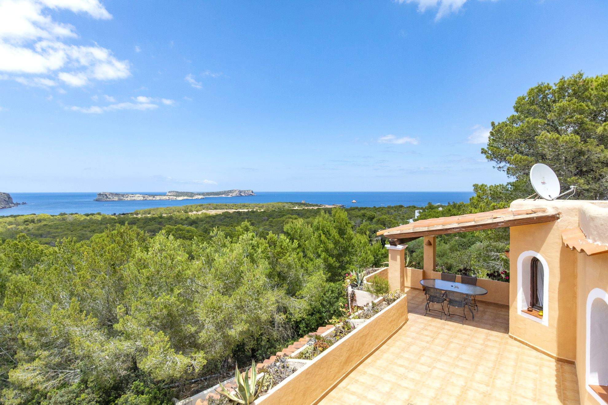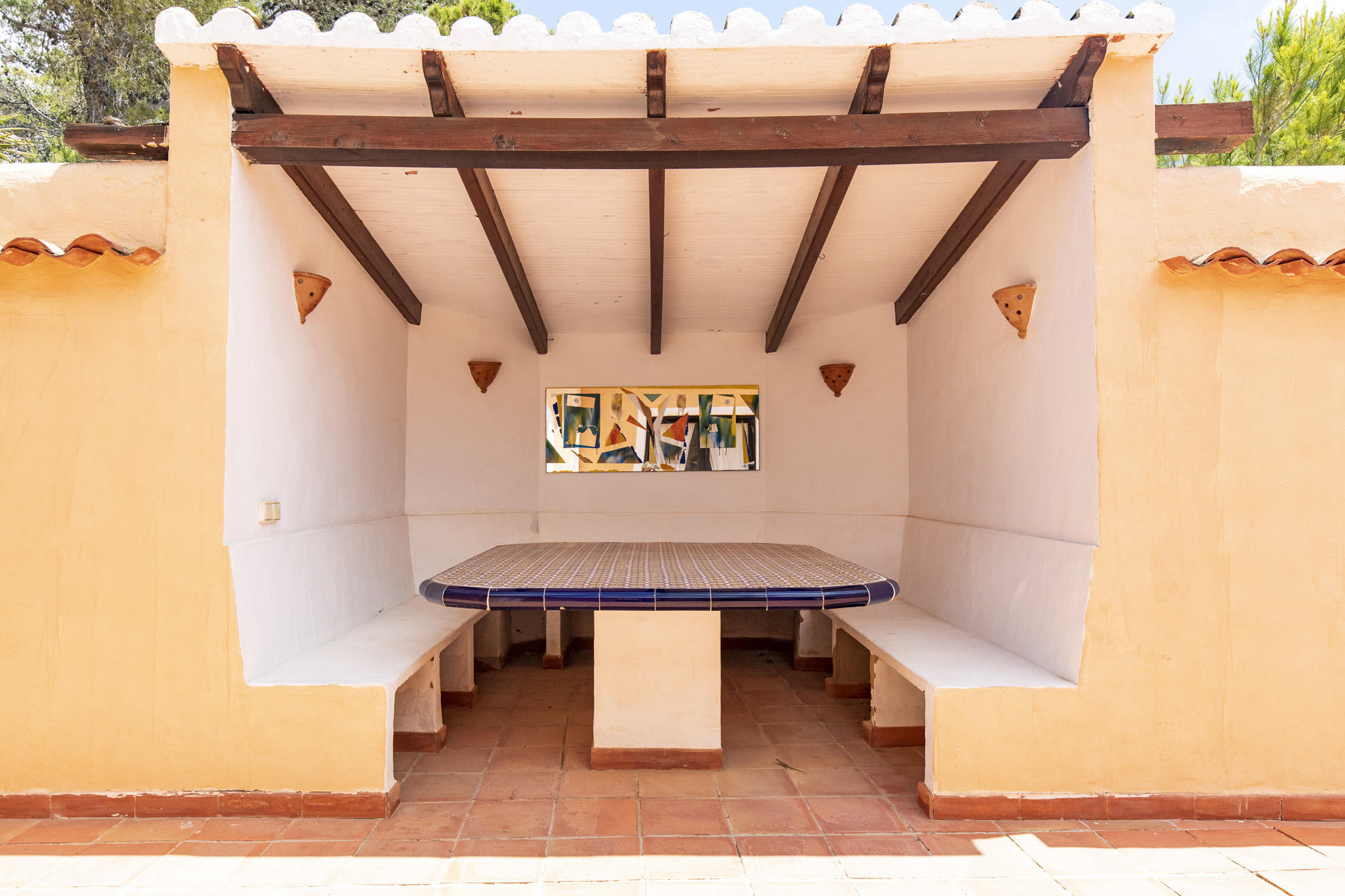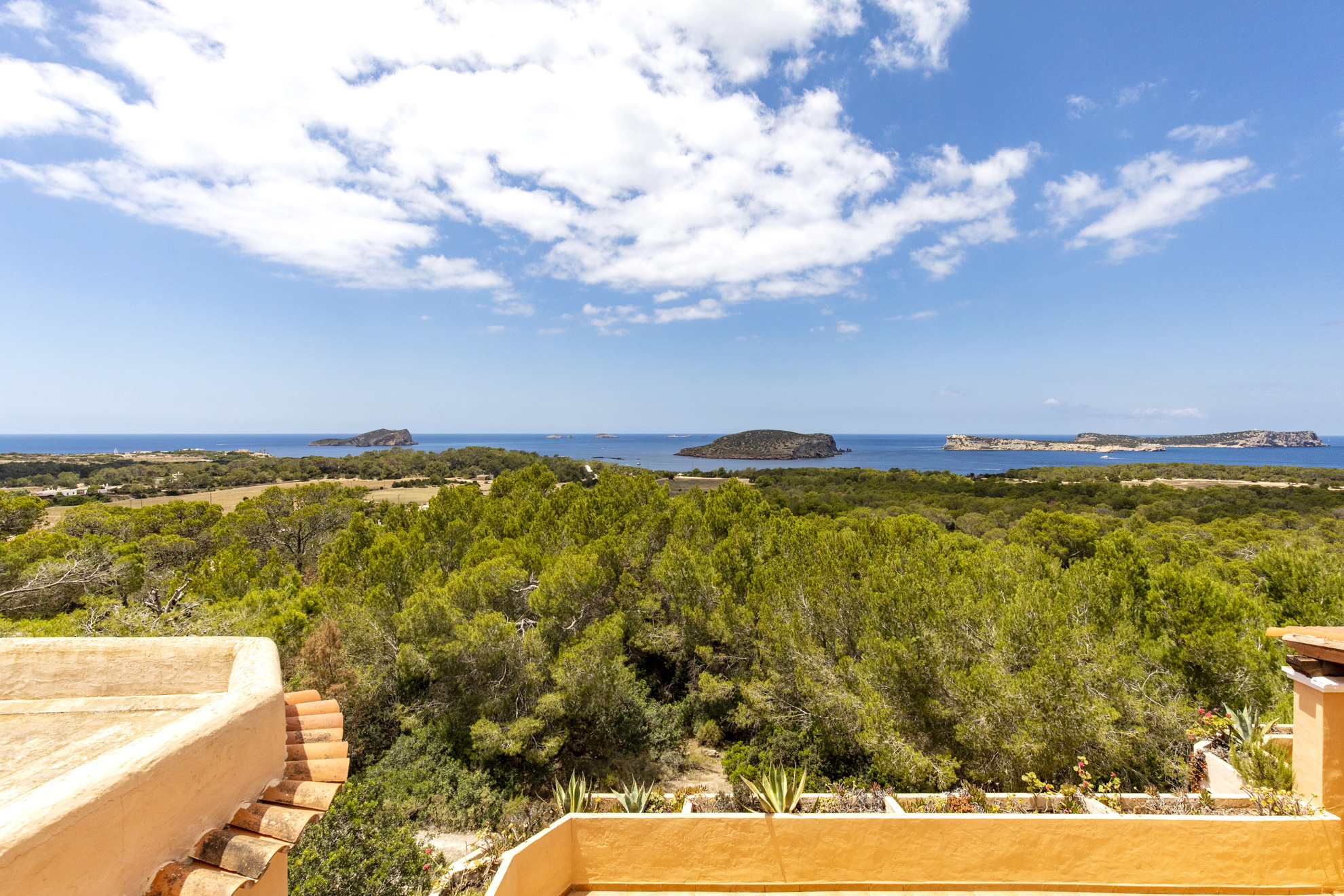 Nestled in the enchanting west part of the island, overlooking the picturesque shores of Cala Compte and Cala Conta, this villa offers an awe-inspiring panorama of untouched landscapes extending to the vast sea, all complemented by the legendary sunsets! A mere 15-minute leisurely stroll takes you to the beautiful beaches of Cala Compte and Cala Conta, making it easily accessible on foot. This retro-inspired villa, situated on an expansive 16,500m² seafront plot, beckons relaxation on its spacious pool terrace featuring a BBQ, a quaint outdoor kitchen, an alfresco shower, and a covered patio with a dining area.
