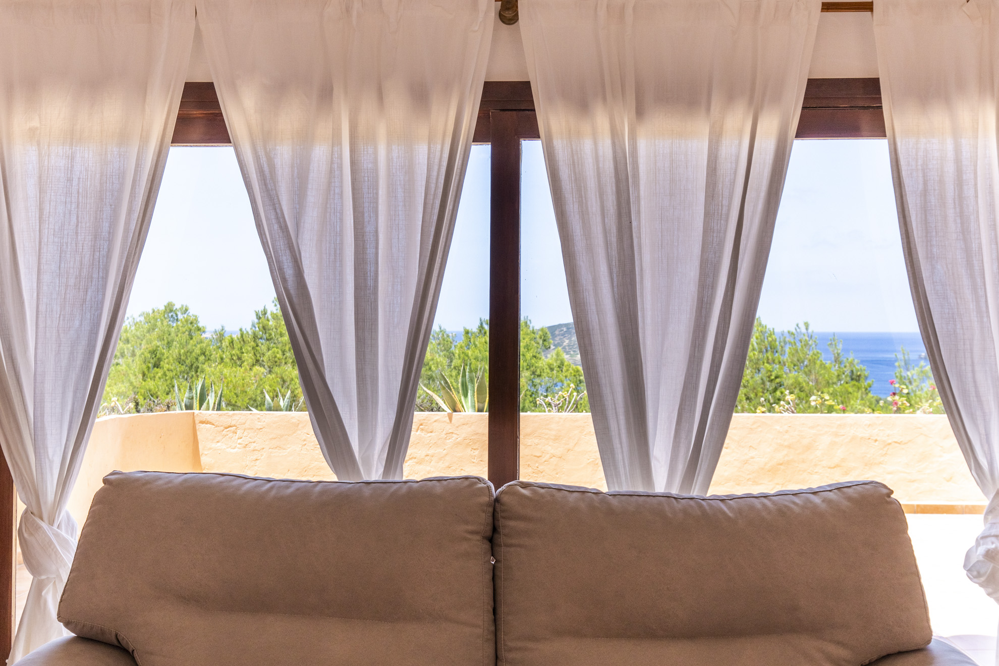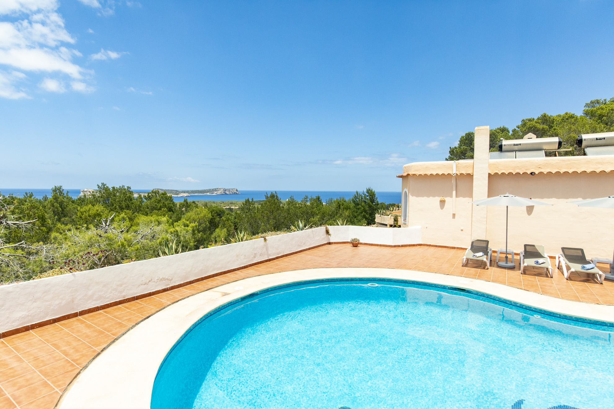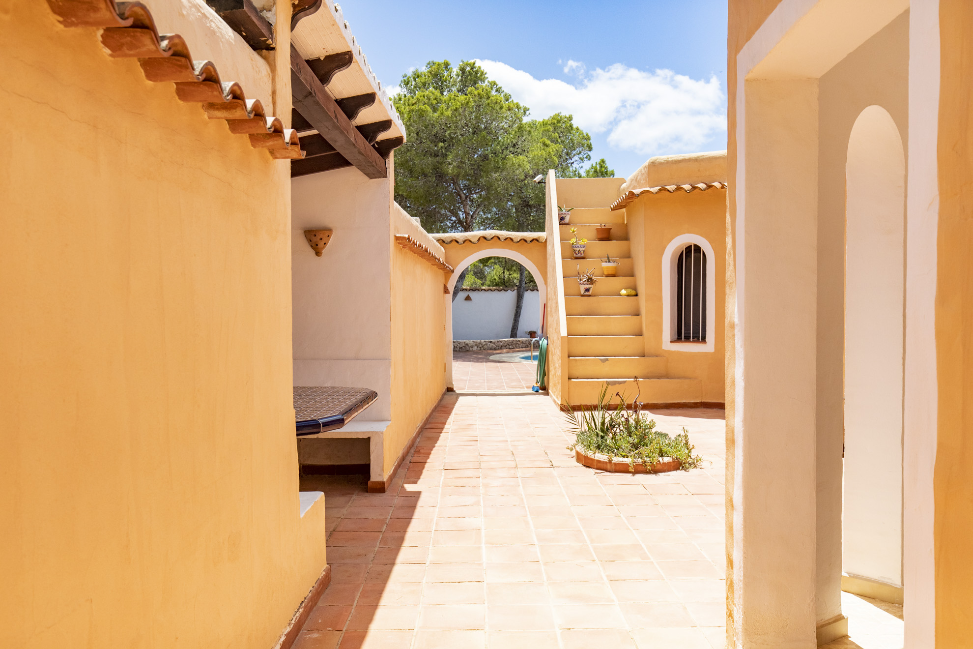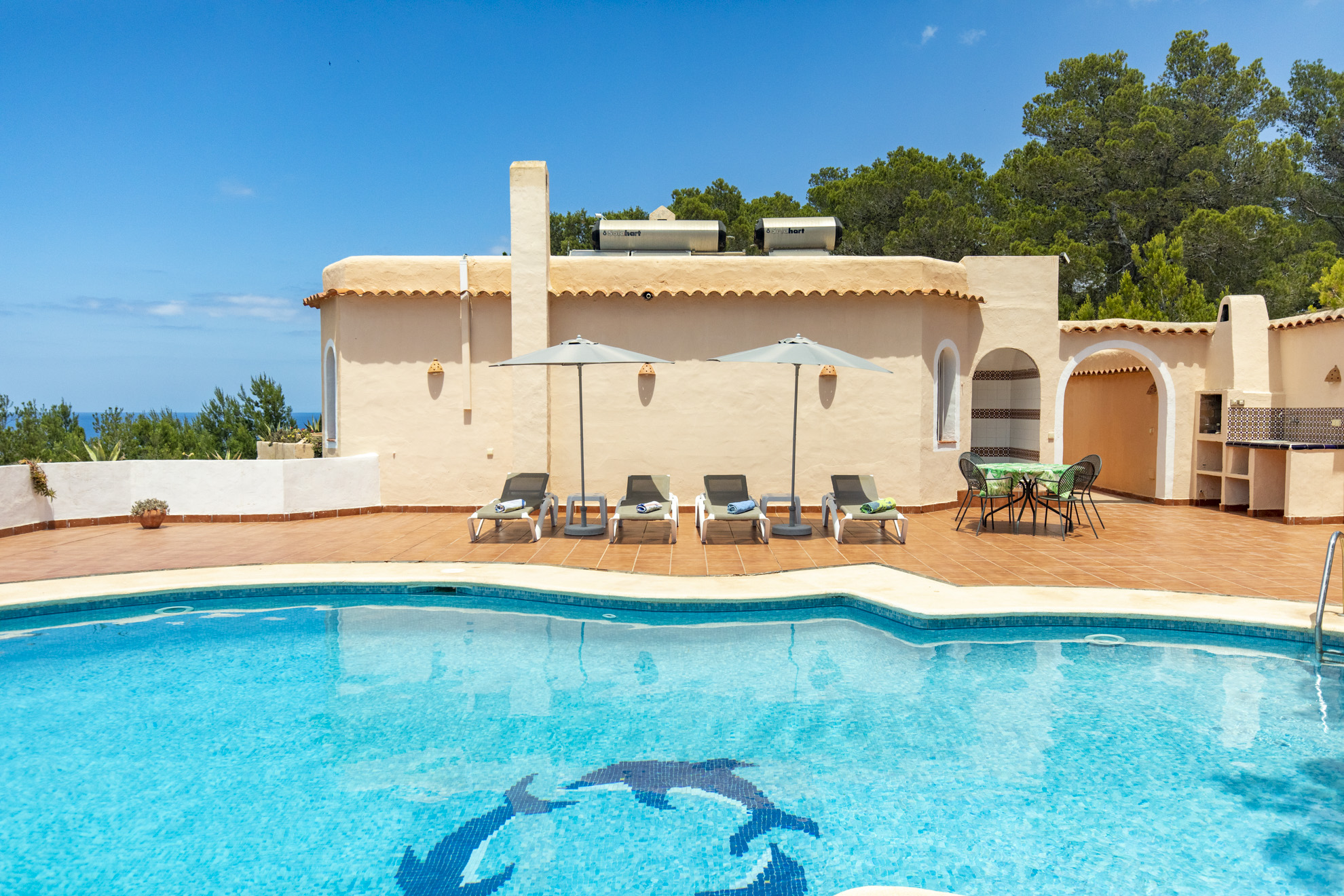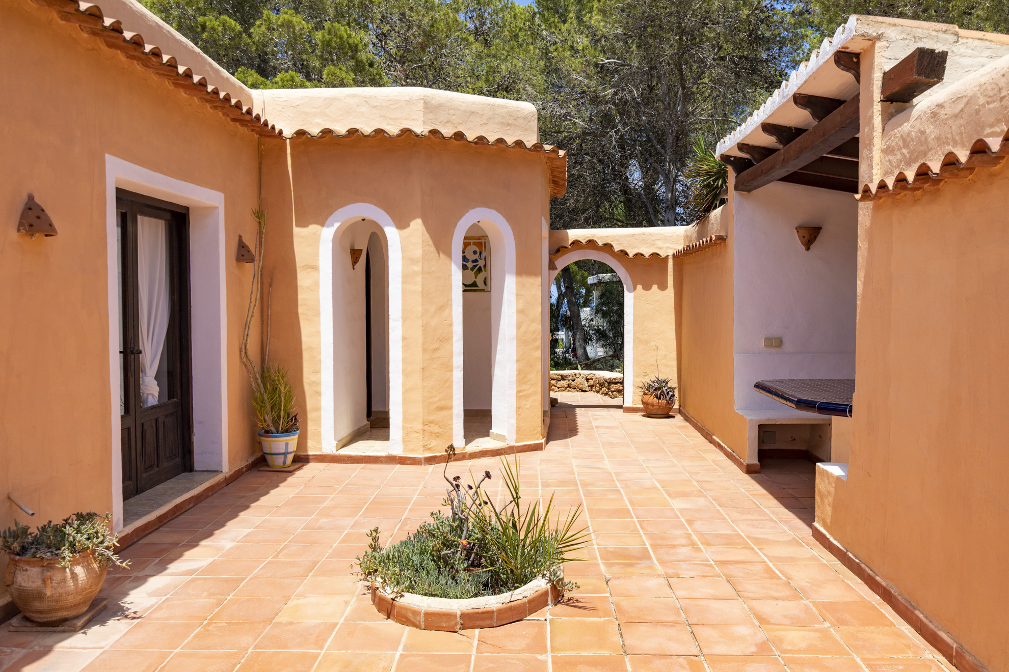 Nestled in the enchanting west part of the island, overlooking the picturesque shores of Cala Compte and Cala Conta, this villa offers an awe-inspiring panorama of untouched landscapes extending to the vast sea, all complemented by the legendary sunsets! A mere 15-minute leisurely stroll takes you to the beautiful beaches of Cala Compte and Cala Conta, making it easily accessible on foot. This retro-inspired villa, situated on an expansive 16,500m² seafront plot, beckons relaxation on its spacious pool terrace featuring a BBQ, a quaint outdoor kitchen, an alfresco shower, and a covered patio with a dining area.