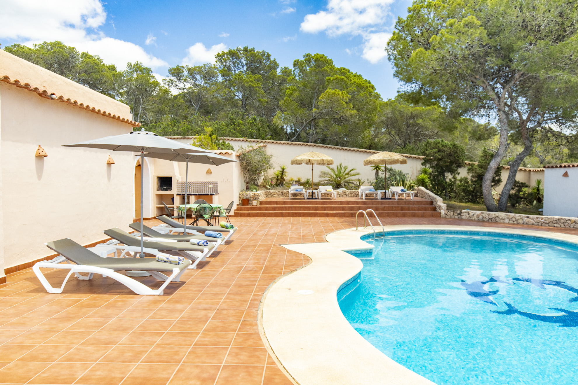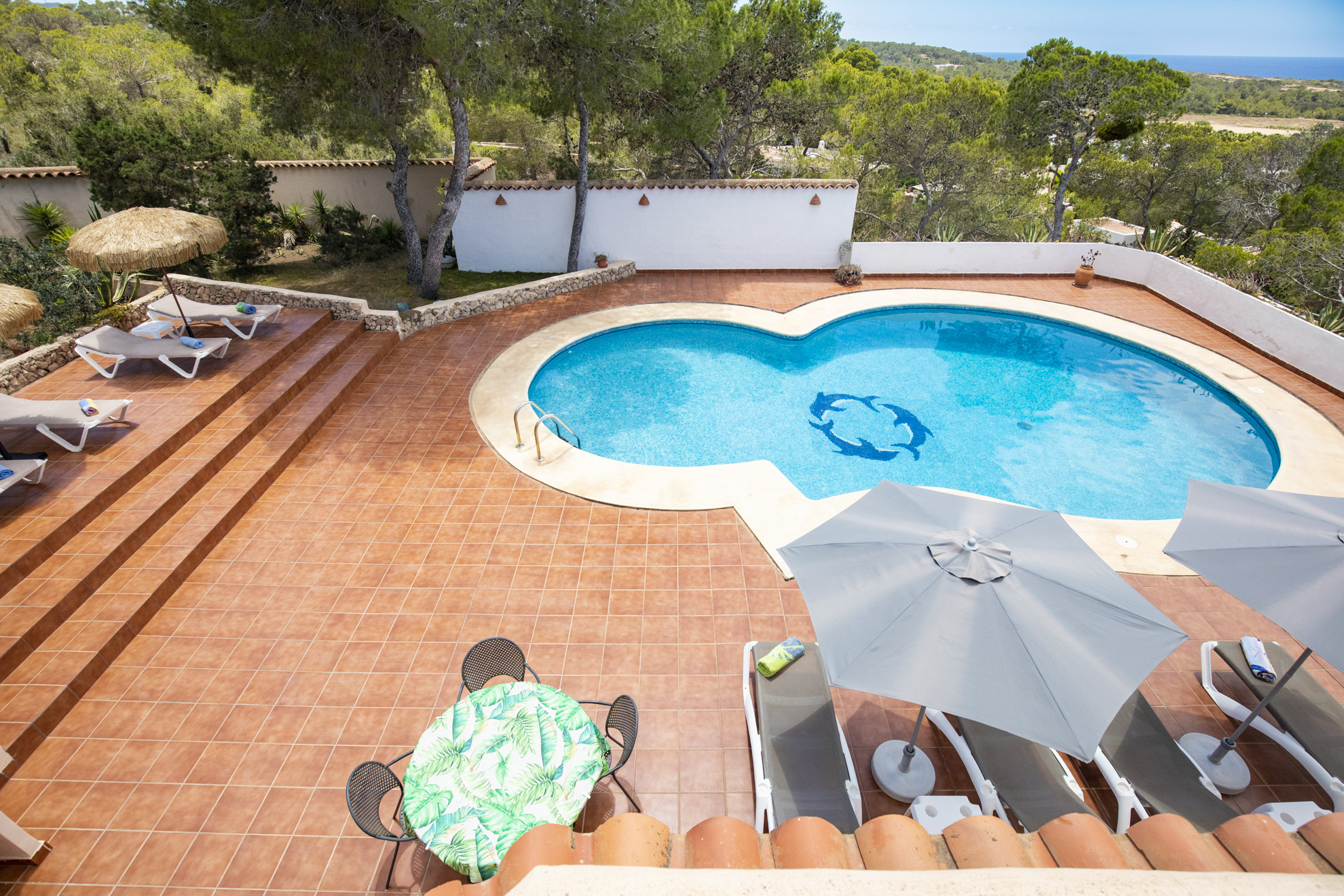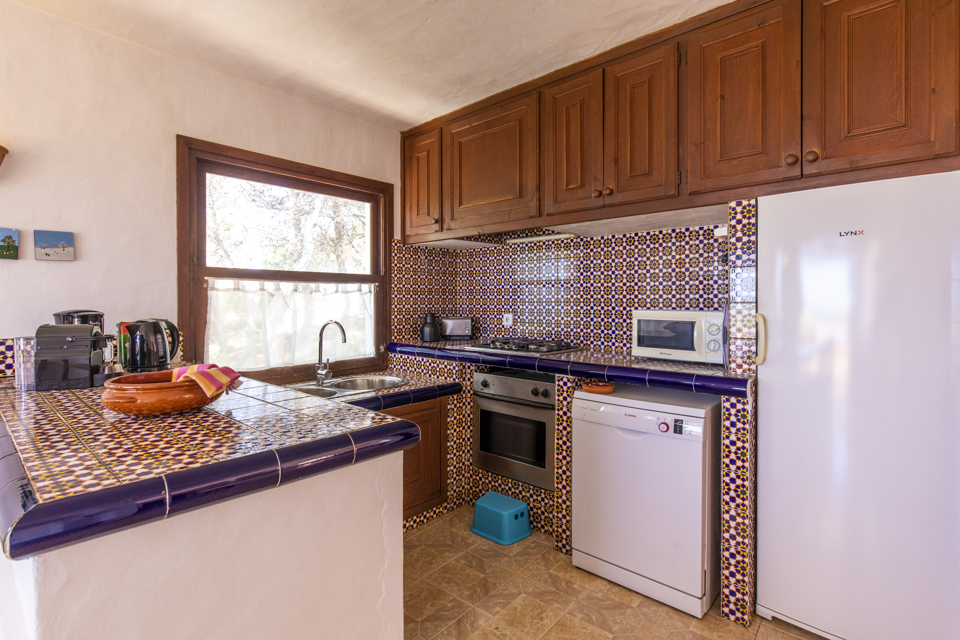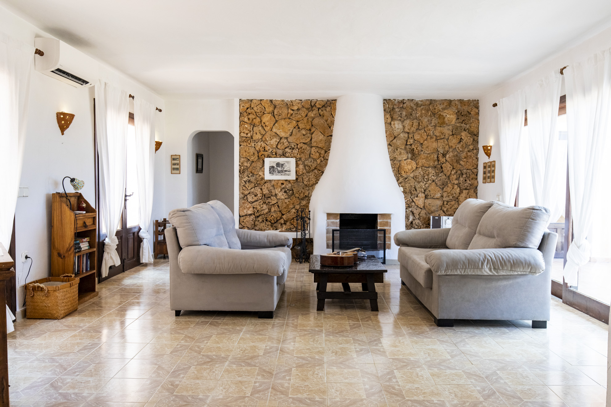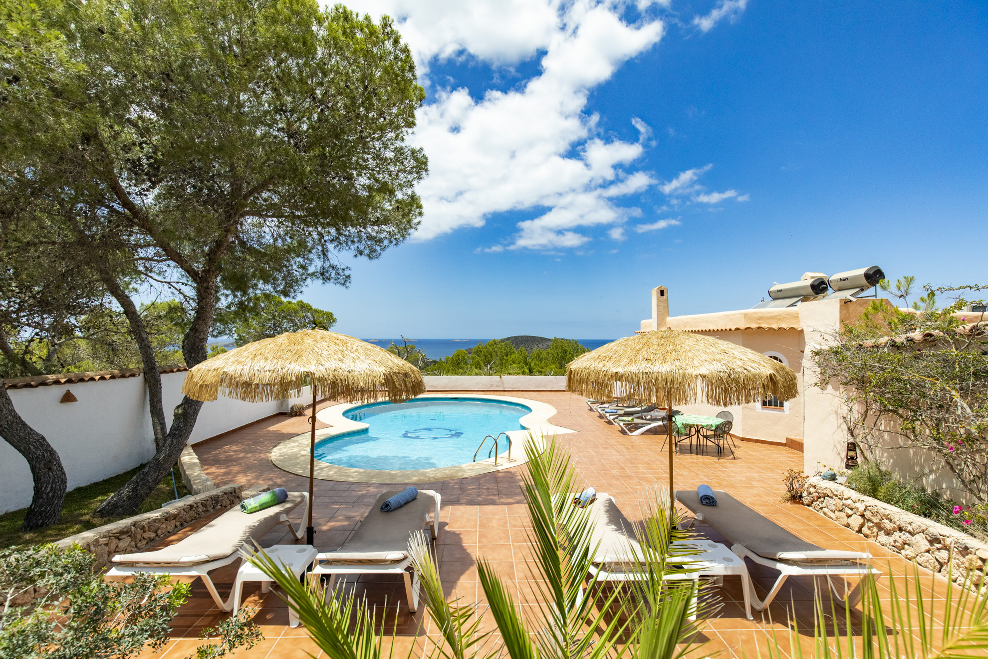 Nestled in the enchanting west part of the island, overlooking the picturesque shores of Cala Compte and Cala Conta, this villa offers an awe-inspiring panorama of untouched landscapes extending to the vast sea, all complemented by the legendary sunsets! A mere 15-minute leisurely stroll takes you to the beautiful beaches of Cala Compte and Cala Conta, making it easily accessible on foot. This retro-inspired villa, situated on an expansive 16,500m² seafront plot, beckons relaxation on its spacious pool terrace featuring a BBQ, a quaint outdoor kitchen, an alfresco shower, and a covered patio with a dining area.