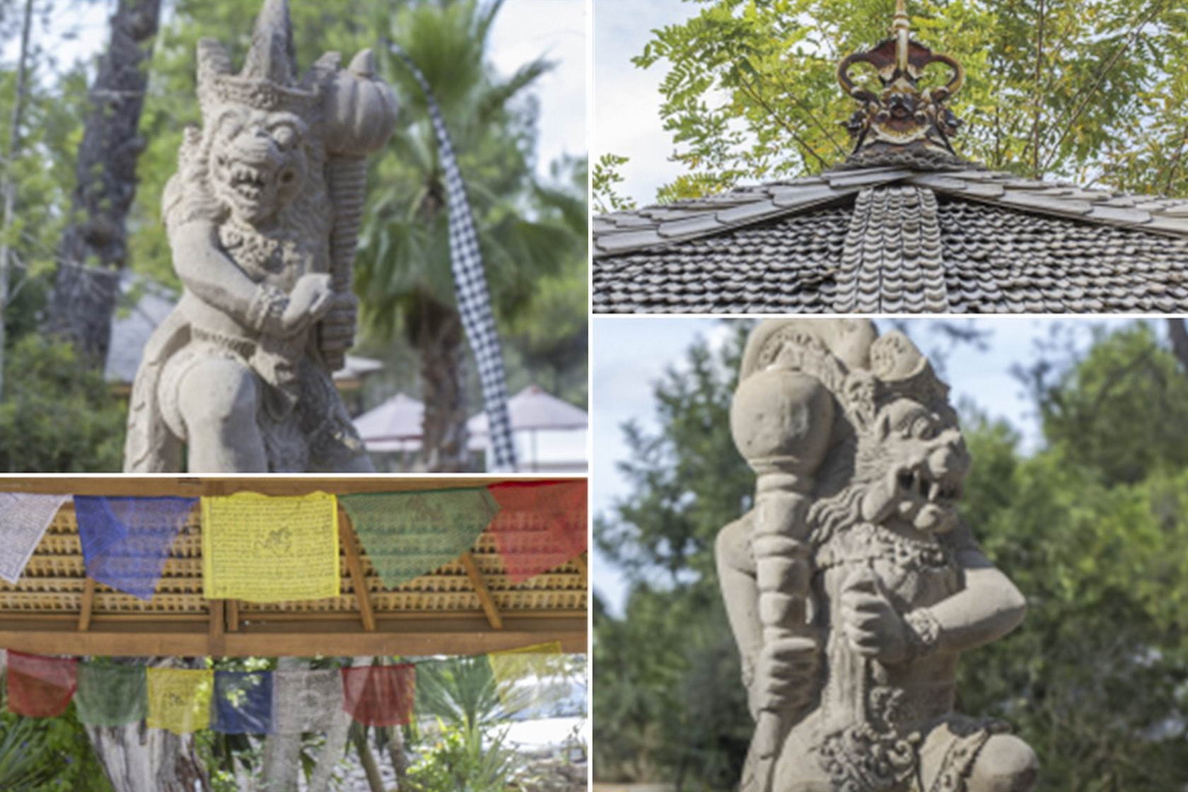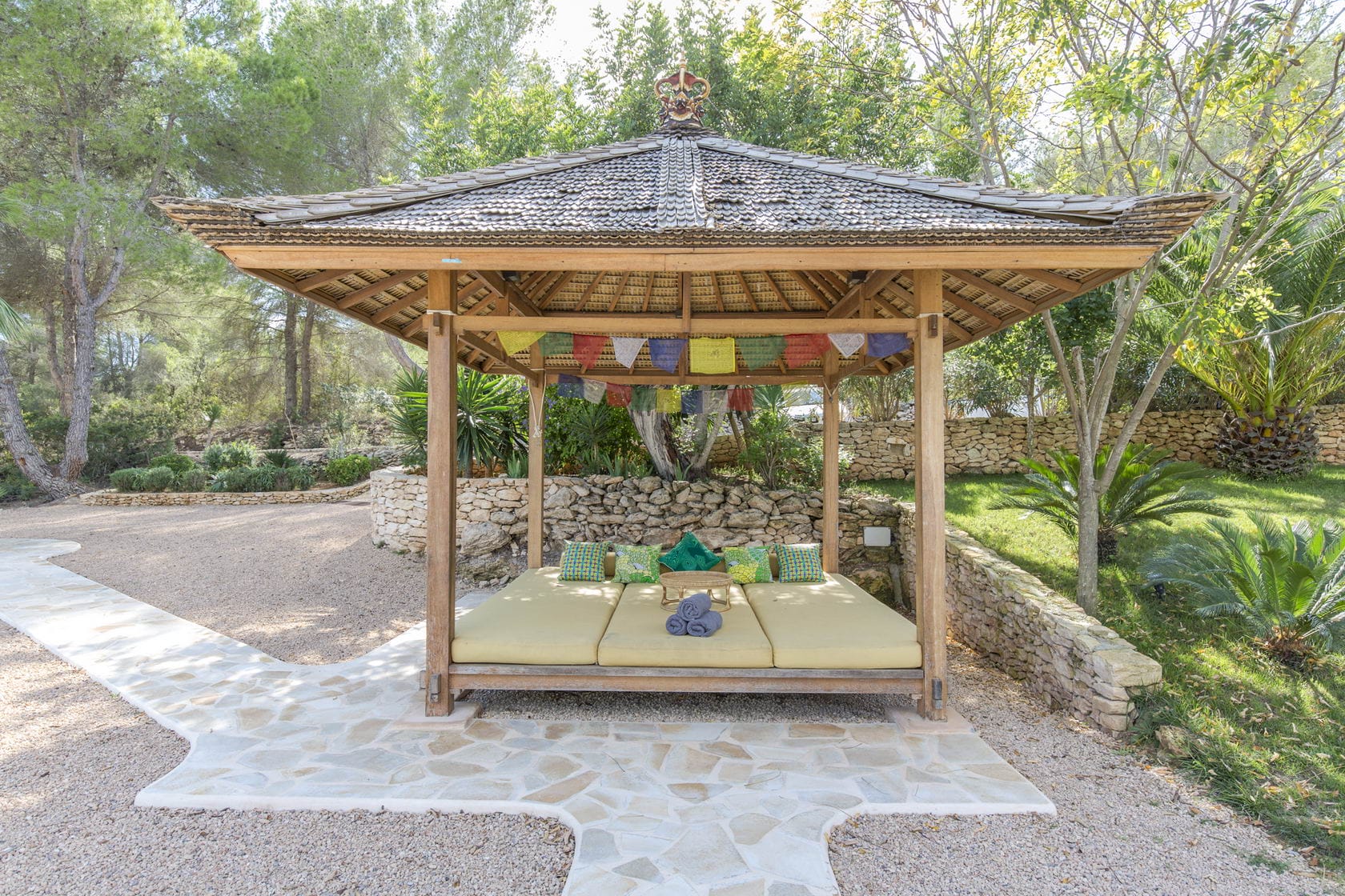 Outdoor highlights include an exclusive swimming pool (heatable for €350/week), diverse chill-out terraces, Balinese beds, a pergola with dining for 10-12, two gazebos, a Zen meditation garden, playground, and a full bathroom by the pool.
