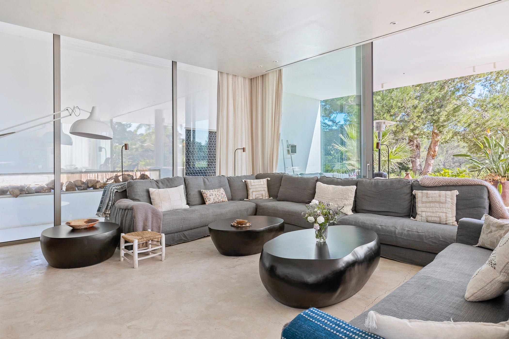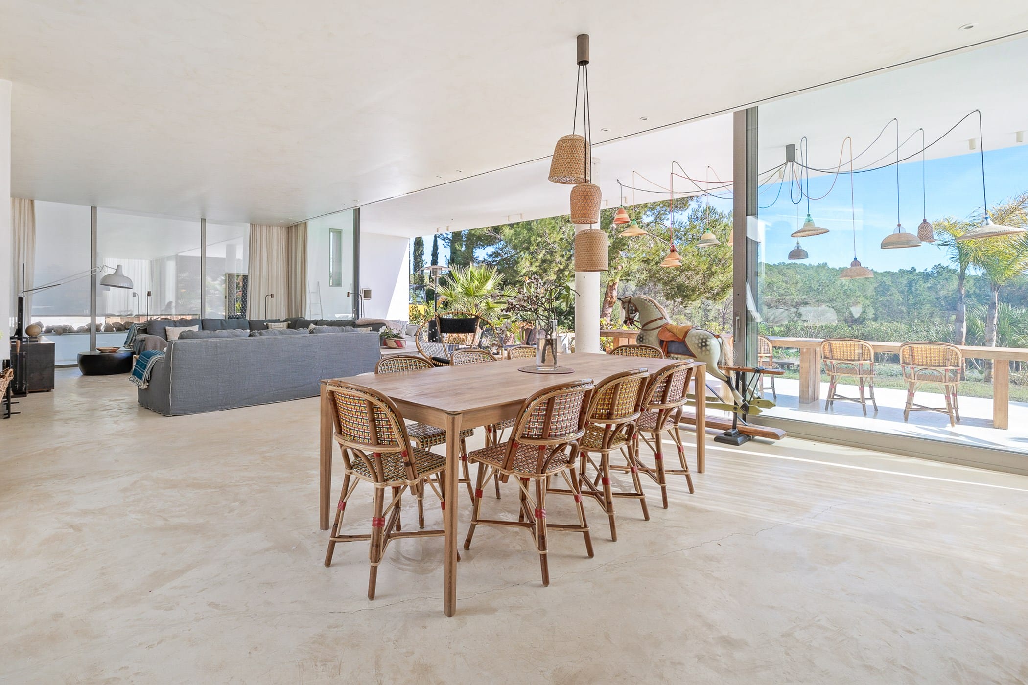 This stunning 6-bedroom villa is nestled in the picturesque countryside of Ibiza, surrounded by lush greenery and offering breathtaking rural views.