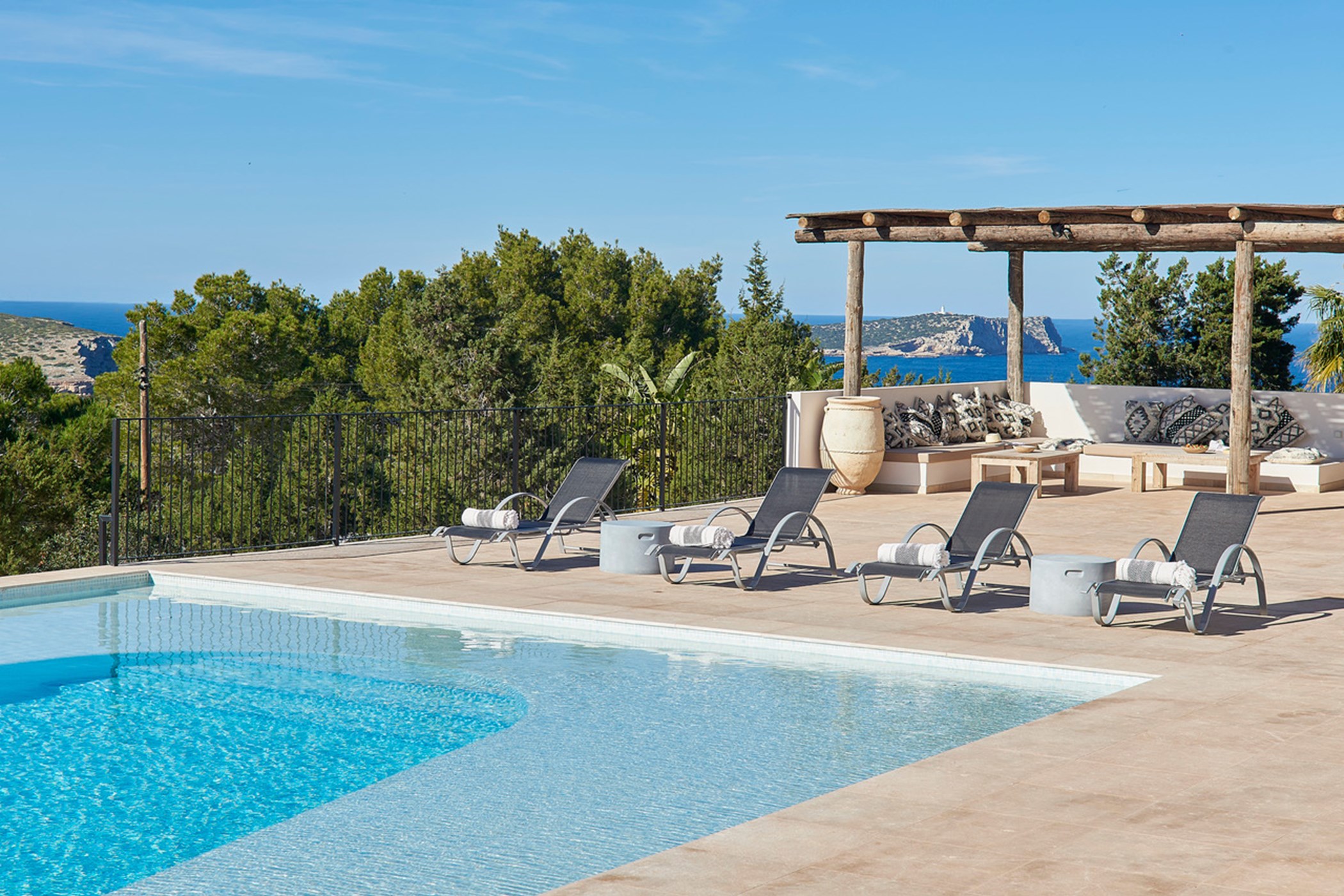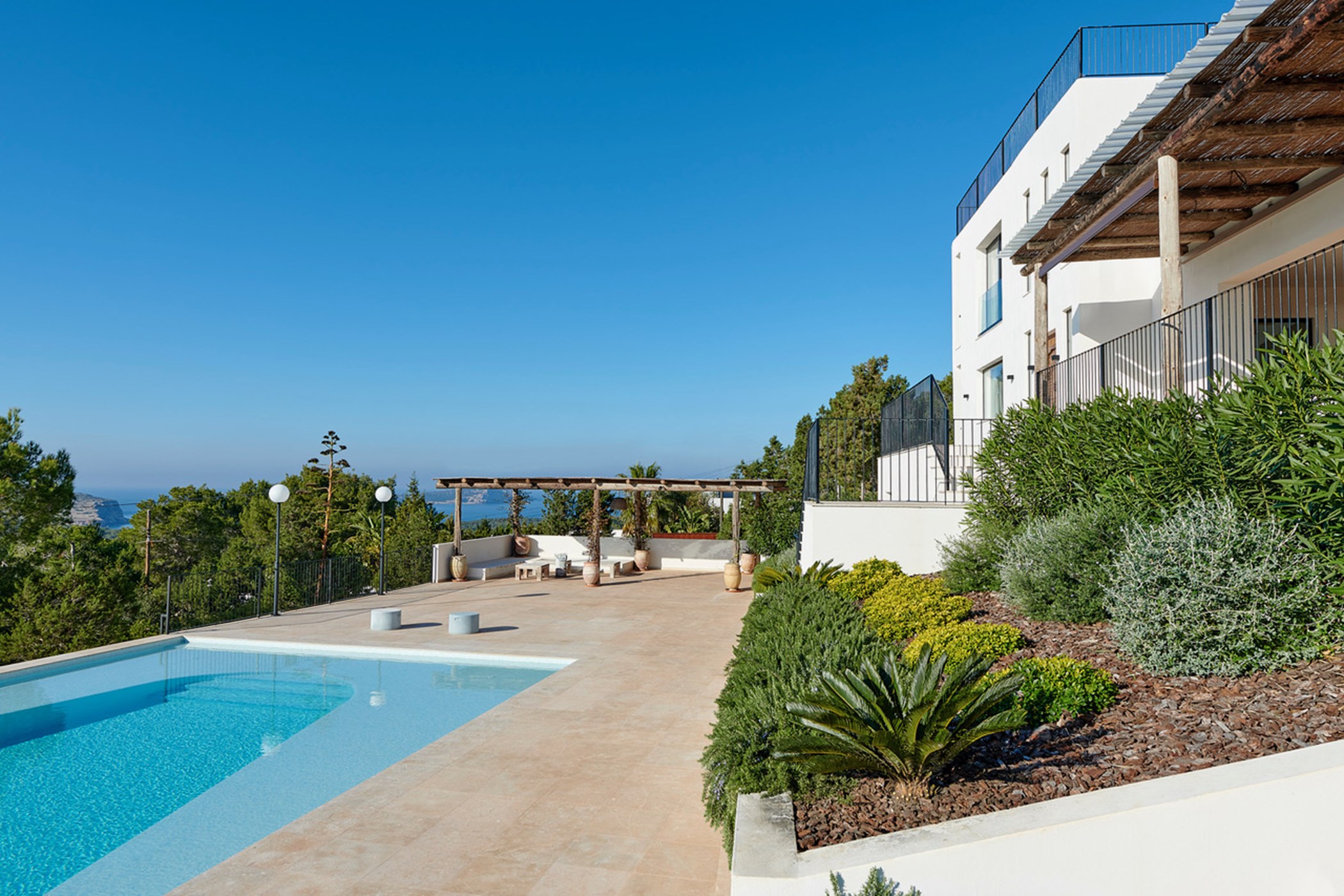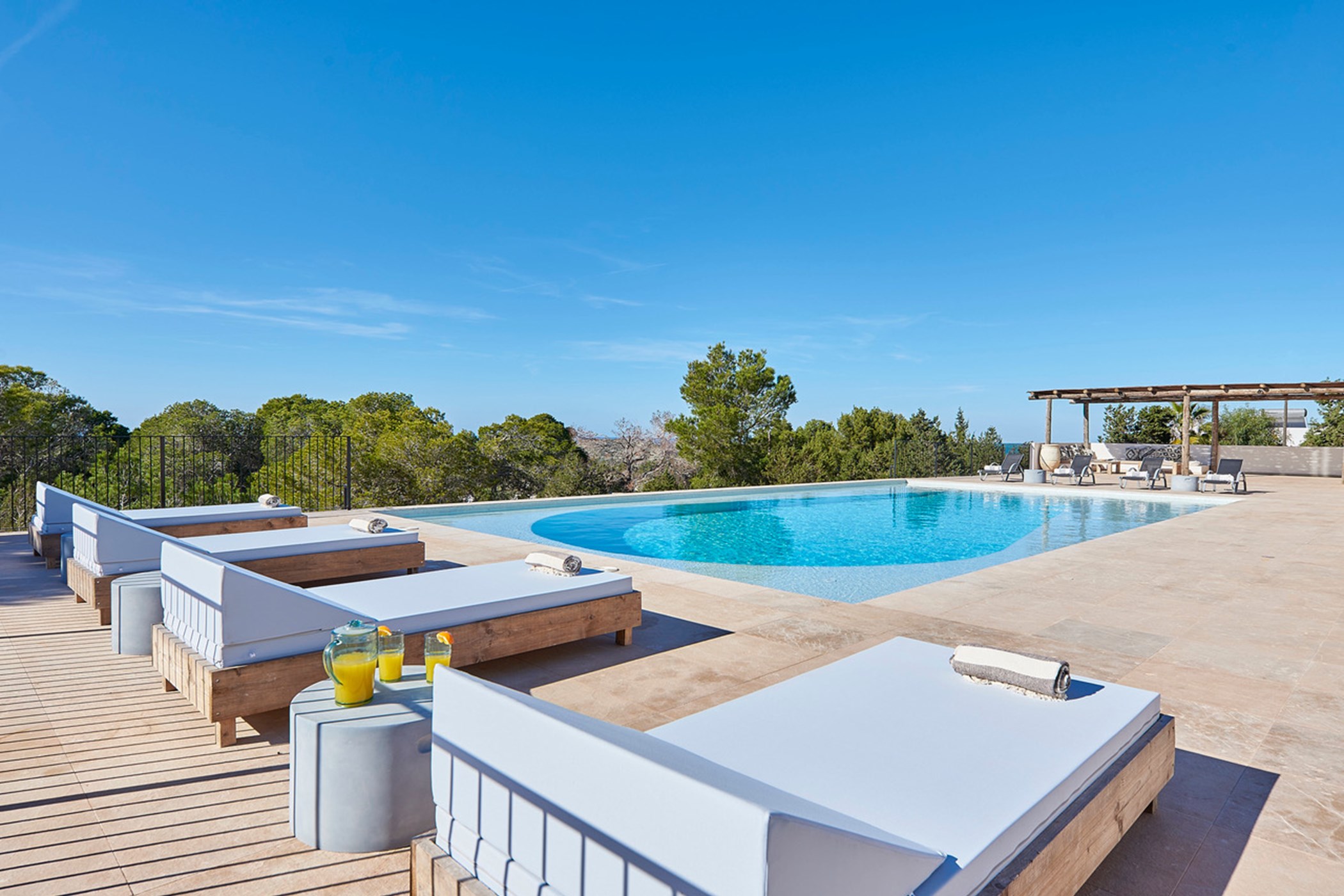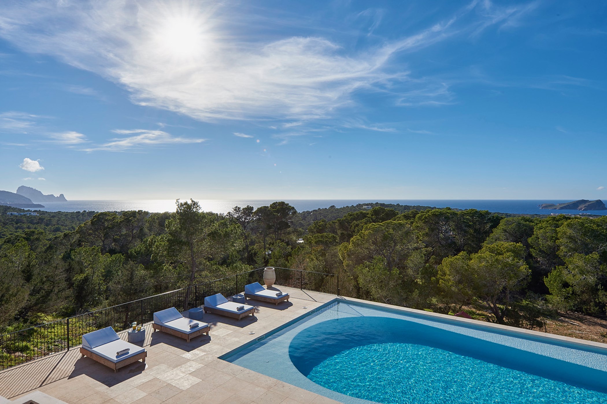 This hillside luxury villa in Ibiza is surrounded by pine forests and offers superb sea views across the southwest coastline, with a short drive to the beautiful beaches of Cala Conta.